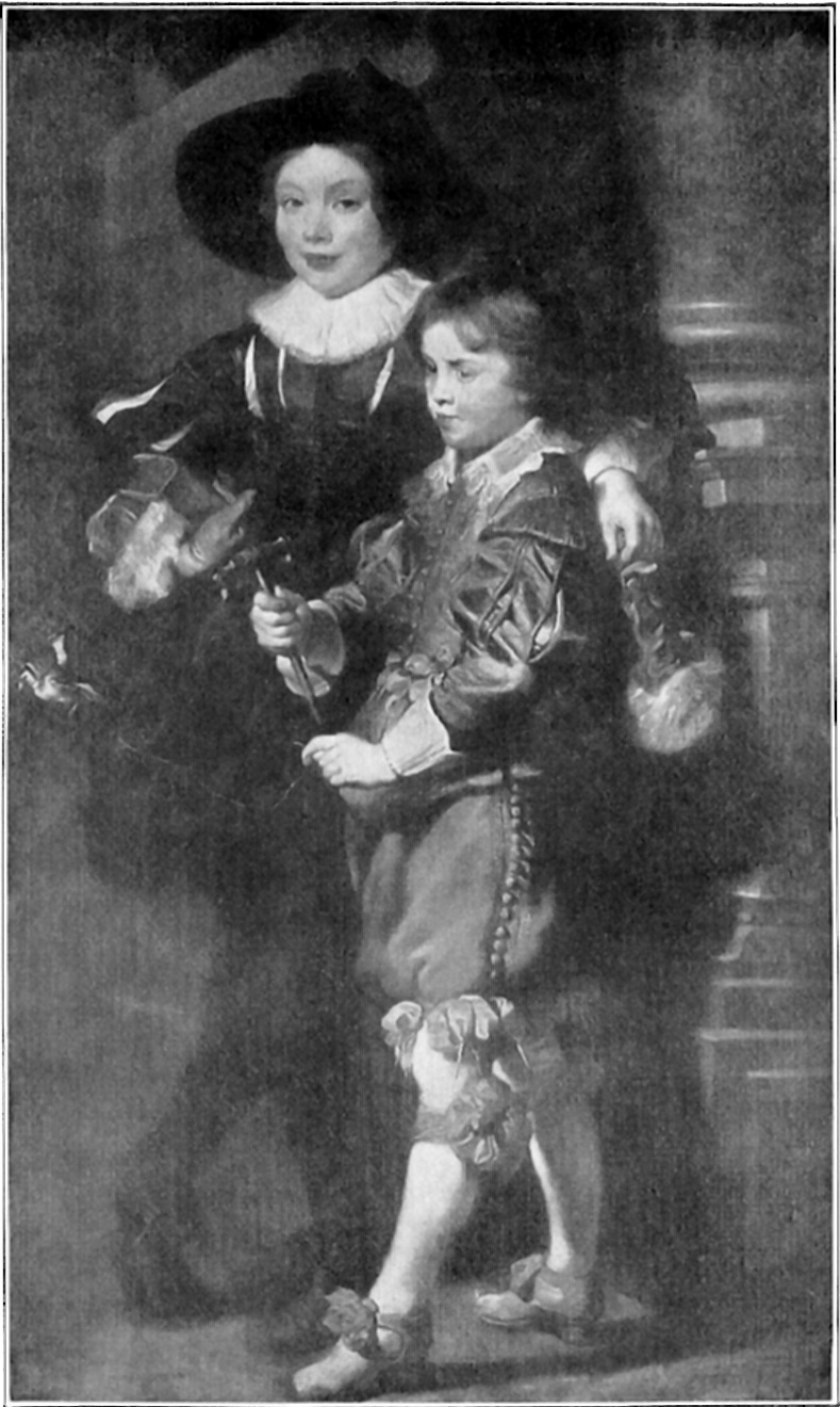 Rubens delighted in painting rich velvets, brocades, silks, and satins, and especially in representing his wife and their children in beautiful clothes. In this picture he has certainly satisfied that desire, for the boys are dressed in most elaborate costumes even for that day, and especially so if we compare them with the simple dark suits of boys of the same age to-day. Nicholas’s suit is of gray and blue, with puffs of yellow satin, rosettes below his knees and on his shoes, lace collar and cuffs, and innumerable little buttons. Albert wears black satin slashed with white, white ruched collars and cuffs, and a soft black felt hat. At a glance we would judge them to be the sons of a gentleman, well brought up, healthy, happy, and manly.