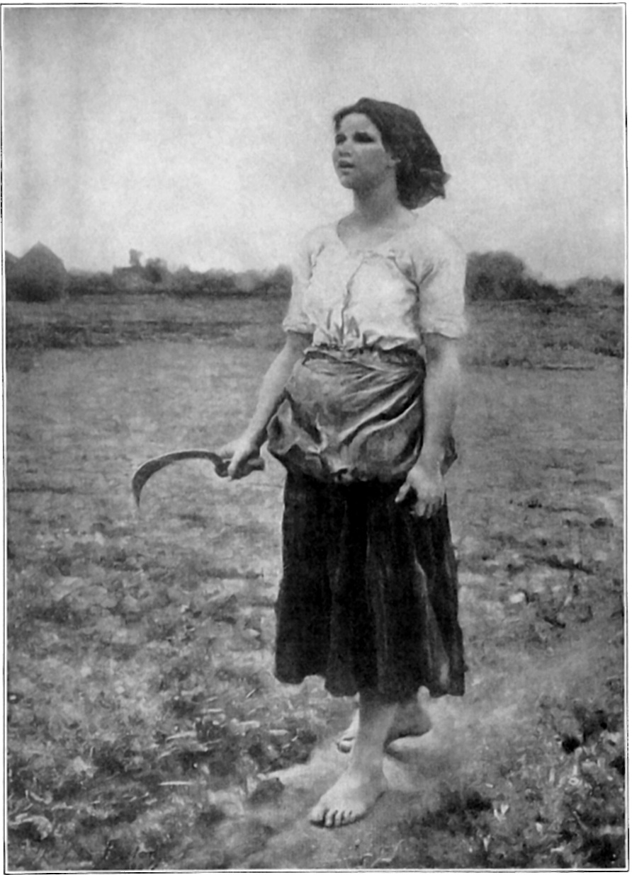 This sturdy, healthy peasant girl, sickle in hand, is going forth to her work in the fields. She walks along briskly in the narrow path, her head thrown back, breathing in the fresh morning air, when suddenly her little friend, the lark, gives her the morning greeting. As we look at her we do not feel that this is the first time she has heard his sweet song, but rather that it is something she has learned to look and listen for each morning as she starts out to her day’s work.