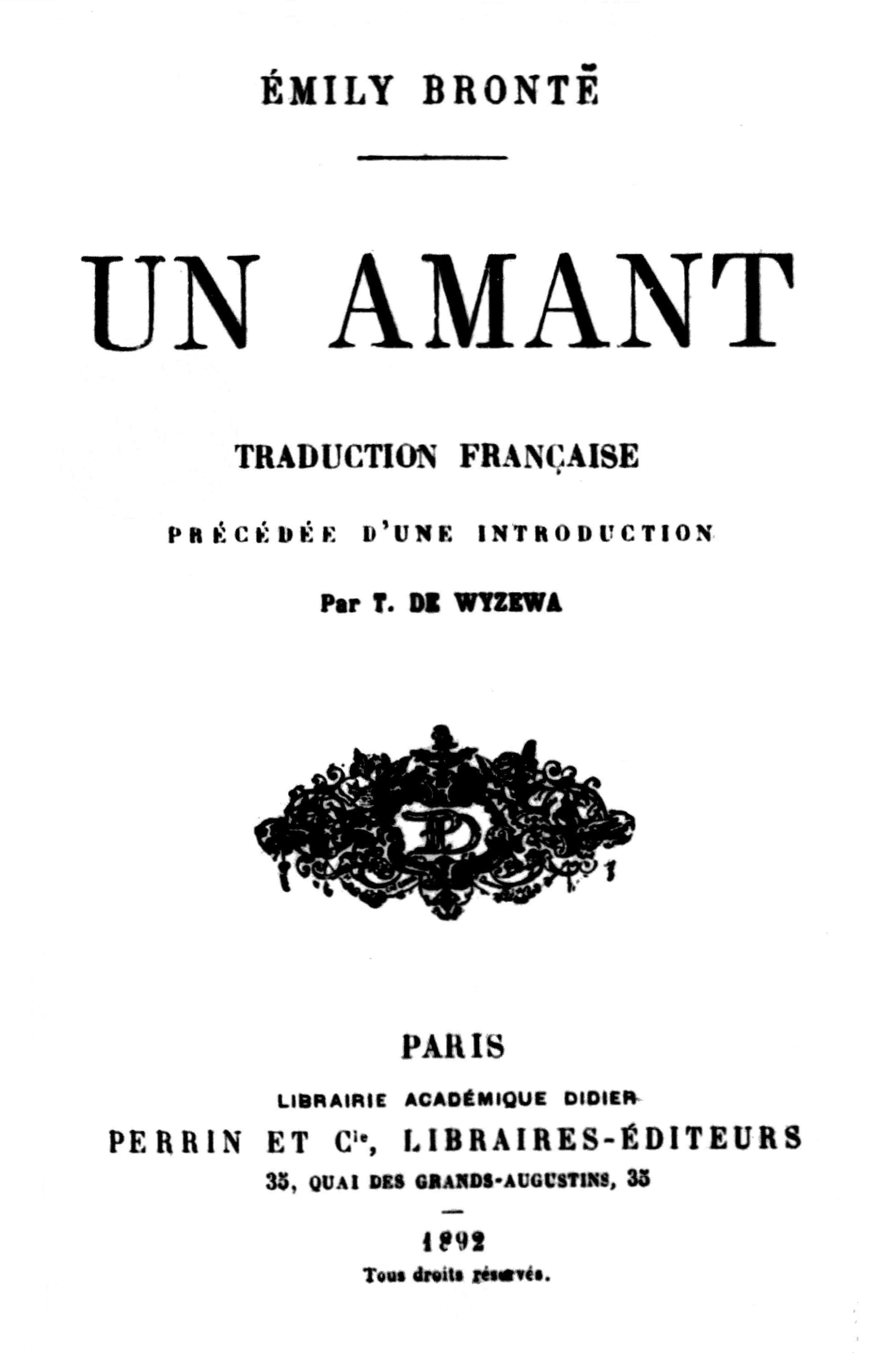 The Project Gutenberg EBook of Un amant, by Emily Brontë This eBook is for the use of anyone anywhere at no cost and with almost no restrictions whatsoever. You may copy it, give it away or re-use it under the terms of the Project Gutenberg License included with this eBook or online at www.gutenberg.org/license Title: Un amant Author: Emily Brontë Translator: Teodor de Wyzewa Release Date: September 13, 2020 [EBook #63193] Language: French Character set encoding: UTF-8 *** START OF THIS PROJECT GUTENBERG EBOOK UN AMANT *** Produced by Laura Natal Rodrigues at Free Literature (Images generously made available by Gallica, Bibliothèque nationale de France.)