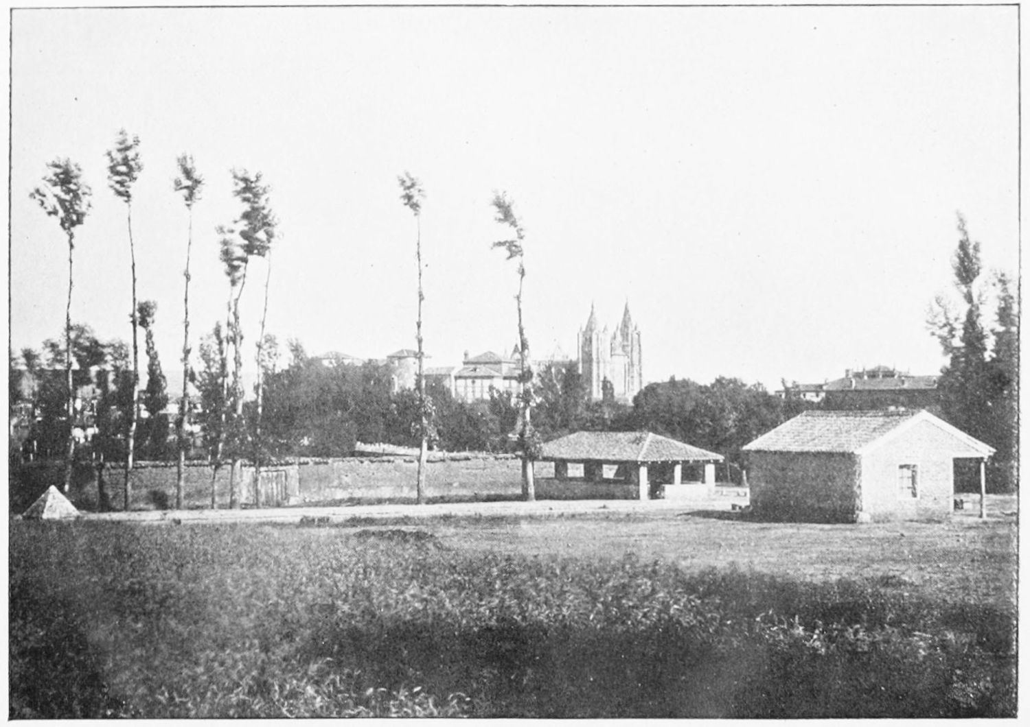 Where the cathedral now stands were the Roman baths, which are said to have been converted into a castle or palace by the kings of Asturias. The building was utterly destroyed by Al Mansûr, and on its site arose the basilica of Ordoño II. The royal residence then seems to have been situated near where the monastery of San Salvador del Palaz del Rey was built by Ramiro II. (930-950). Another palace occupied the square in front of the church of San Isidoro. Rebuilt by Berenguela, the mother of San Fernando, it was pulled down in the time of Isabel the Catholic. It was no doubt from this building that Count Garcia passed to his death in the opposite church.