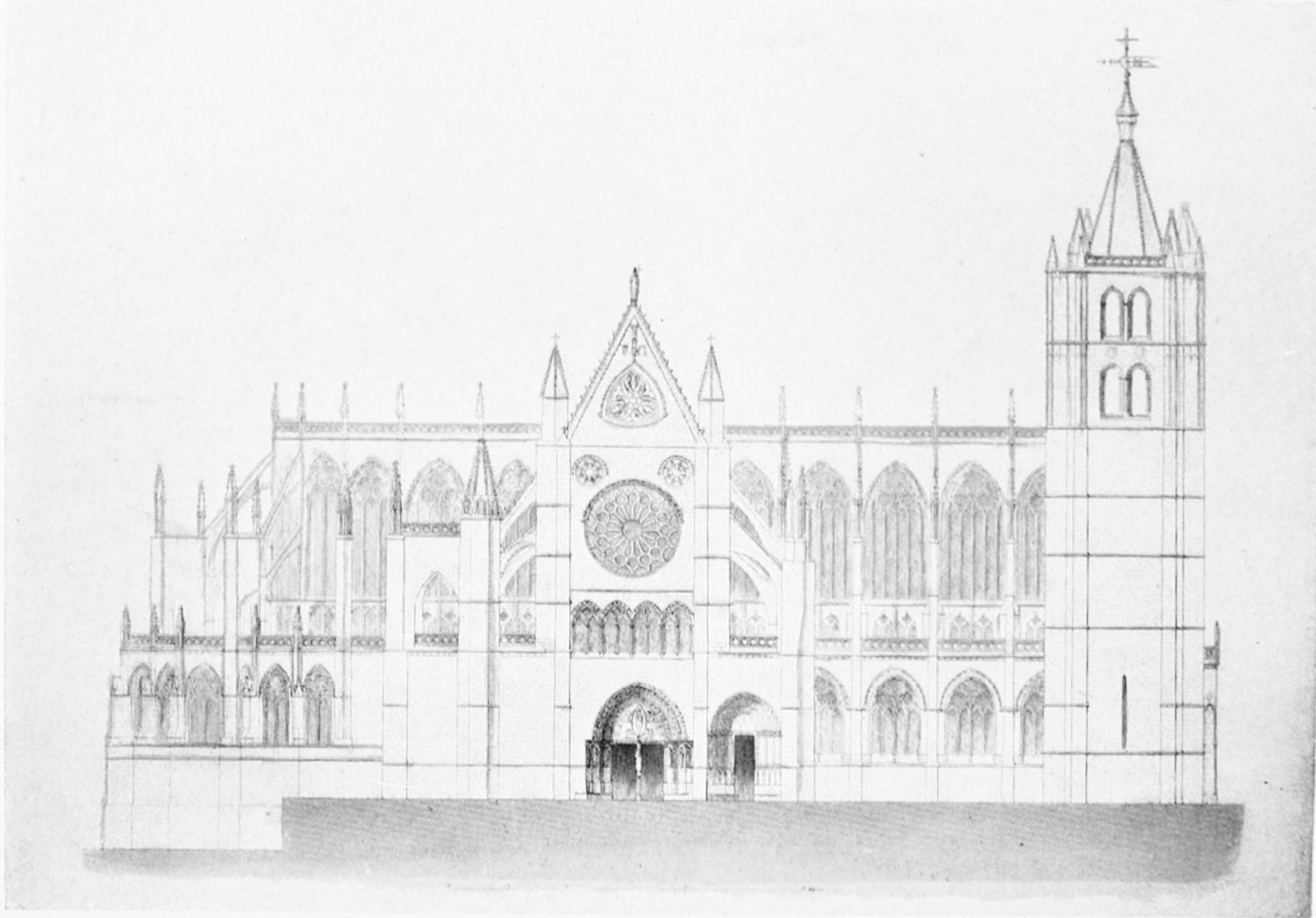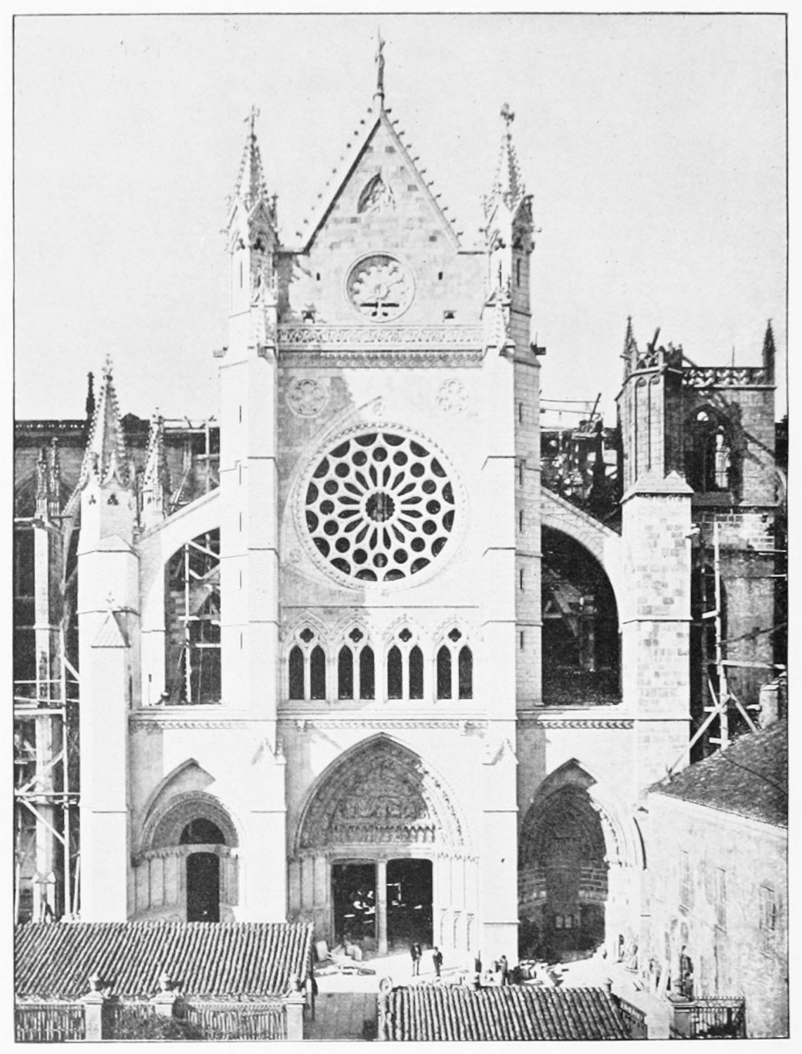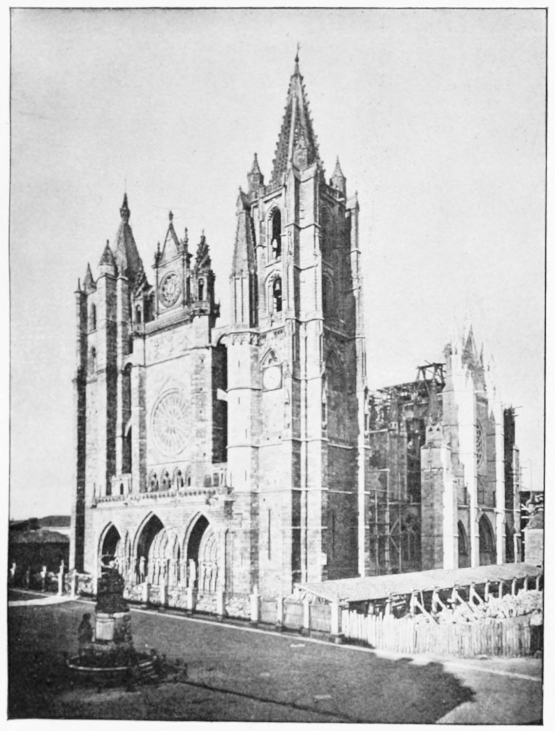 This beautiful cathedral—pulchra Leonina—occupies the site of the basilica of Ordoño II. (of which no trace remains). Planned about the first years of the reign of San Fernando, it was not completed in 1258, when an episcopal congress was held at Madrid to discuss the progress of the works and to grant an indulgence of forty days to the faithful who should assist with alms.{16} In 1303 the Bishop Gonzalez proclaimed that the work was done, ‘thanks be to God.’