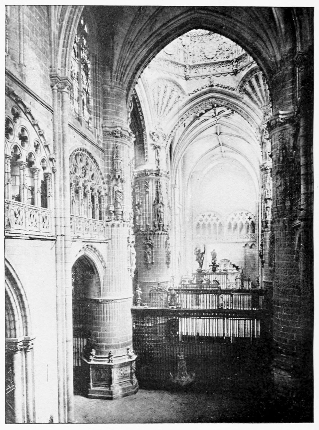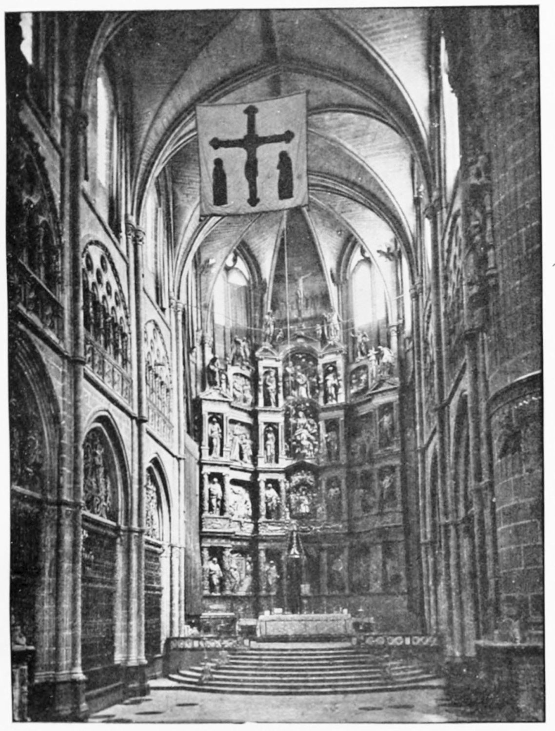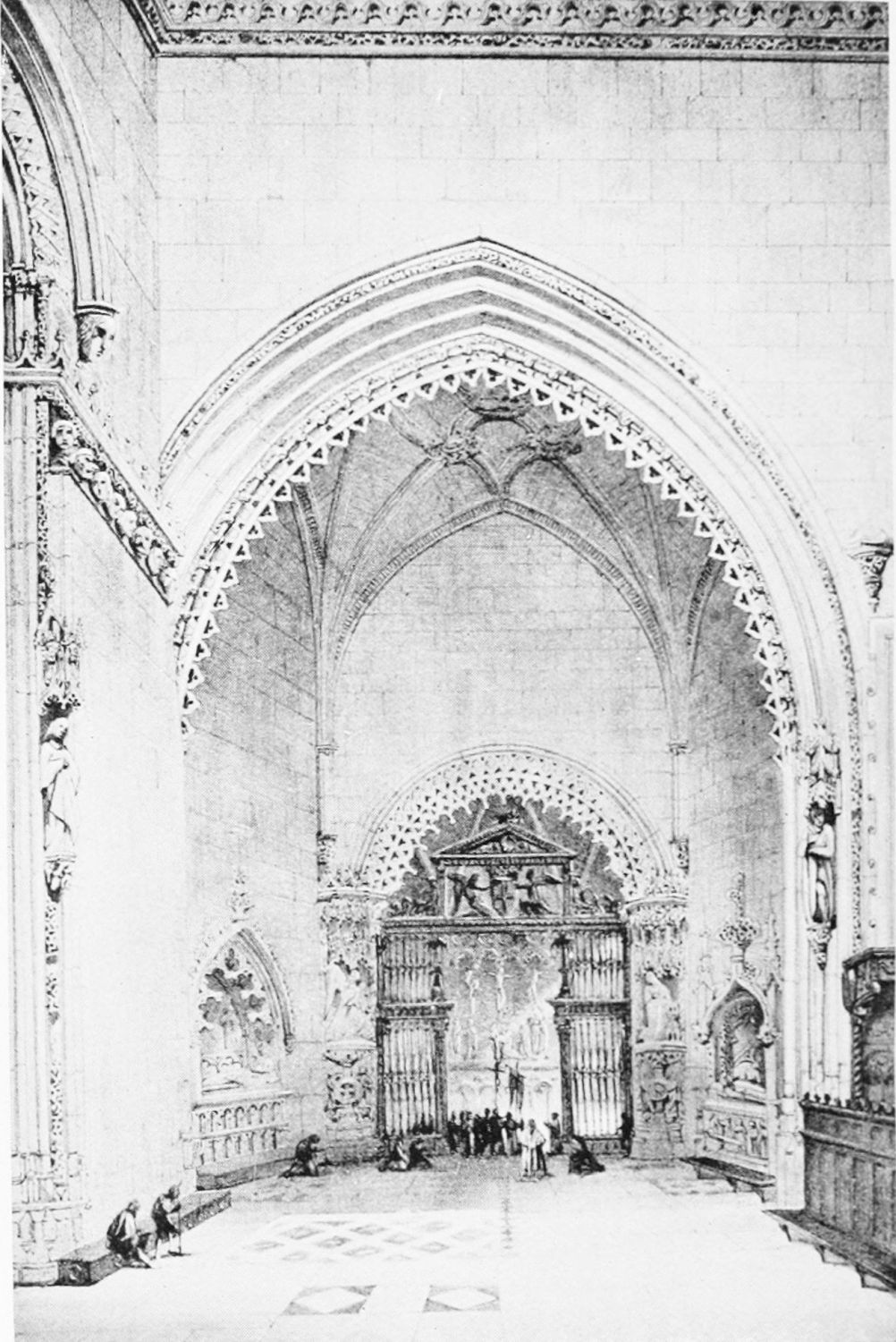 The beauty of this wonderful church consists largely in its lightness. Its supports are so slender, its walls so freely pierced with windows at every stage, its details everywhere so delicate, that the term ‘frozen music’ applied to architecture seems here indeed no mere hyperbole. ‘A mere lantern,’ Street calls the church, and blames the architect for his extreme daring and for his excessive use of windows. Though the vaults had been filled in with very light stone or concrete, the fabric was ever trembling on its fragile foundations. In 1631 the vault above the crossing collapsed, and was replaced by a dome. A hundred years later many of the arches of the aisles succumbed. Meanwhile Renaissance and Churrigueresque additions were made; but the whole was restored between the years 1850 and 1901, and now the cathedral exists in almost pristine symmetry and airiness.