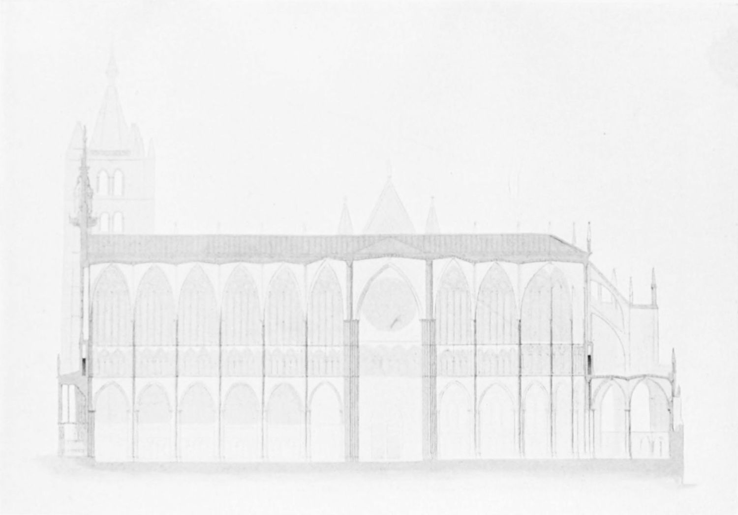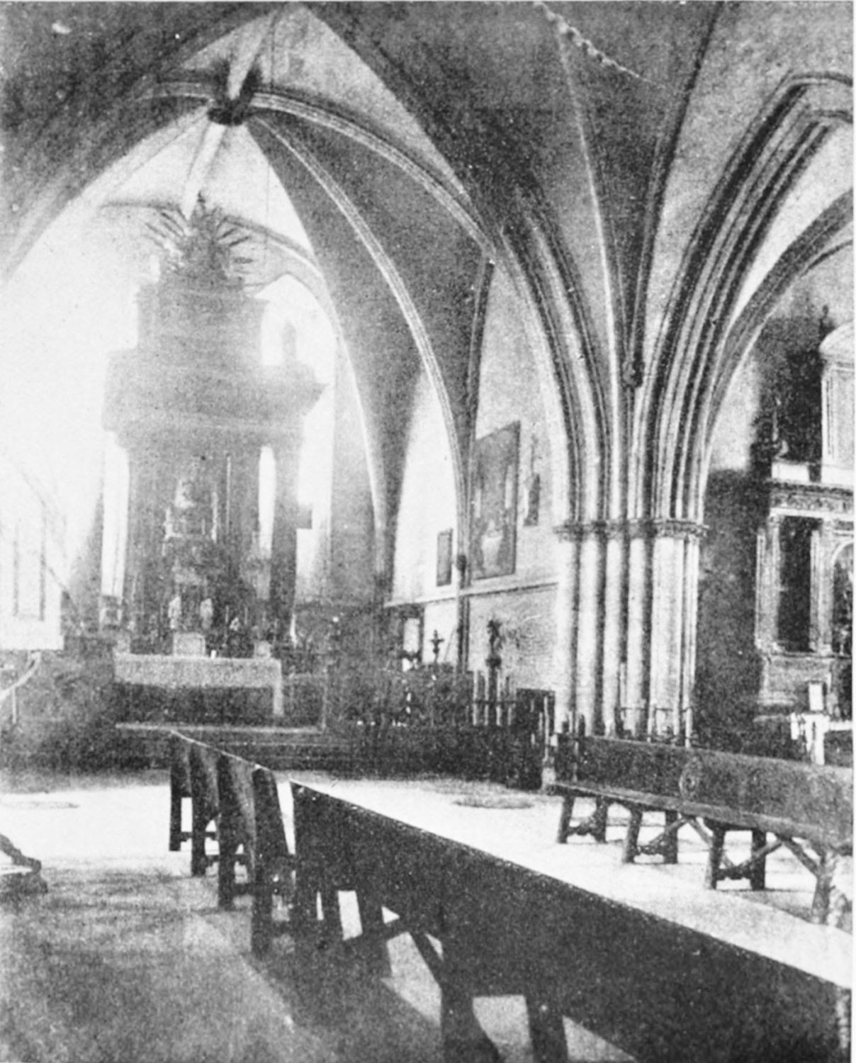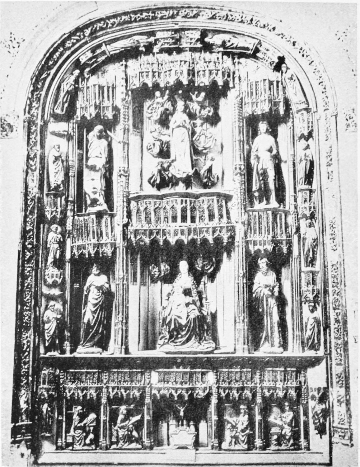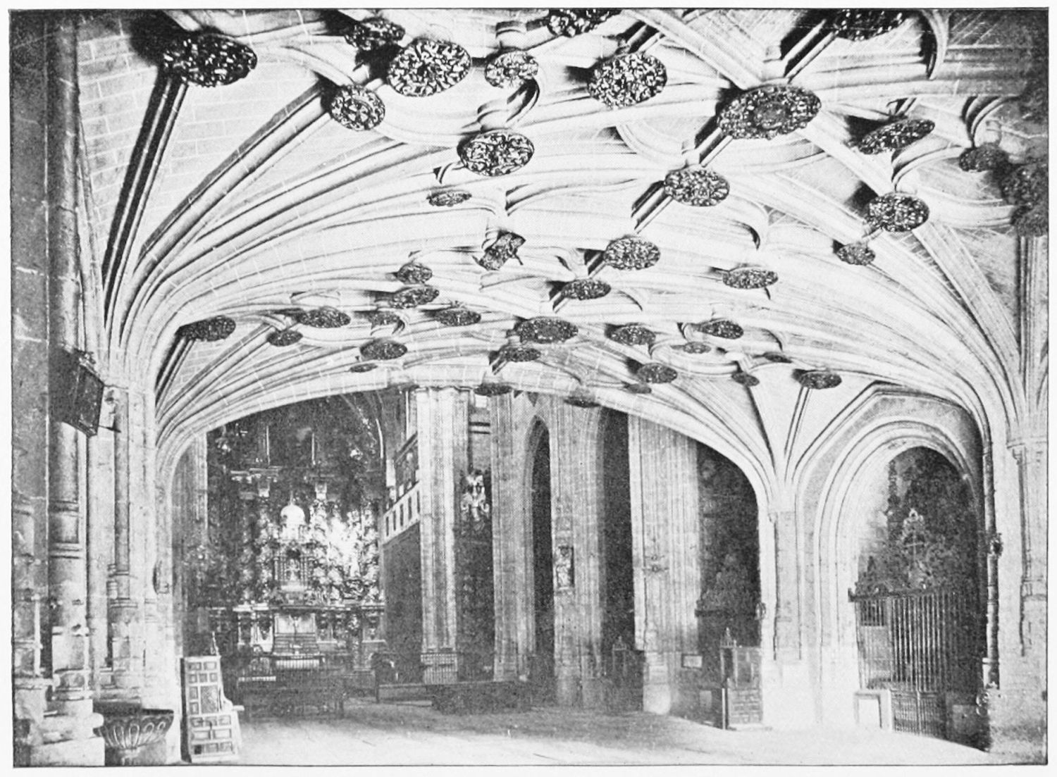 The beauty of this wonderful church consists largely in its lightness. Its supports are so slender, its walls so freely pierced with windows at every stage, its details everywhere so delicate, that the term ‘frozen music’ applied to architecture seems here indeed no mere hyperbole. ‘A mere lantern,’ Street calls the church, and blames the architect for his extreme daring and for his excessive use of windows. Though the vaults had been filled in with very light stone or concrete, the fabric was ever trembling on its fragile foundations. In 1631 the vault above the crossing collapsed, and was replaced by a dome. A hundred years later many of the arches of the aisles succumbed. Meanwhile Renaissance and Churrigueresque additions were made; but the whole was restored between the years 1850 and 1901, and now the cathedral exists in almost pristine symmetry and airiness.