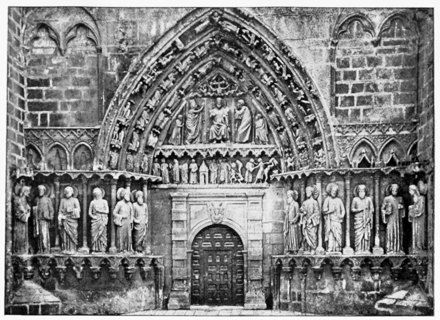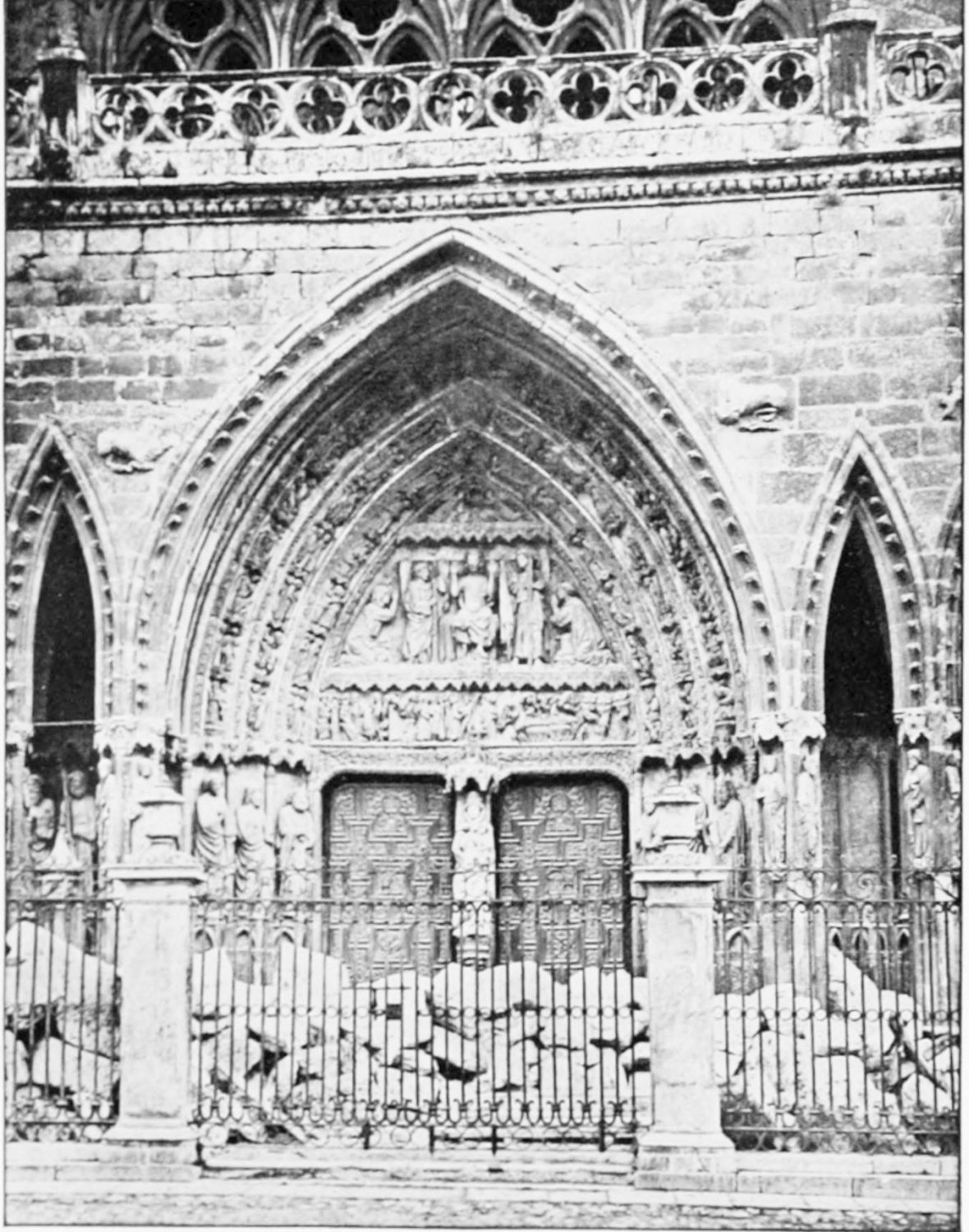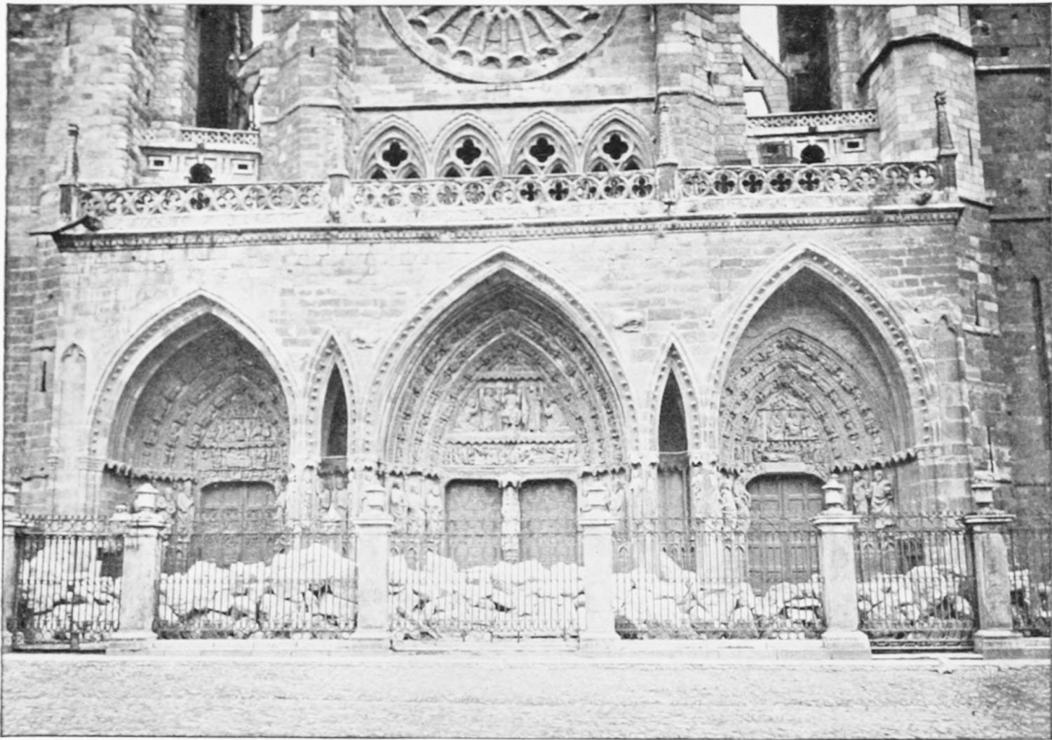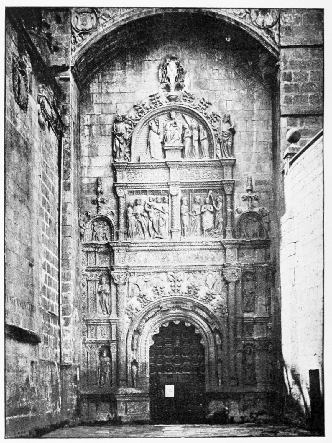 The façade between these steeples is very beautiful. It is surmounted by a pediment with ‘acroteria’ or pedestals to receive statues. Beneath this is a very large wheel-window above a row of windows corresponding to the triforium. The three magnificently sculptured doorways extend from steeple to steeple. The arches are pointed and triple. Byzantine influence is visible in the statuary and foliage. The figures, forty in number, are rather more than life-size, and represent saints and apostles, martyrs and confessors, kings and queens. On the north-west doorway is seen the half-defaced figure of Justice, bearing a sword inscribed with the words ‘Justitia est unicuique dare quod suum est.’ Beneath this{18} portal cases of appeal were tried in the thirteenth century. A small column between this and the central doorway is engraved with the words locus appellationis and the arms of Leon and Castile. The tympanum of the arch is adorned with reliefs, illustrating the earlier episodes in the life of Jesus. The doors themselves show scenes from the Passion and Risen Life.