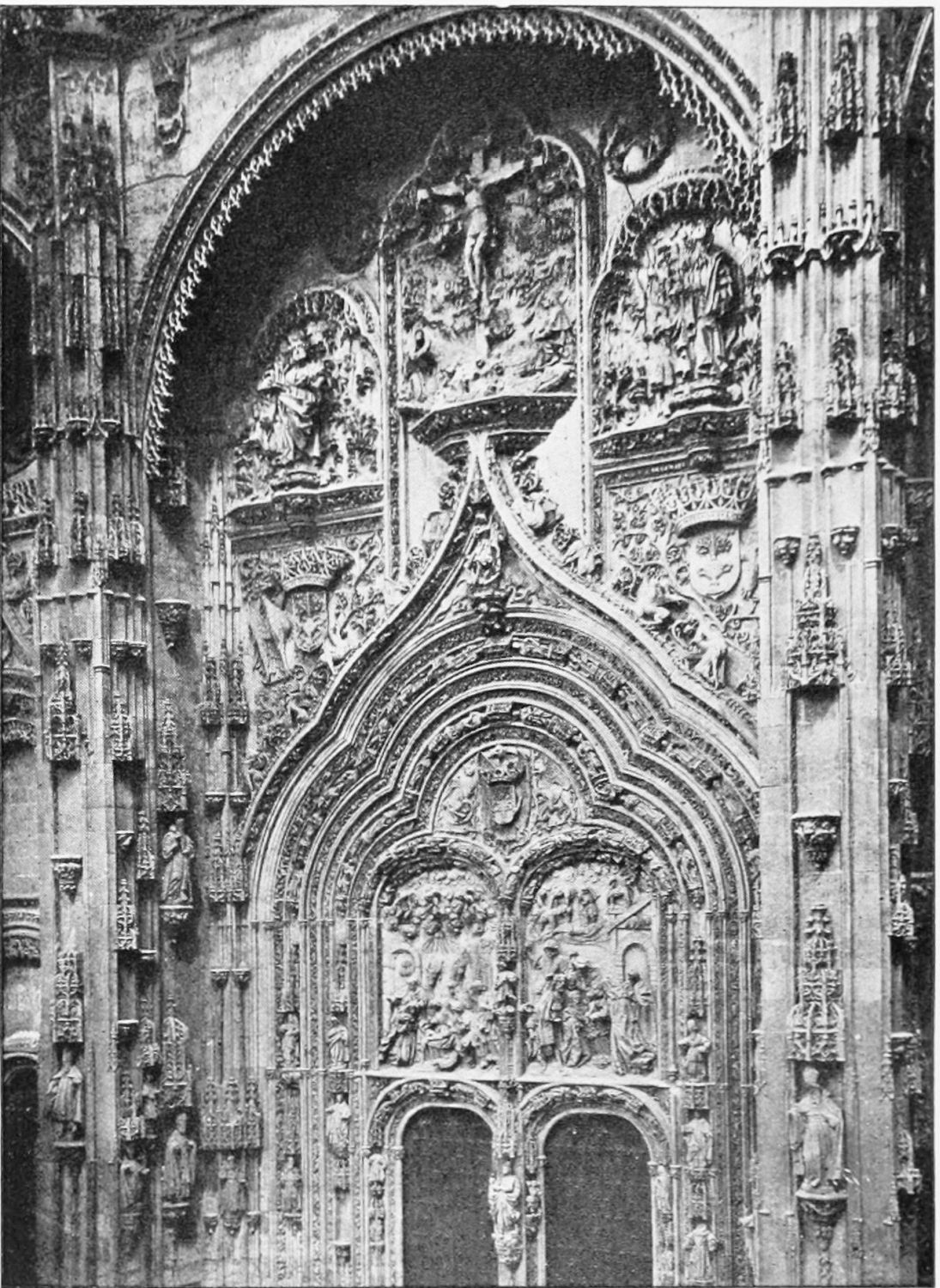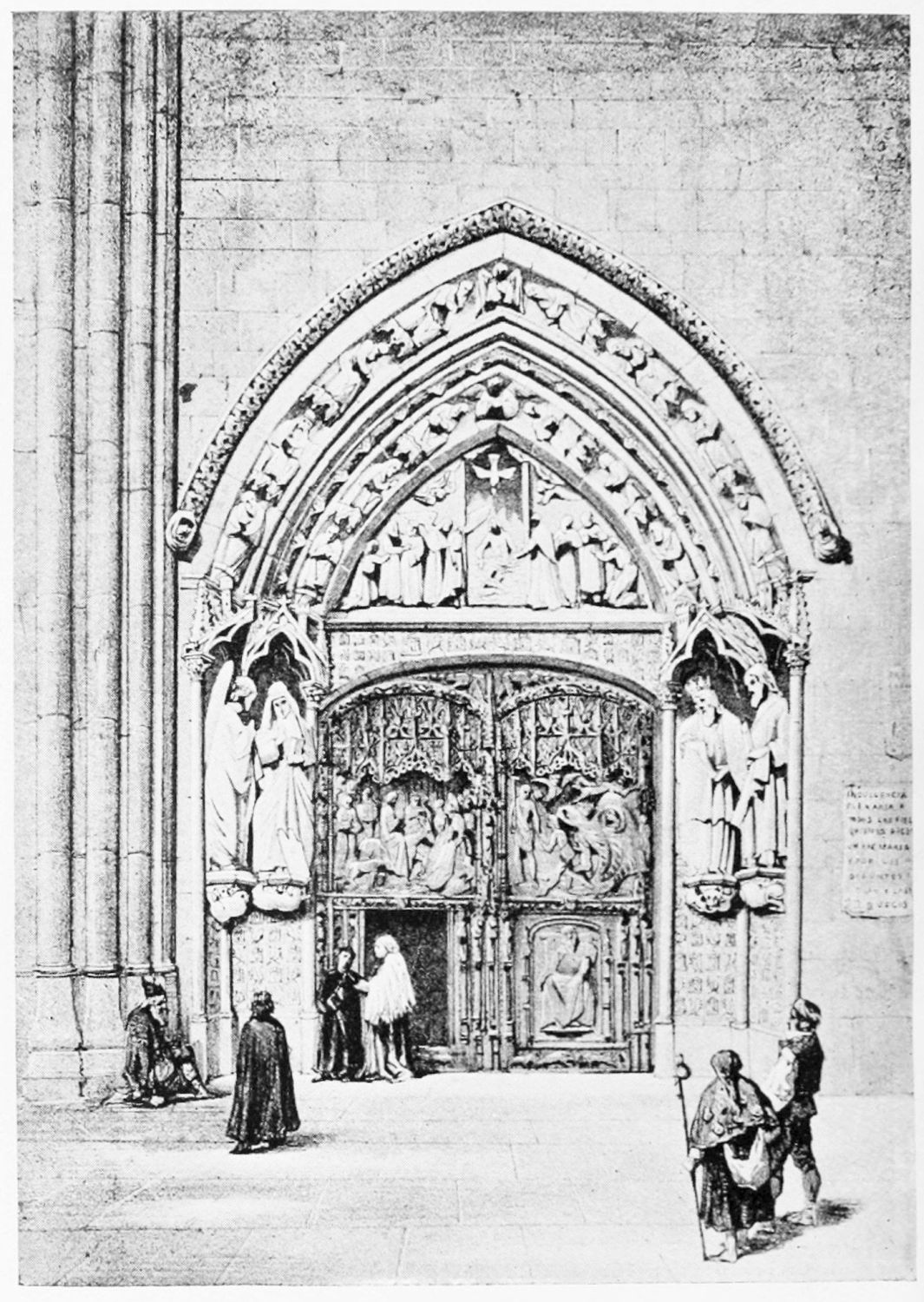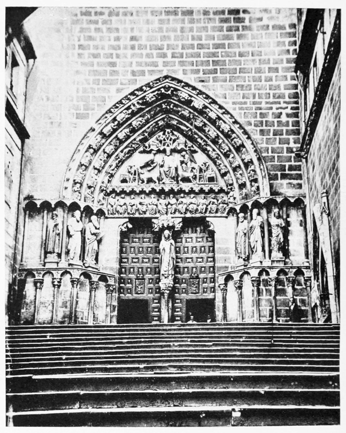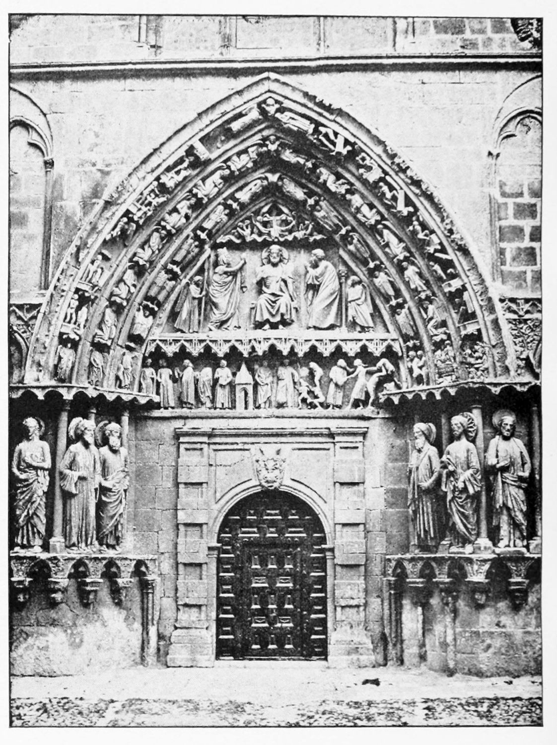 The façade between these steeples is very beautiful. It is surmounted by a pediment with ‘acroteria’ or pedestals to receive statues. Beneath this is a very large wheel-window above a row of windows corresponding to the triforium. The three magnificently sculptured doorways extend from steeple to steeple. The arches are pointed and triple. Byzantine influence is visible in the statuary and foliage. The figures, forty in number, are rather more than life-size, and represent saints and apostles, martyrs and confessors, kings and queens. On the north-west doorway is seen the half-defaced figure of Justice, bearing a sword inscribed with the words ‘Justitia est unicuique dare quod suum est.’ Beneath this{18} portal cases of appeal were tried in the thirteenth century. A small column between this and the central doorway is engraved with the words locus appellationis and the arms of Leon and Castile. The tympanum of the arch is adorned with reliefs, illustrating the earlier episodes in the life of Jesus. The doors themselves show scenes from the Passion and Risen Life.