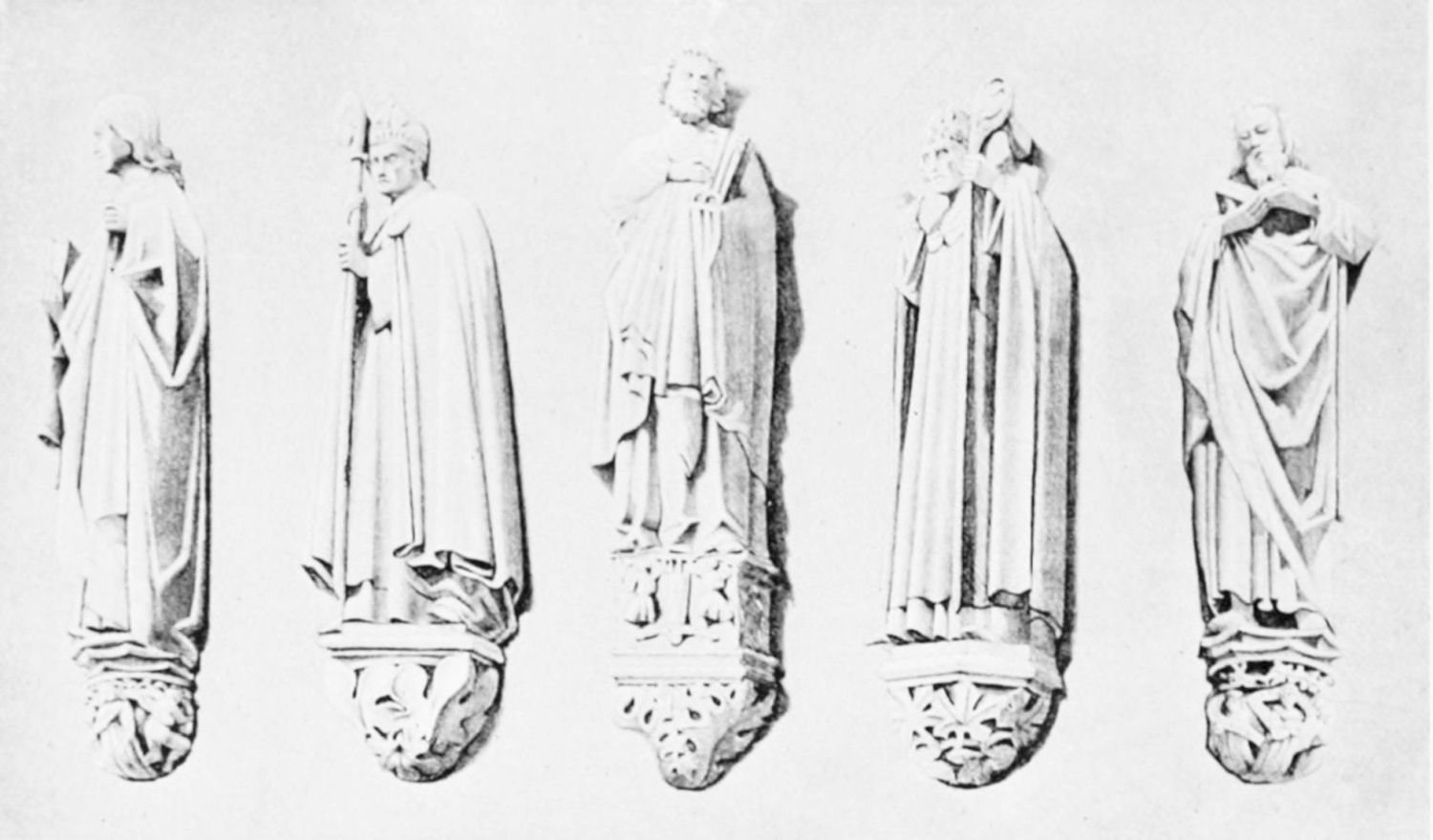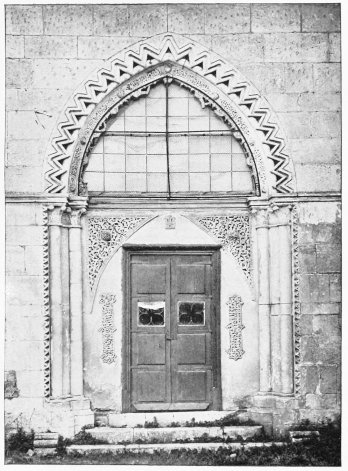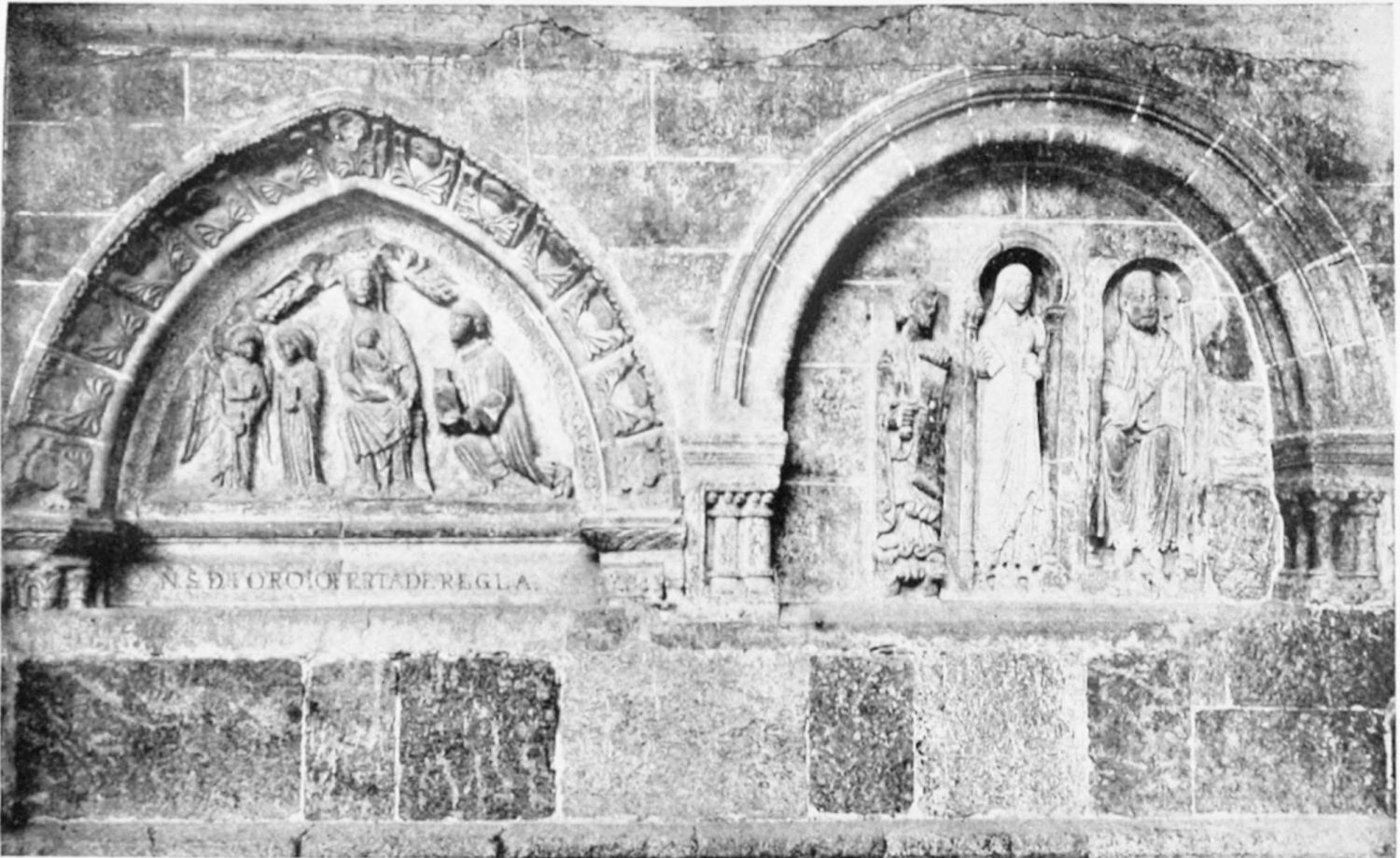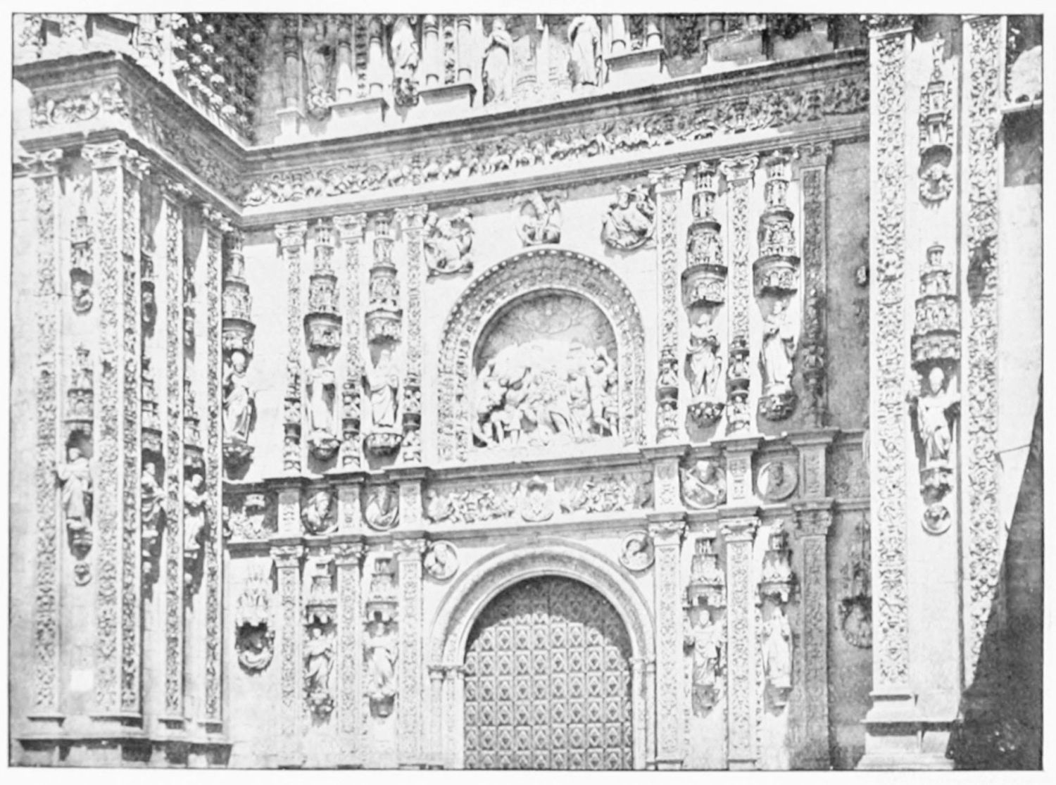 The façade between these steeples is very beautiful. It is surmounted by a pediment with ‘acroteria’ or pedestals to receive statues. Beneath this is a very large wheel-window above a row of windows corresponding to the triforium. The three magnificently sculptured doorways extend from steeple to steeple. The arches are pointed and triple. Byzantine influence is visible in the statuary and foliage. The figures, forty in number, are rather more than life-size, and represent saints and apostles, martyrs and confessors, kings and queens. On the north-west doorway is seen the half-defaced figure of Justice, bearing a sword inscribed with the words ‘Justitia est unicuique dare quod suum est.’ Beneath this{18} portal cases of appeal were tried in the thirteenth century. A small column between this and the central doorway is engraved with the words locus appellationis and the arms of Leon and Castile. The tympanum of the arch is adorned with reliefs, illustrating the earlier episodes in the life of Jesus. The doors themselves show scenes from the Passion and Risen Life.