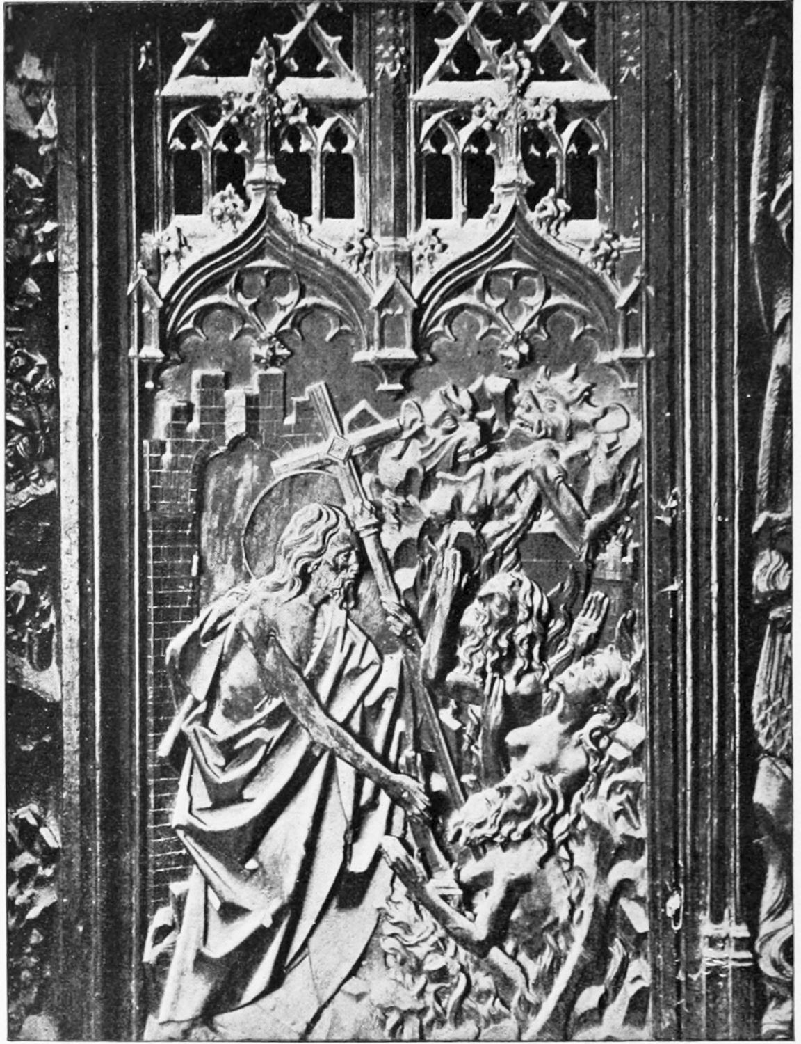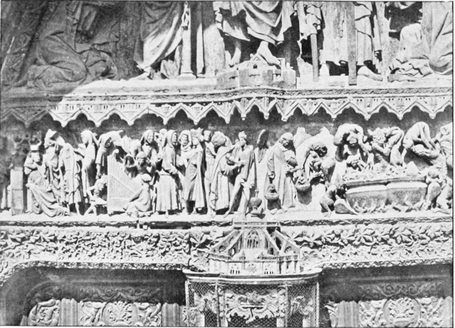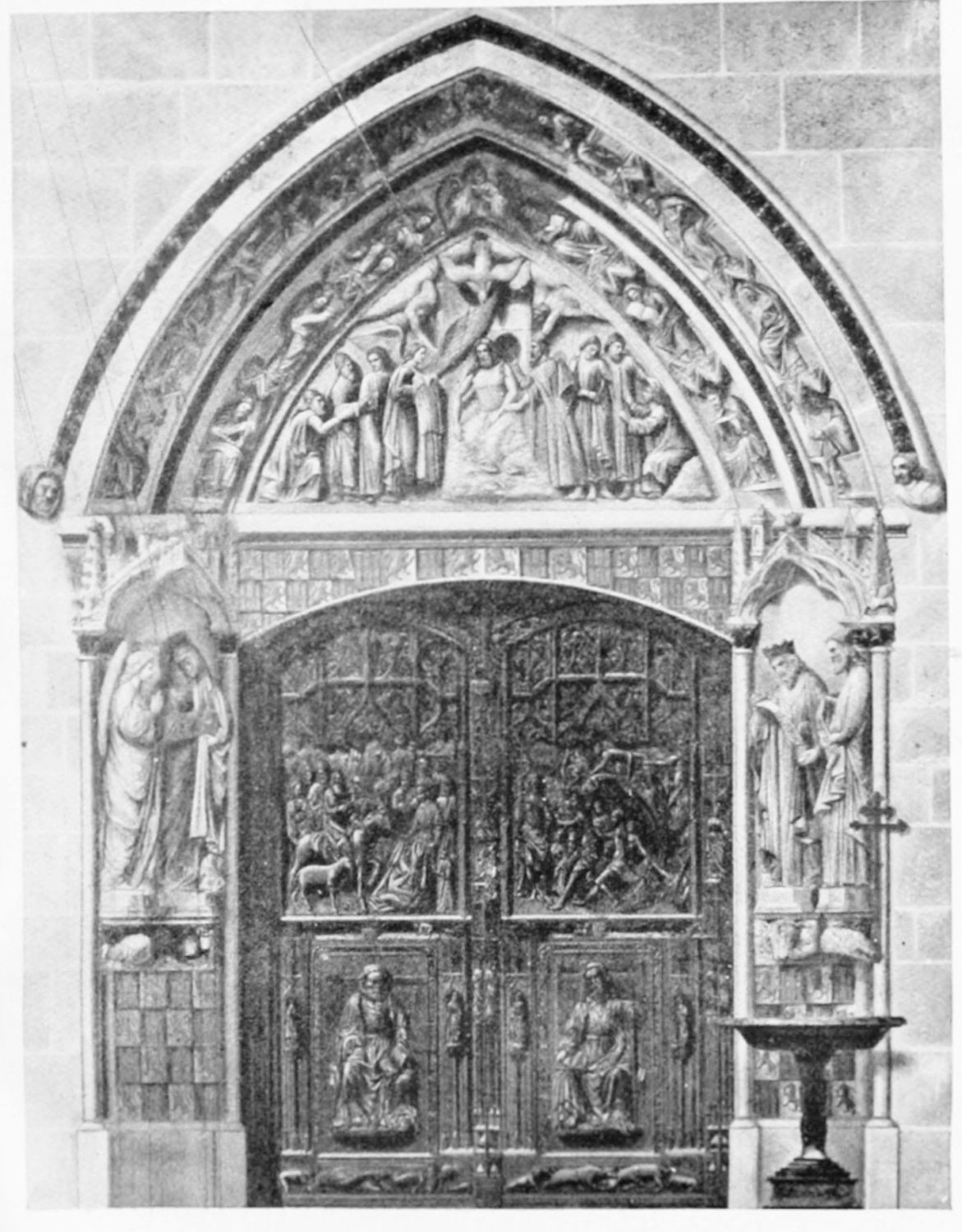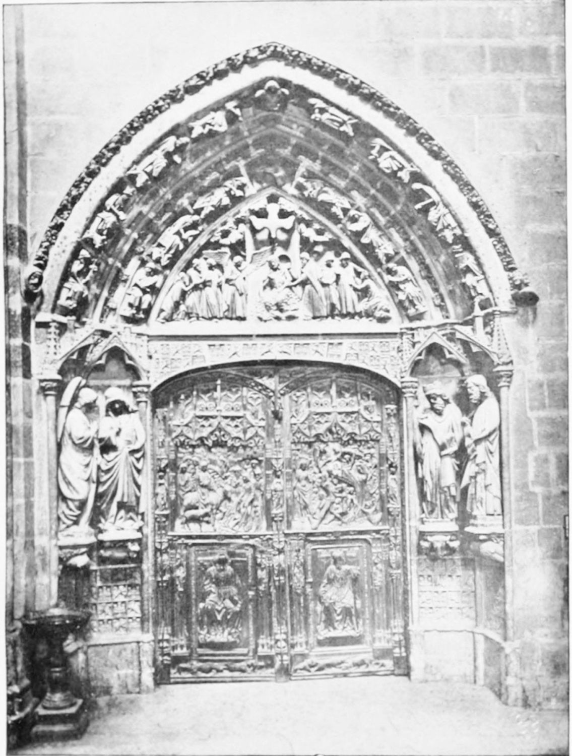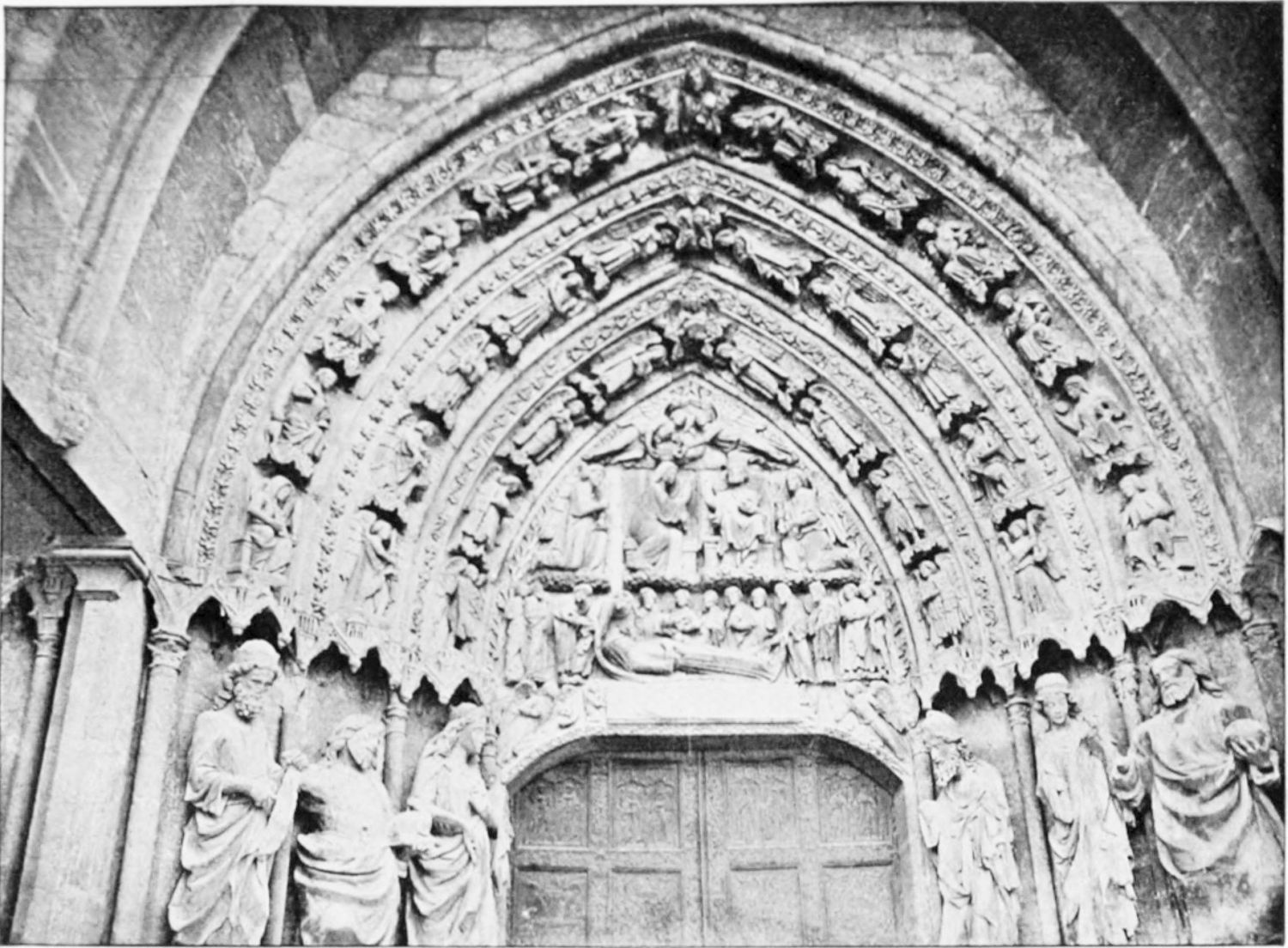 The central shaft of the middle door is disfigured with a dressed-up image of the Virgin enclosed in glass. The sculpture of the tympanum is spirited and elaborate. In a composition depicting the Last Judgment devils are seen stirring their fires and plunging the reprobate into seething cauldrons. On the side of the blessed a young man extracts cheering music from what is perhaps a harmonium. The attitudes of the just express the liveliest satisfaction, whereas a crowned personage, striding boldly into Paradise, is met and warned off by a celestial Janitor. The naïve and fantastically horrible are curiously blended in this skilful work. The southern doorway is the least interesting of the three; the subjects of the reliefs are the death and coronation of the Virgin.