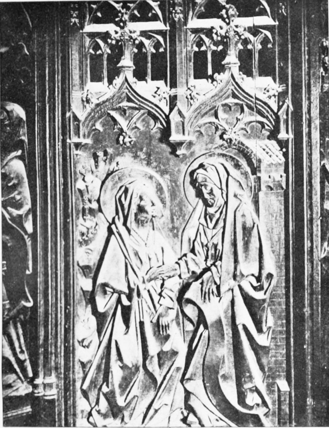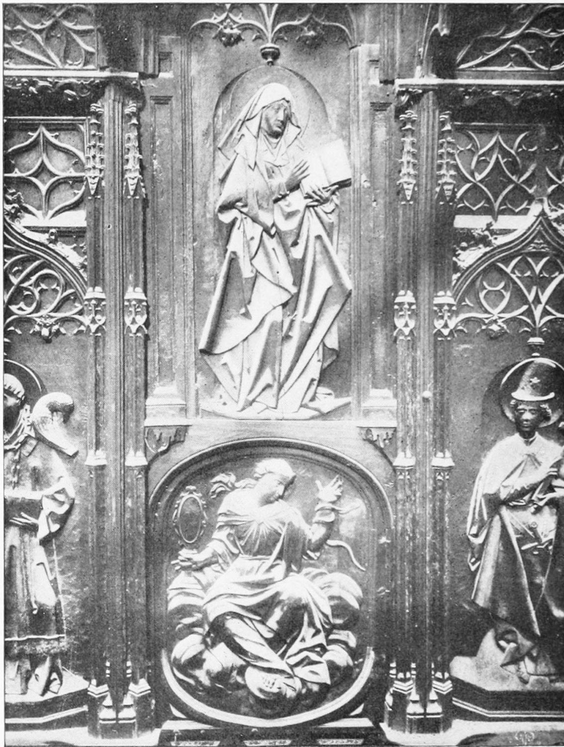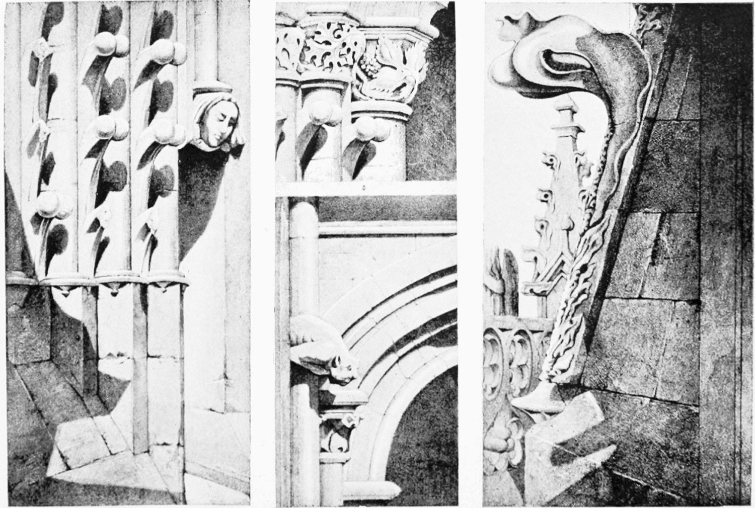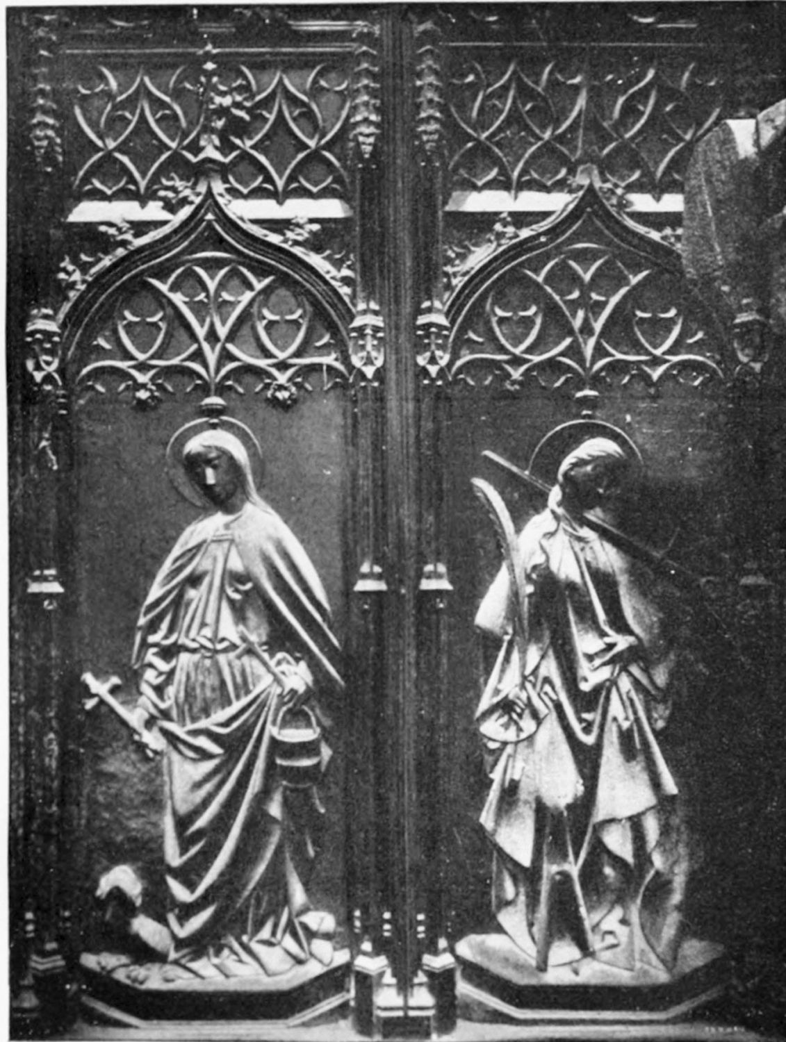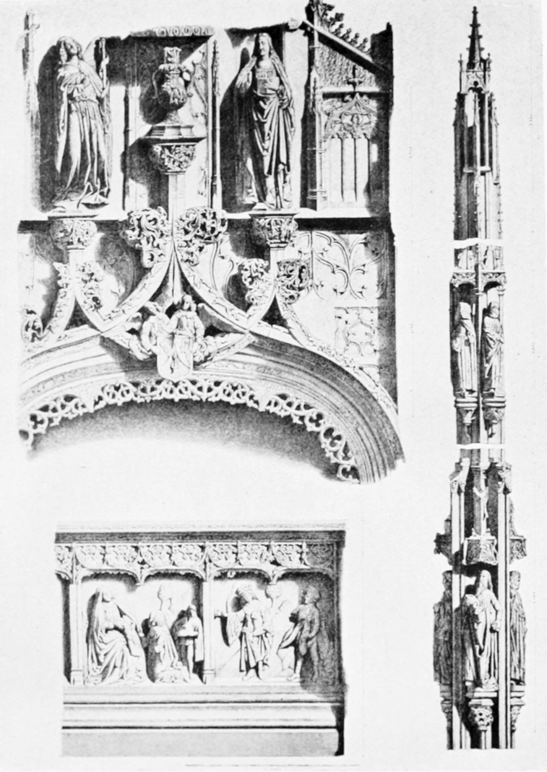 The central shaft of the middle door is disfigured with a dressed-up image of the Virgin enclosed in glass. The sculpture of the tympanum is spirited and elaborate. In a composition depicting the Last Judgment devils are seen stirring their fires and plunging the reprobate into seething cauldrons. On the side of the blessed a young man extracts cheering music from what is perhaps a harmonium. The attitudes of the just express the liveliest satisfaction, whereas a crowned personage, striding boldly into Paradise, is met and warned off by a celestial Janitor. The naïve and fantastically horrible are curiously blended in this skilful work. The southern doorway is the least interesting of the three; the subjects of the reliefs are the death and coronation of the Virgin.
