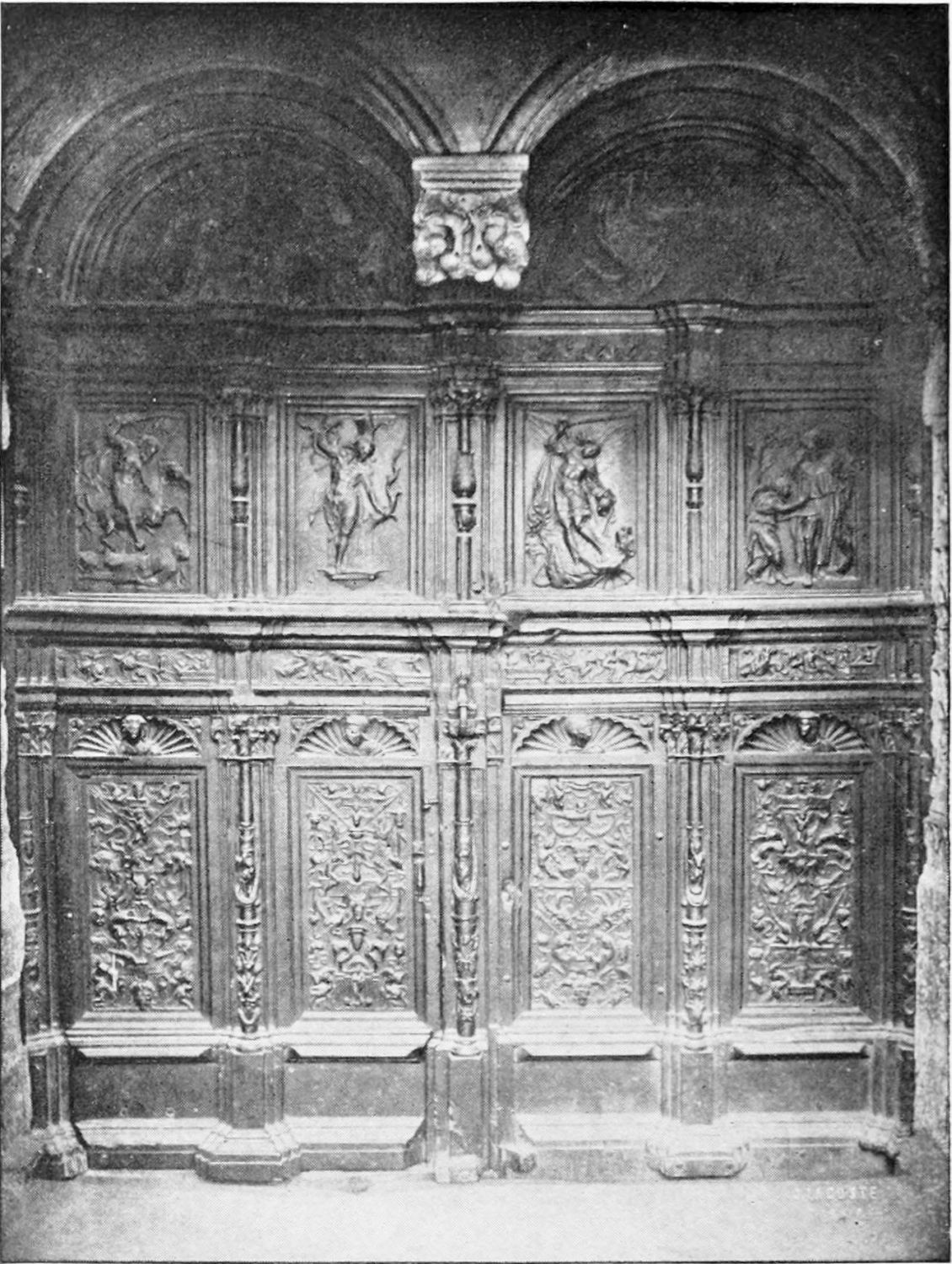 The Renaissance, which left everywhere in Spain so deep an impress, did not leave untouched this Gothic capital. Beside such triumphs of the Romanesque and pointed styles as San Isidoro and the pulchra Leonina rises the church of San Marcos, an interesting specimen of the newer school. Founded as a chapel of the new order of Santiago in 1170, the church witnessed the election of the first prior, and received in 1184 the ashes of the first grand master, Pedro Fernandez de Fuente Encalada. Fernando the Catholic ordered the church to be rebuilt in 1514,{26} but the work progressed very slowly and was not actually finished till 1715. The most important part of the fabric and the plans, however, we owe to Juan de Badajoz, who was working here about 1550. With the adjoining convent, first a hospice for pilgrims to Compostela, now the Provincial Museum, the building presents a very imposing appearance. The church occupies the eastern side of the block, the portal being contained within a very deep and lofty semicircular arch. On either side, in deep plateresque niches, are fine but damaged reliefs by Crozec. The ‘acroterium’ (to employ an expression used by Spanish writers), surmounting the arch, appears to be unfinished, as also are the towers or large buttresses flanking the portal.