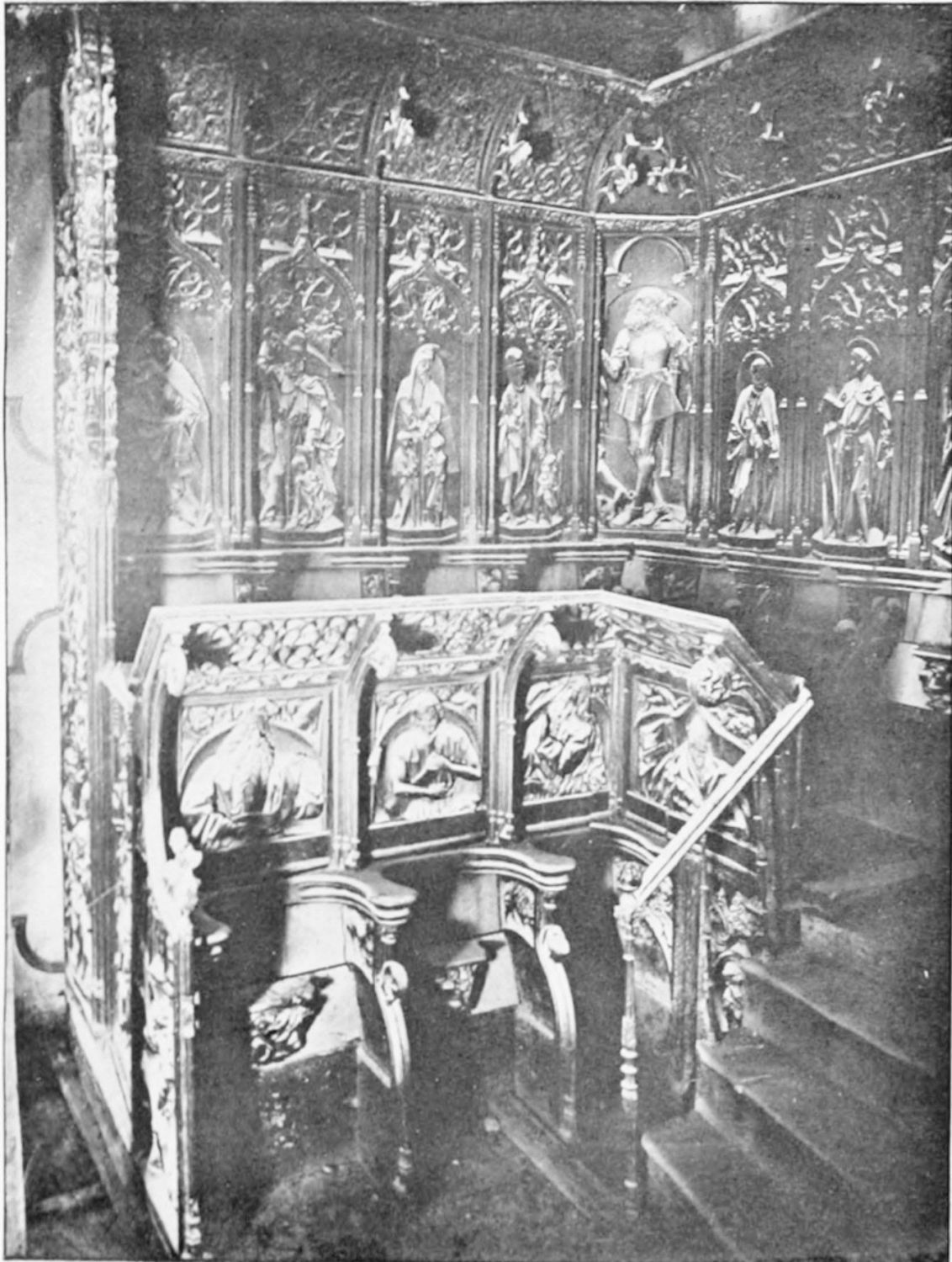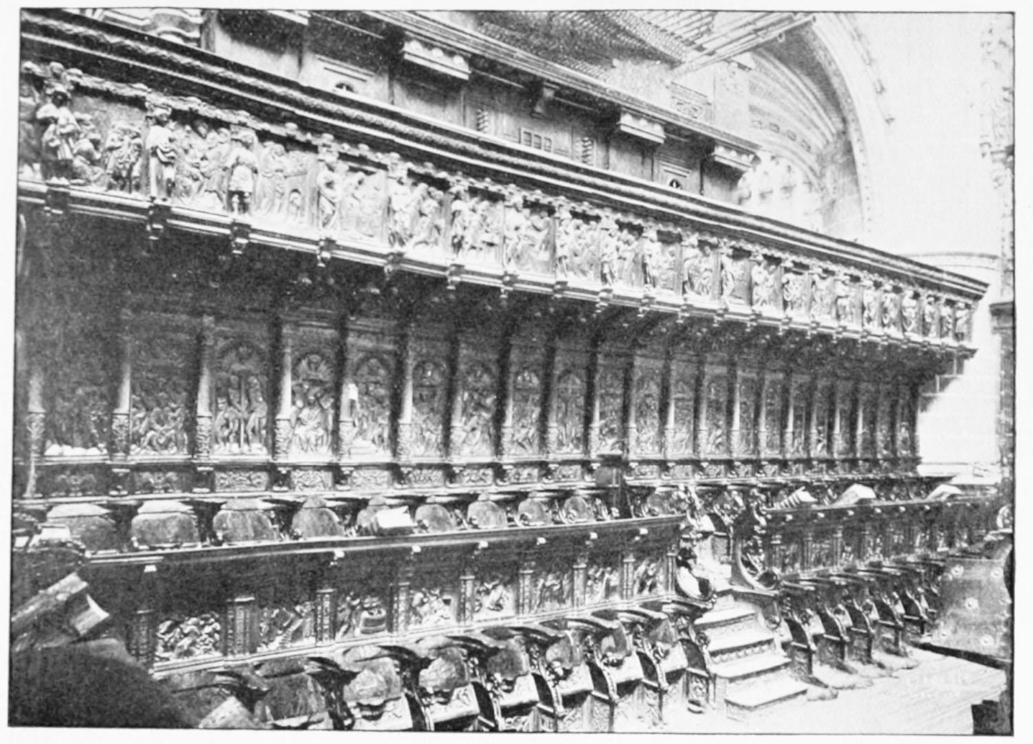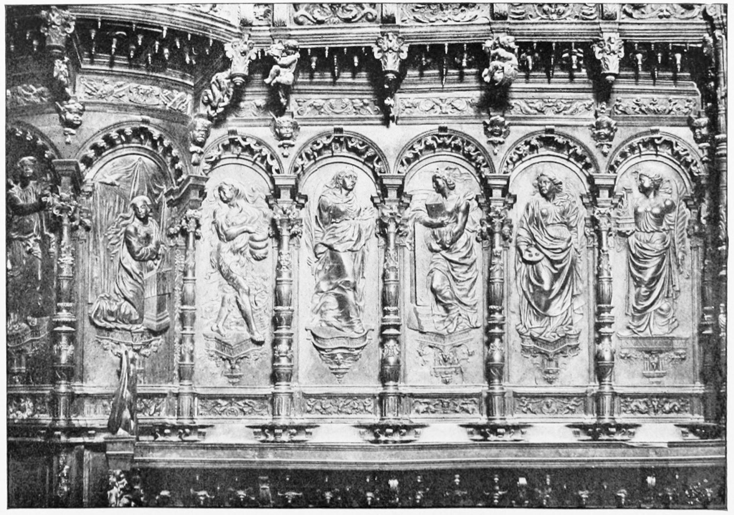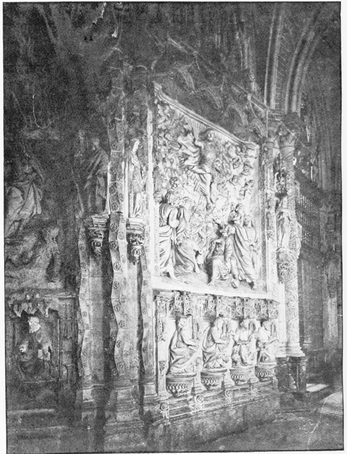 The church is large and cruciform, with some good glass, windows with plateresque traceries, and fine arabesques. The most notable accessories are the choir stalls, the upper row exhibiting admirably carved busts of New Testament worthies; the lower row, of the saints of the Old Dispensation. Grotesque and capricious masks, centaurs, griffins, and so forth, are introduced in great profusion into the decoration; they were the work, for the most part, of one Doncel in 1542, and were mutilated by a pupil of Churri{27}guera in the early part of the eighteenth century.