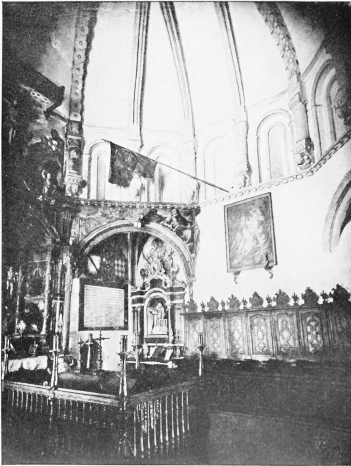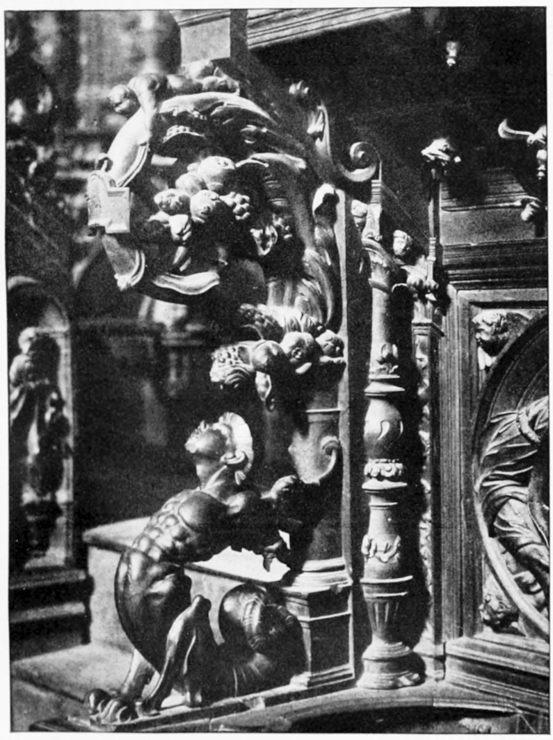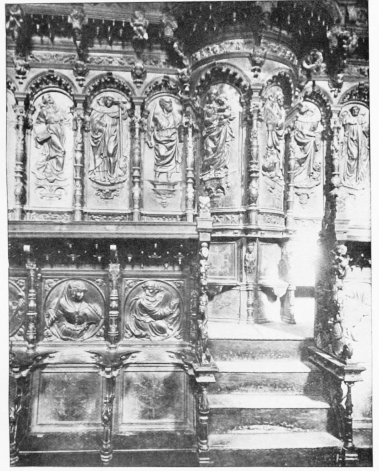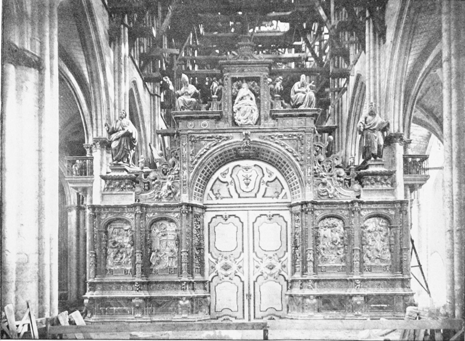 The church is large and cruciform, with some good glass, windows with plateresque traceries, and fine arabesques. The most notable accessories are the choir stalls, the upper row exhibiting admirably carved busts of New Testament worthies; the lower row, of the saints of the Old Dispensation. Grotesque and capricious masks, centaurs, griffins, and so forth, are introduced in great profusion into the decoration; they were the work, for the most part, of one Doncel in 1542, and were mutilated by a pupil of Churri{27}guera in the early part of the eighteenth century.