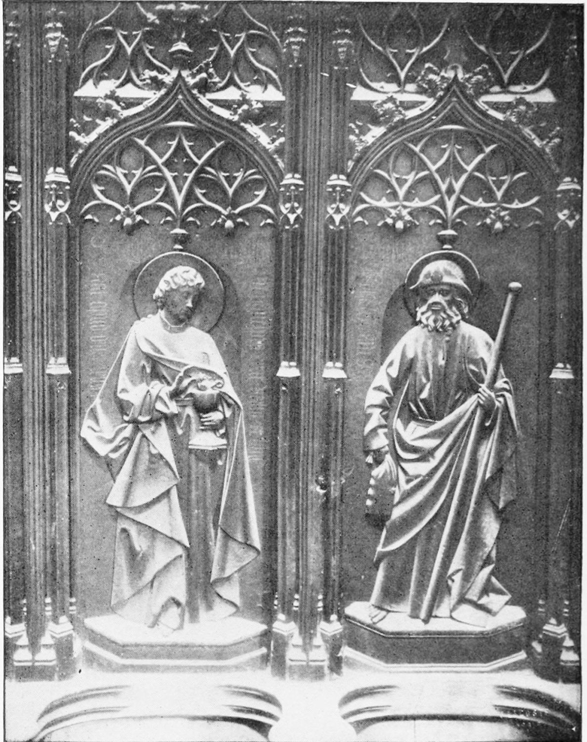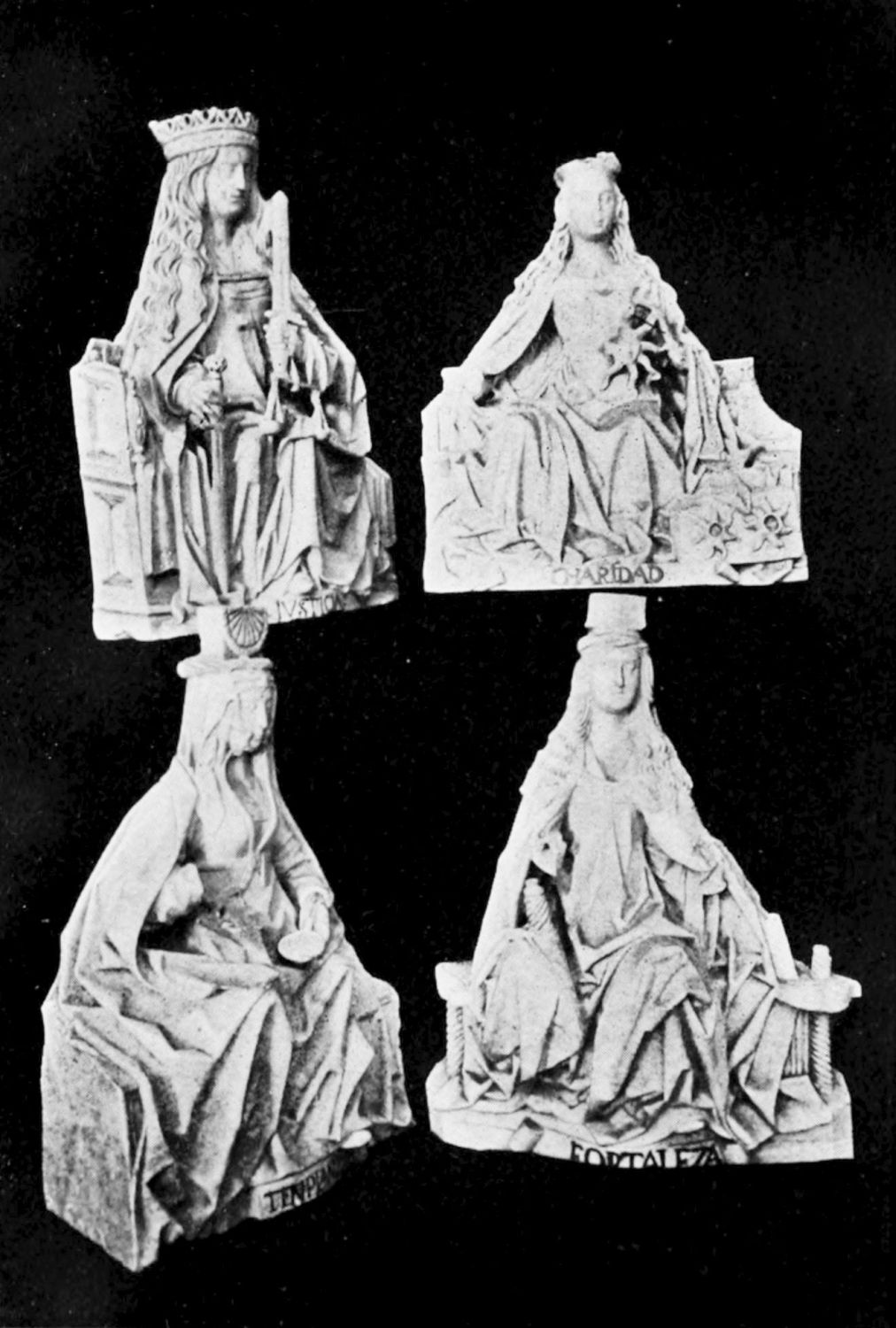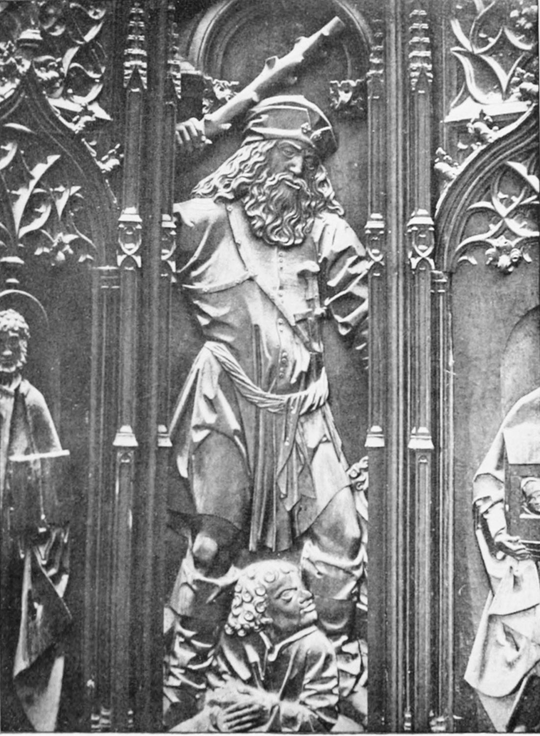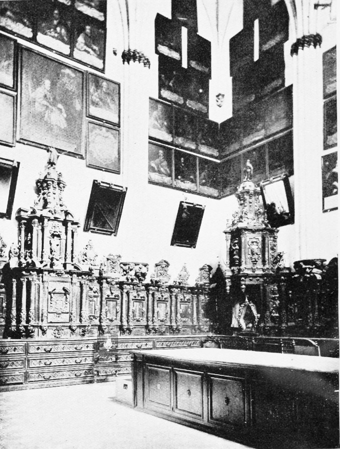 The church is large and cruciform, with some good glass, windows with plateresque traceries, and fine arabesques. The most notable accessories are the choir stalls, the upper row exhibiting admirably carved busts of New Testament worthies; the lower row, of the saints of the Old Dispensation. Grotesque and capricious masks, centaurs, griffins, and so forth, are introduced in great profusion into the decoration; they were the work, for the most part, of one Doncel in 1542, and were mutilated by a pupil of Churri{27}guera in the early part of the eighteenth century.