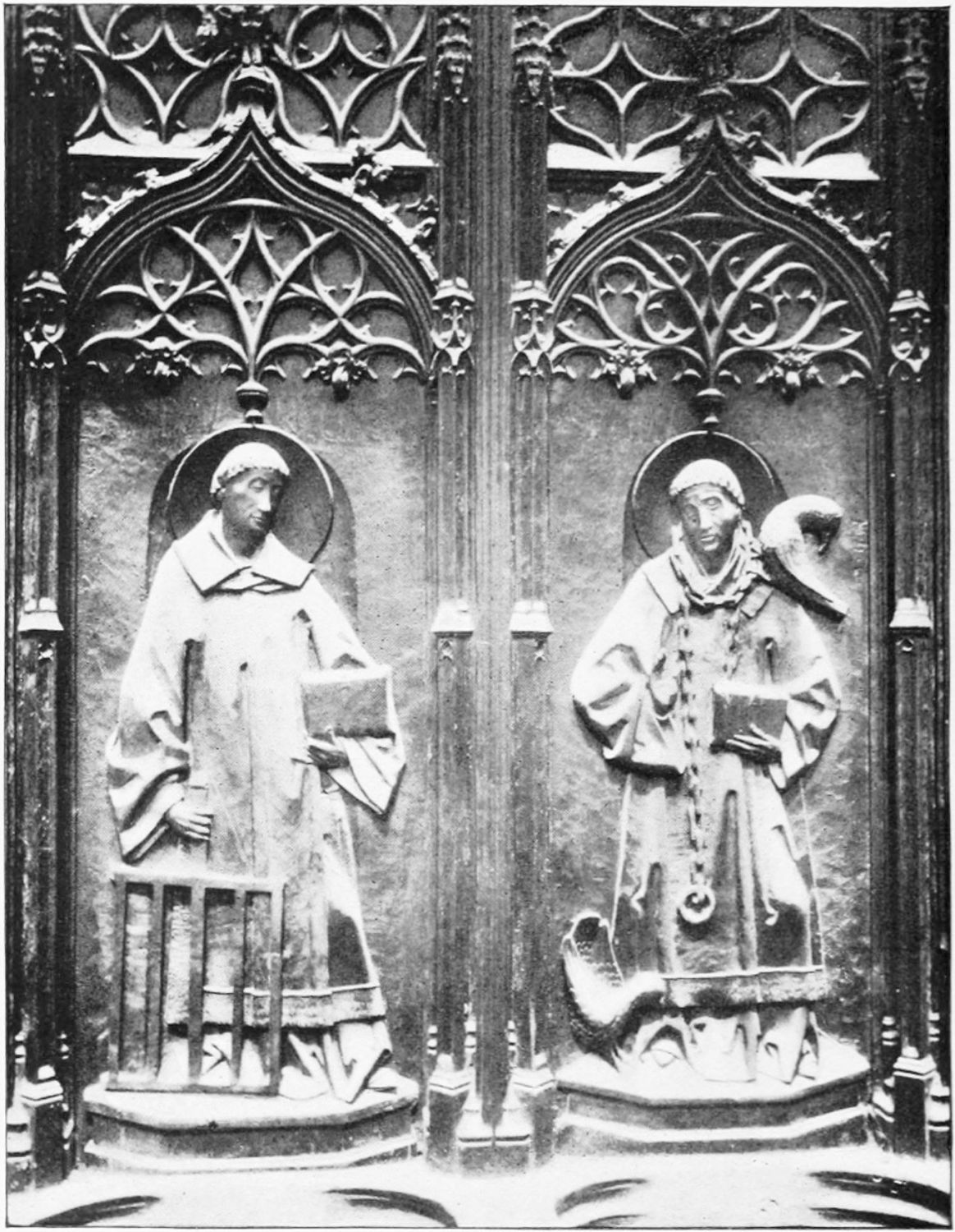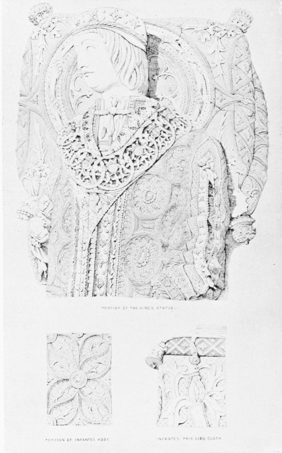The entrance to the south transept has been entirely rebuilt, but the original reliefs and{19} statuary of the three doors have been preserved and re-erected. Some old Byzantine capitals may be distinguished among the Gothic work. The south-west door is relieved with a diaper of fleurs-de-lys and castles, and lions and castles. The sculpture of the tympanum is equal to that of the west front, and shows the Saviour and the Evangelists, the twelve Apostles, and the Death of the Blessed Virgin. The colossal statue on the central shaft is that of San Froilan, an early bishop of Leon. Above is a row of four windows of two lights, and an enormous rose-window.