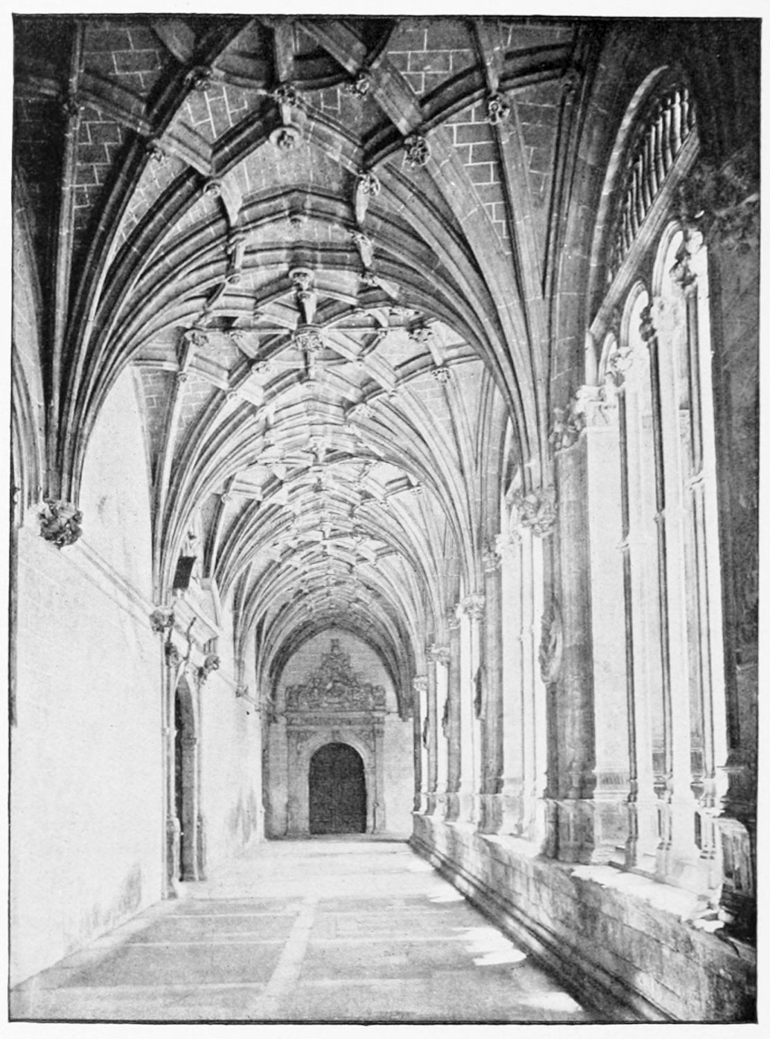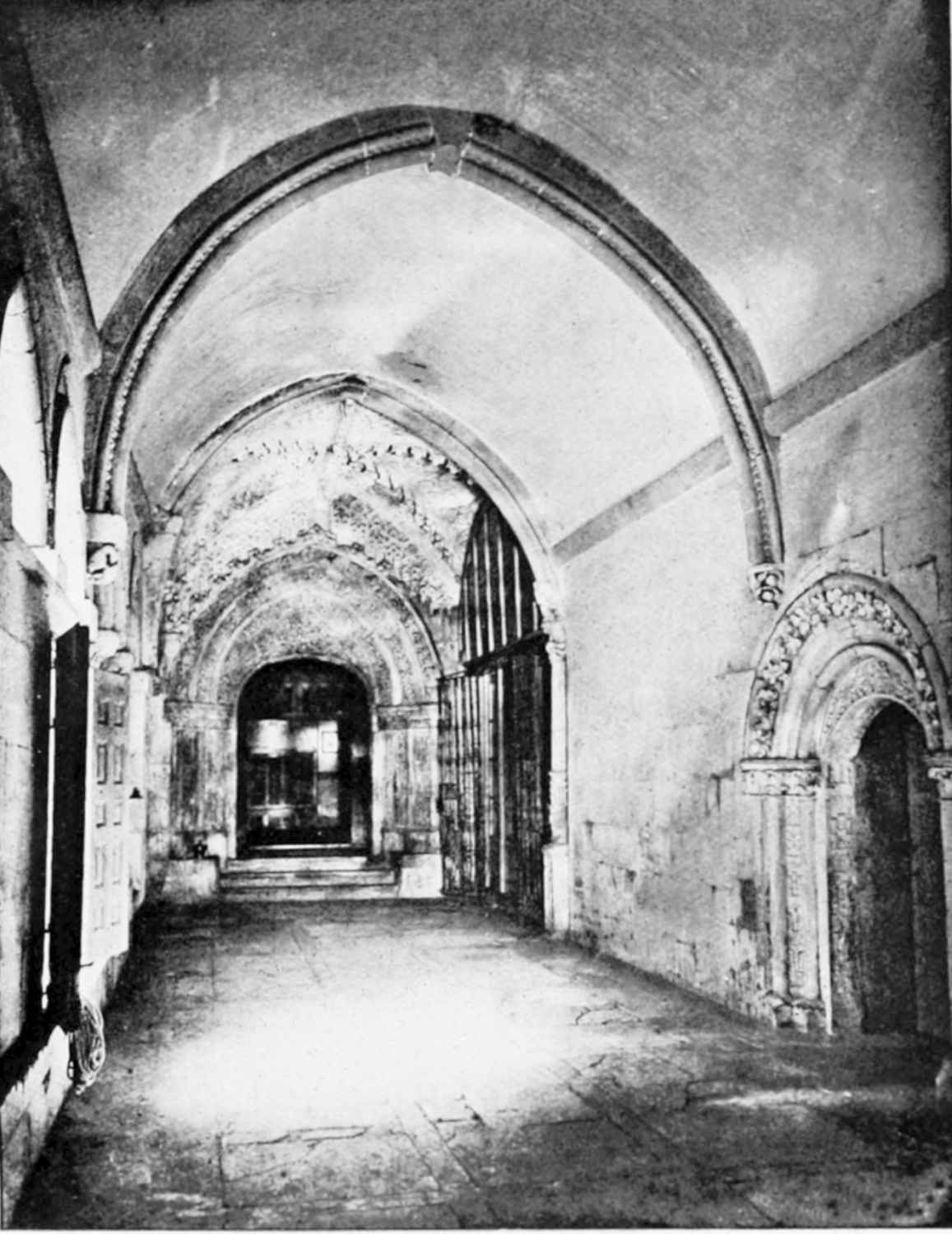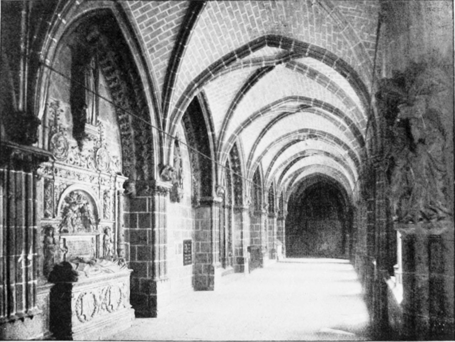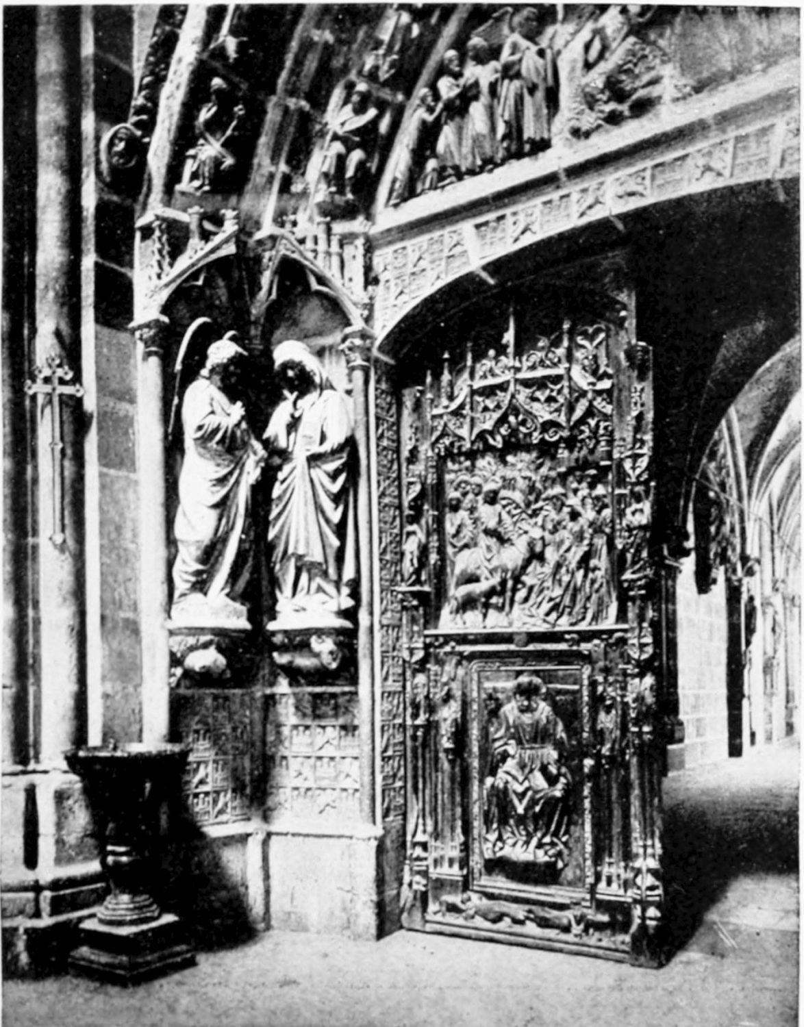 The spacious cloister, which conceals the northern façade of the cathedral, was built in the early fourteenth century, but it has been rebuilt, restored, and altered into what Street calls ‘a very poor and weak kind of Renaissance.’ The ornamentation is profuse and not in bad taste. The inner walls have not been much altered, and the pillars supporting them are sculptured in the Gothic style. The bays are painted with an extremely valuable and interesting series of frescoes, so well drawn that they were more likely the work of some fifteenth-century Italian artist than productions of native talent. The subjects are all from the history of Christ and Mary, the Crucifixion curiously enough being omitted. When Street saw these paintings forty years ago, he spoke of the colours{24} as pure and good, but they have now been almost entirely obliterated by the damp. The cloister contains several sepulchral monuments, some mere slabs, but one—that of the Canon Juan de Grajal (1447)—elaborately and artistically sculptured. Some colossal idiot has cut off the heads of the angels shown in this fine piece of work. Near the beautiful Gothic entrance to the cloister is an image of our Lady of Regla, to which at one time the people used to proceed in procession to return thanks for the mythical victory of Clavijo, a choir of damsels representing the equally mythical tribute of one hundred virgins said to have been paid by Mauregato to the Moors.