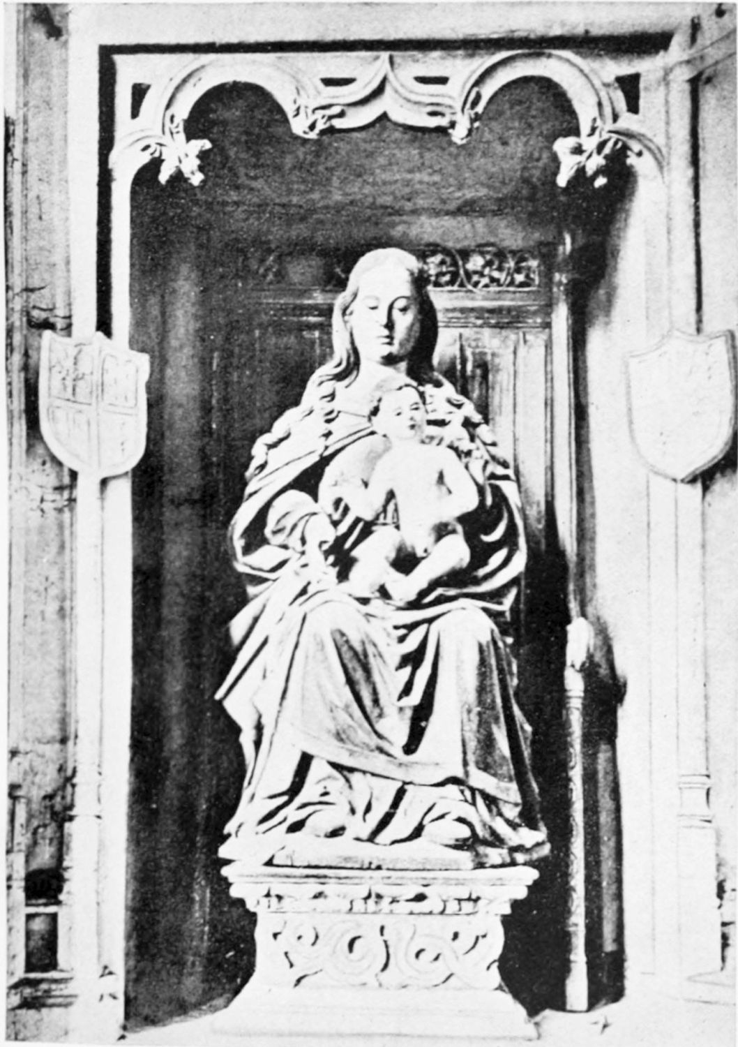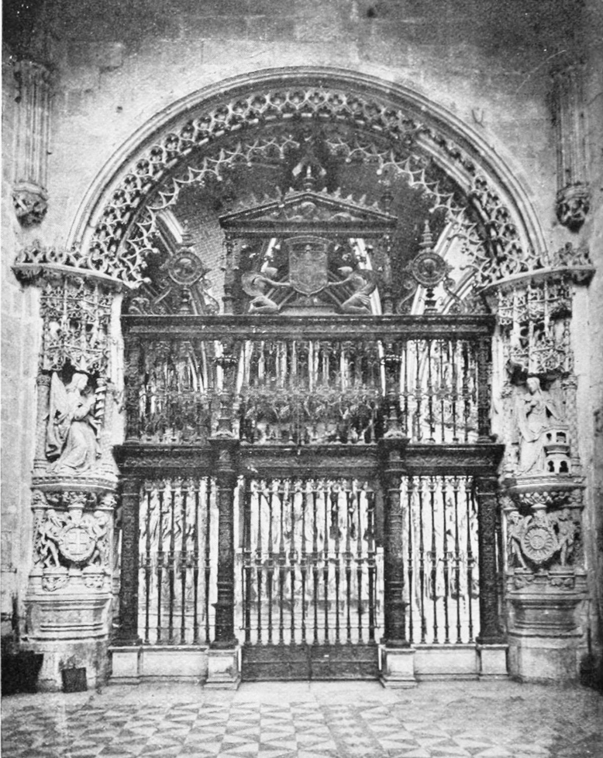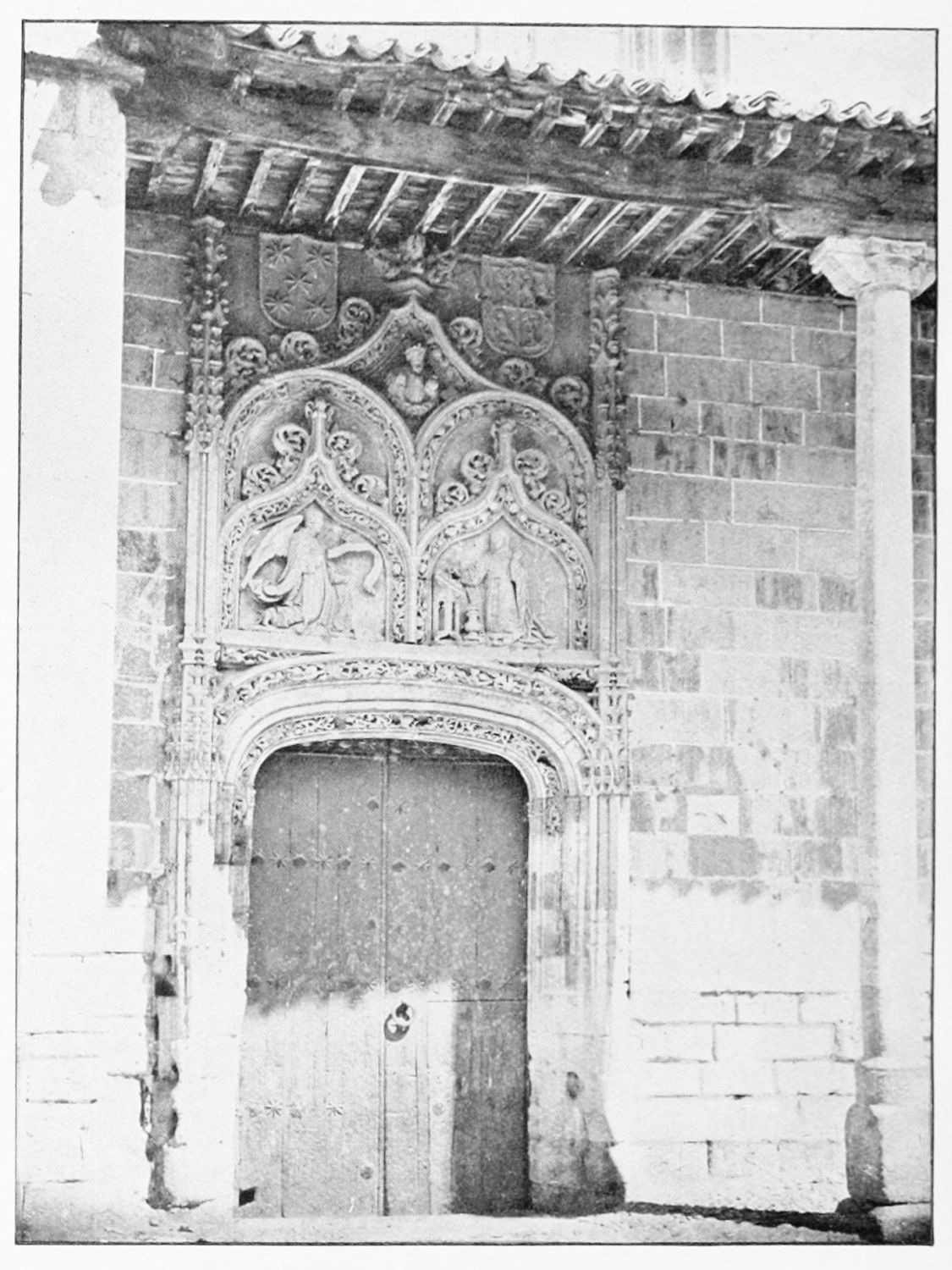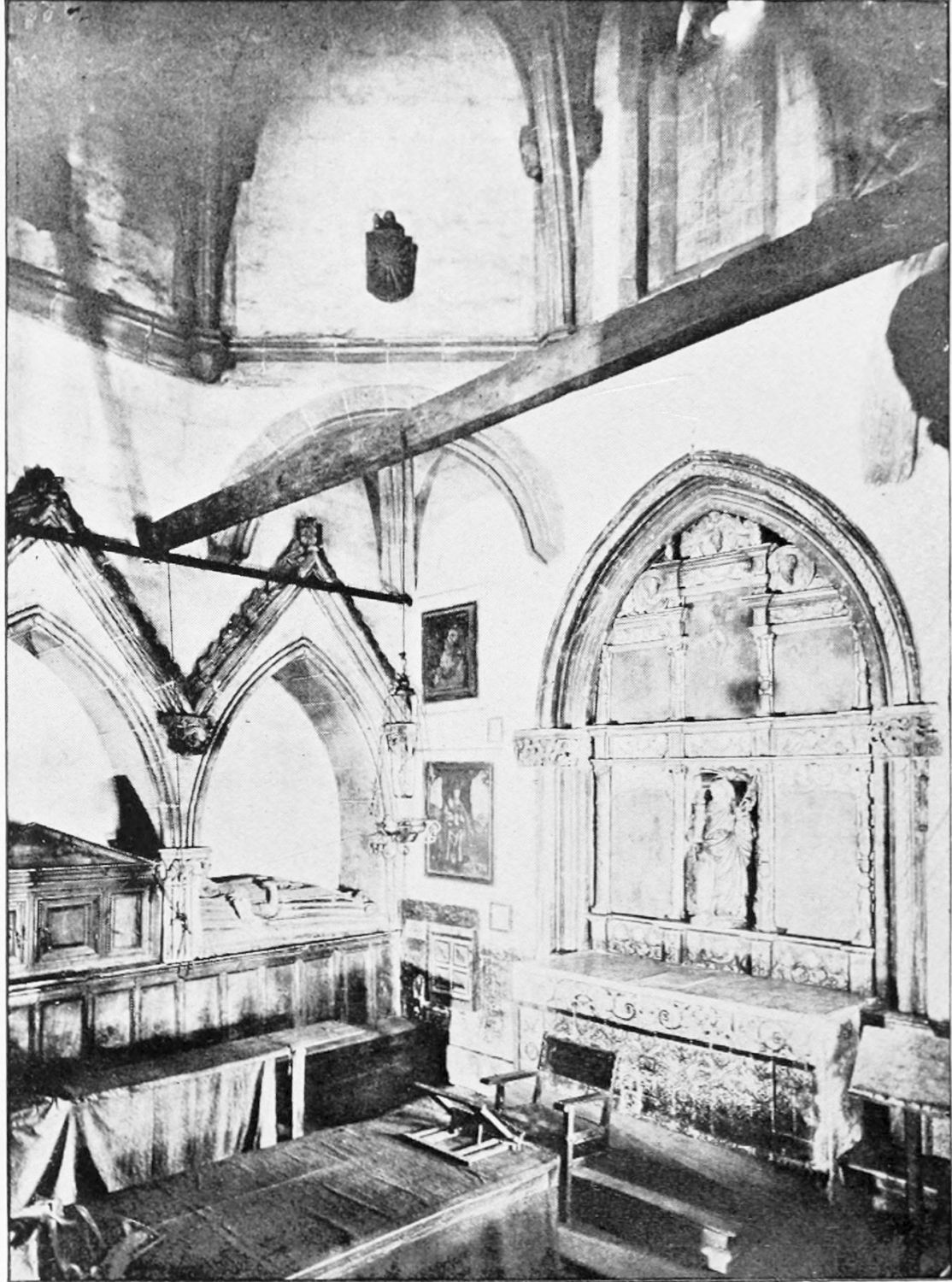 The spacious cloister, which conceals the northern façade of the cathedral, was built in the early fourteenth century, but it has been rebuilt, restored, and altered into what Street calls ‘a very poor and weak kind of Renaissance.’ The ornamentation is profuse and not in bad taste. The inner walls have not been much altered, and the pillars supporting them are sculptured in the Gothic style. The bays are painted with an extremely valuable and interesting series of frescoes, so well drawn that they were more likely the work of some fifteenth-century Italian artist than productions of native talent. The subjects are all from the history of Christ and Mary, the Crucifixion curiously enough being omitted. When Street saw these paintings forty years ago, he spoke of the colours{24} as pure and good, but they have now been almost entirely obliterated by the damp. The cloister contains several sepulchral monuments, some mere slabs, but one—that of the Canon Juan de Grajal (1447)—elaborately and artistically sculptured. Some colossal idiot has cut off the heads of the angels shown in this fine piece of work. Near the beautiful Gothic entrance to the cloister is an image of our Lady of Regla, to which at one time the people used to proceed in procession to return thanks for the mythical victory of Clavijo, a choir of damsels representing the equally mythical tribute of one hundred virgins said to have been paid by Mauregato to the Moors.