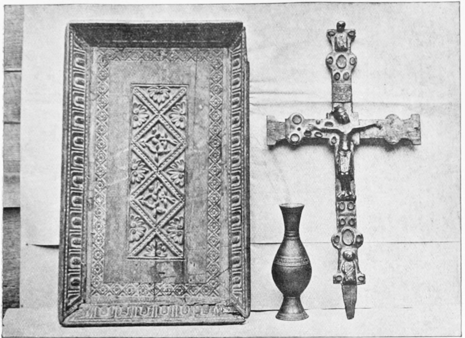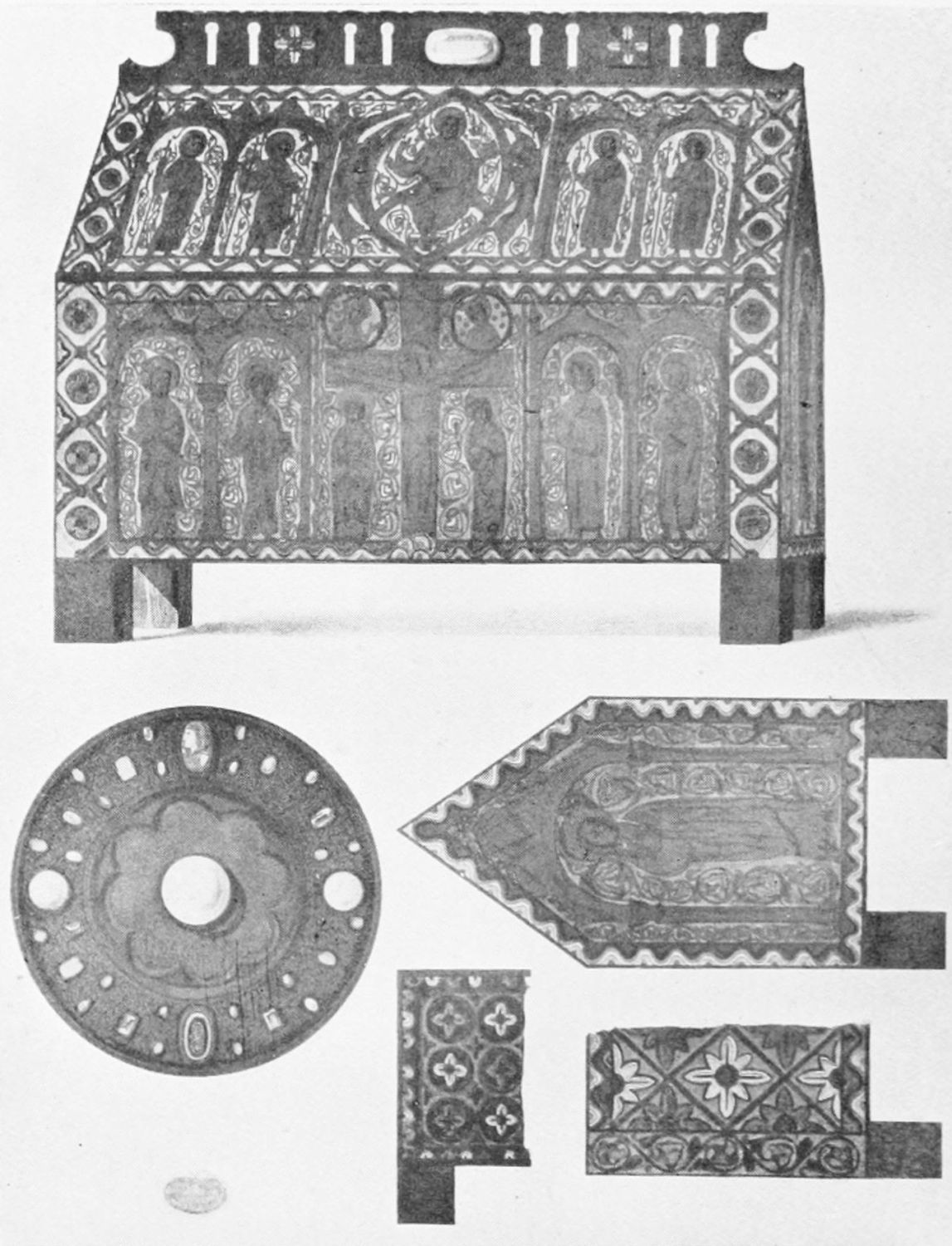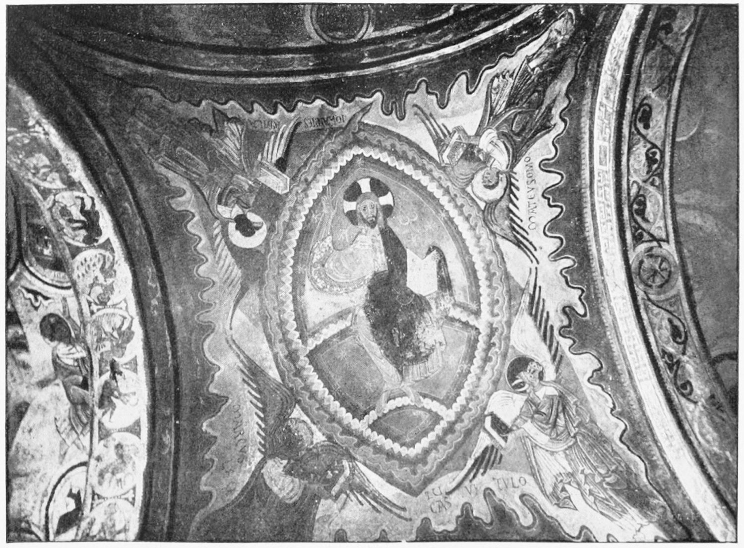 The arches of this gloomy Pantheon are decorated with curious frescoes, probably of the twelfth century. The crude drawing and tints rather add to the impressive effect of these solemn paintings. Among the subjects are the ‘Massacre of the Innocents,’ the ‘Last Supper’ (painted, as Street points out, without the least regard to the angles formed by the groining, and as if the vault were a flat surface), scenes from the Passion, and the Visions of the Apocalypse—terrible conceptions. One of the designs represents the Supreme Judge with two swords issuing from His mouth; another shows a hand, inscribed Dextra Dei. The compositions are surrounded by foliage, rich and conventional. On the altar is an interesting ivory cross, the gift of Fernando I. and Sancha, whose names are engraved upon the reverse. While the figure of Christ is rude in the extreme, the foliage and figures of the four evangelists at the back are exquisitely chiselled.{12}