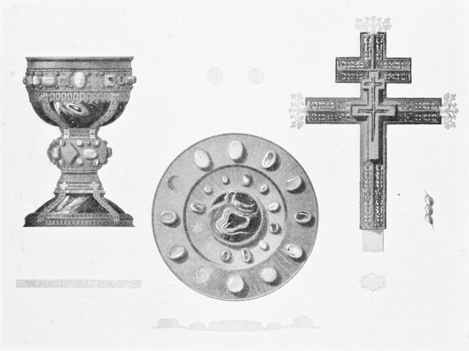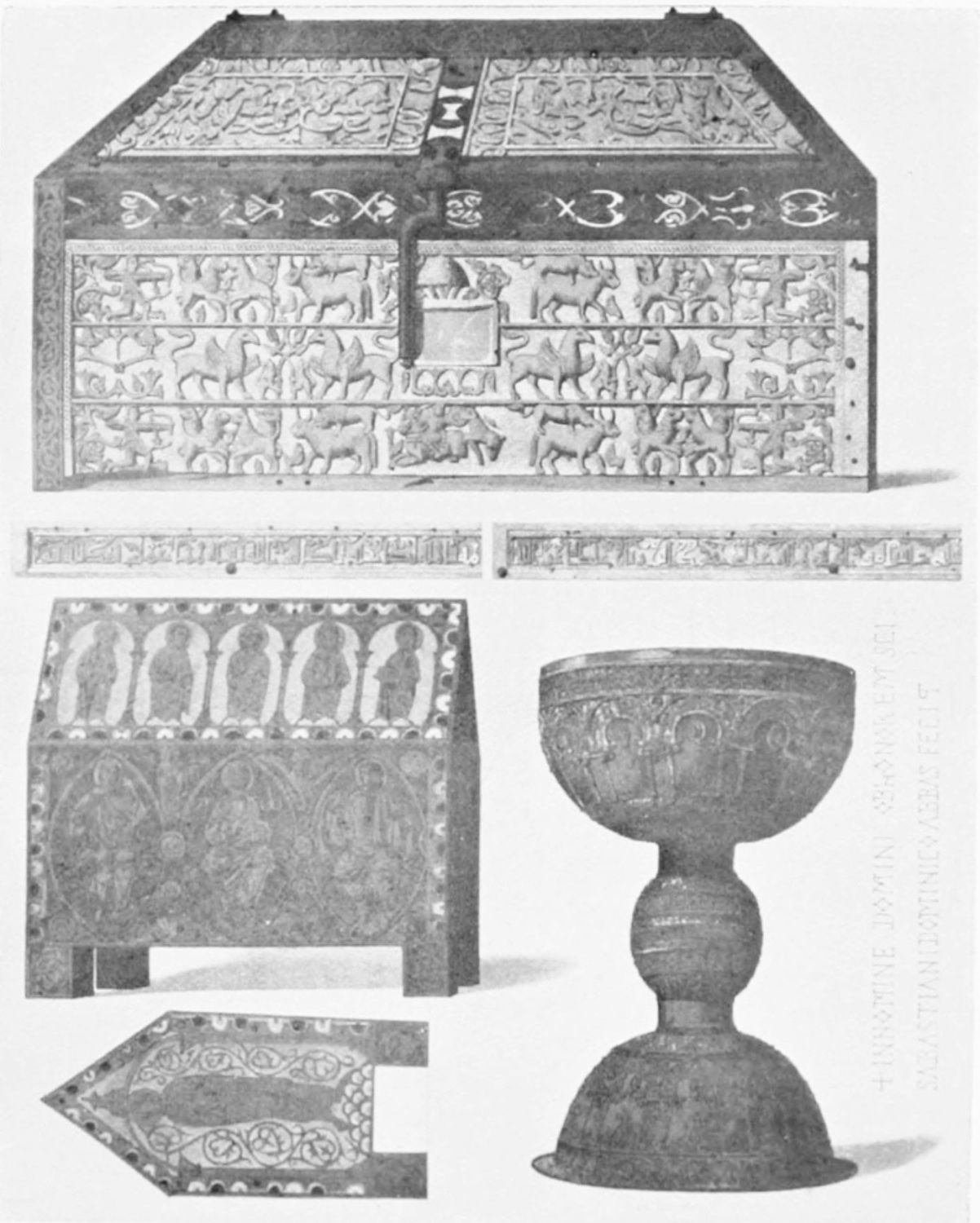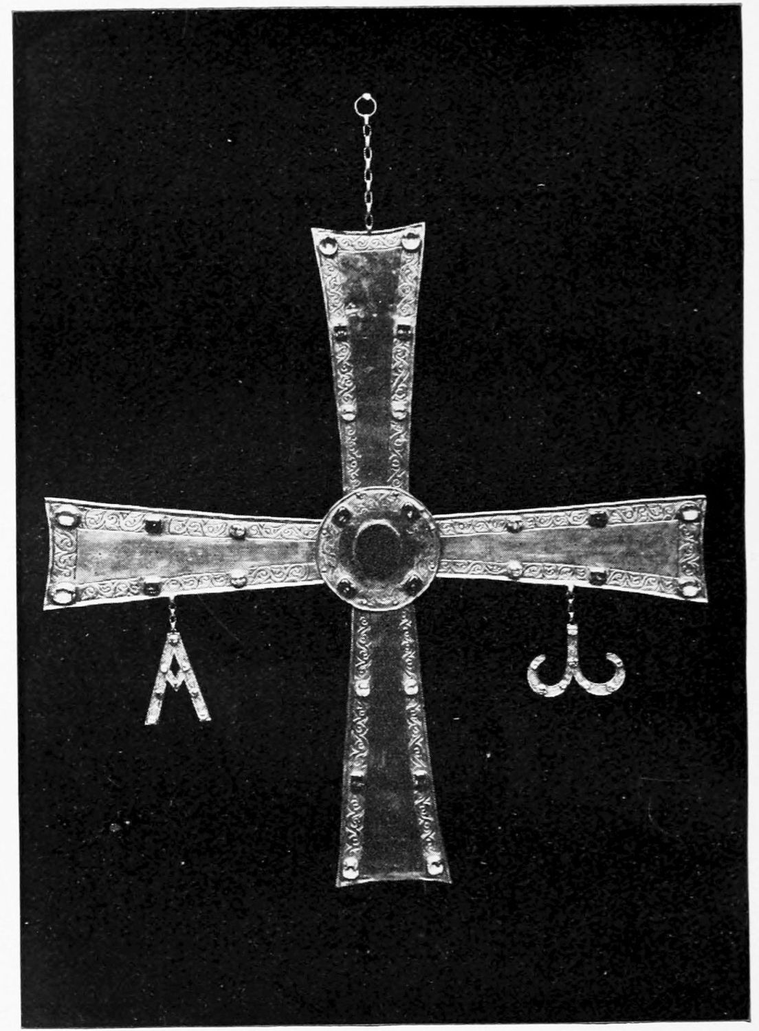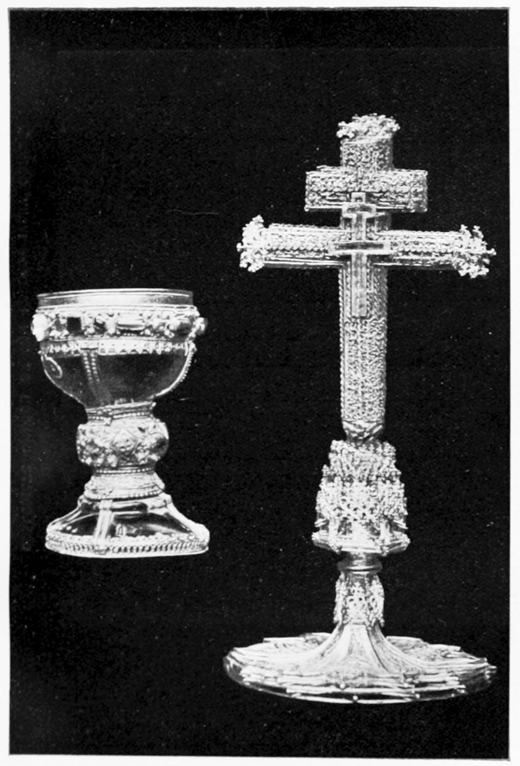 The arches of this gloomy Pantheon are decorated with curious frescoes, probably of the twelfth century. The crude drawing and tints rather add to the impressive effect of these solemn paintings. Among the subjects are the ‘Massacre of the Innocents,’ the ‘Last Supper’ (painted, as Street points out, without the least regard to the angles formed by the groining, and as if the vault were a flat surface), scenes from the Passion, and the Visions of the Apocalypse—terrible conceptions. One of the designs represents the Supreme Judge with two swords issuing from His mouth; another shows a hand, inscribed Dextra Dei. The compositions are surrounded by foliage, rich and conventional. On the altar is an interesting ivory cross, the gift of Fernando I. and Sancha, whose names are engraved upon the reverse. While the figure of Christ is rude in the extreme, the foliage and figures of the four evangelists at the back are exquisitely chiselled.{12}