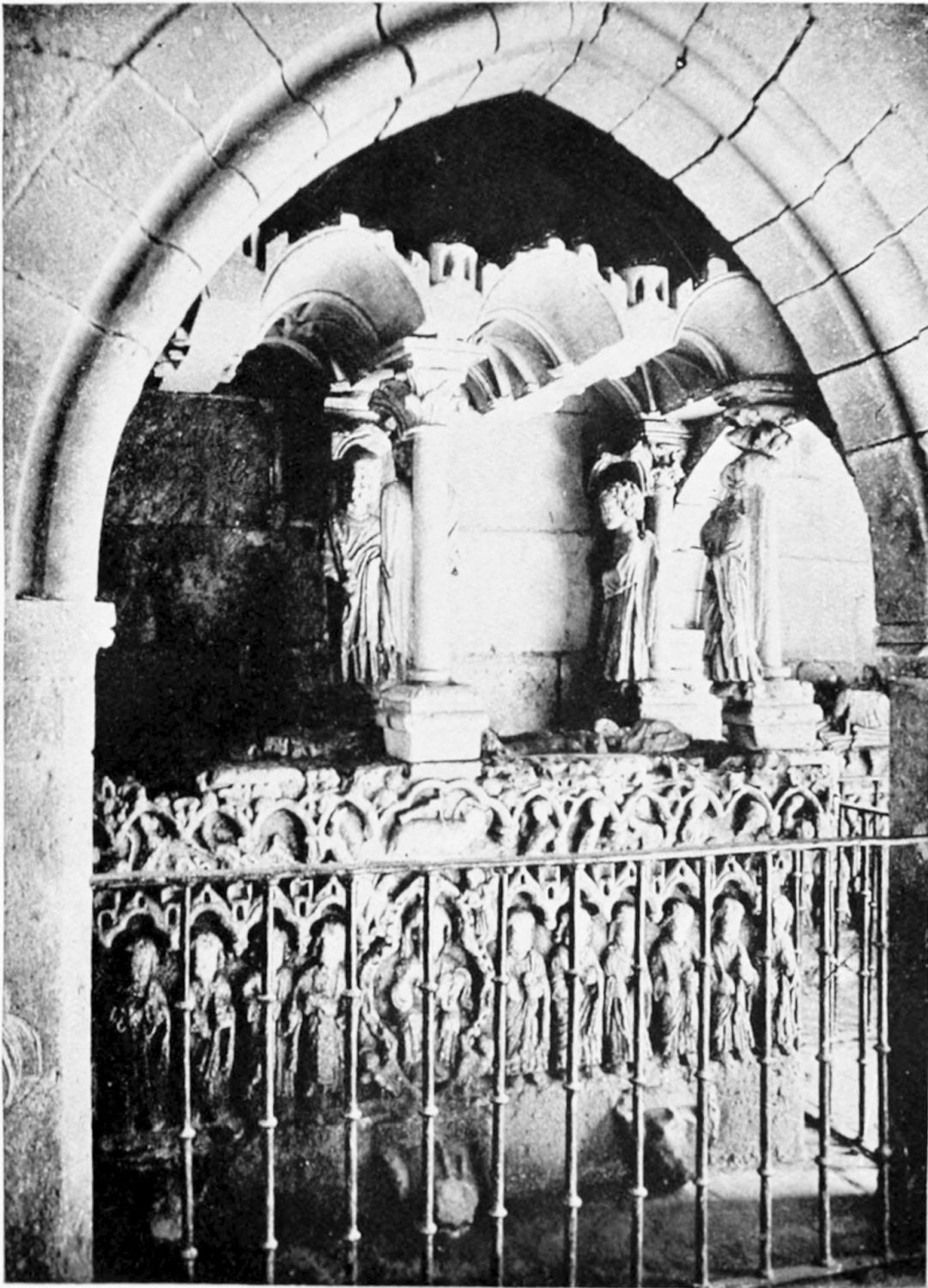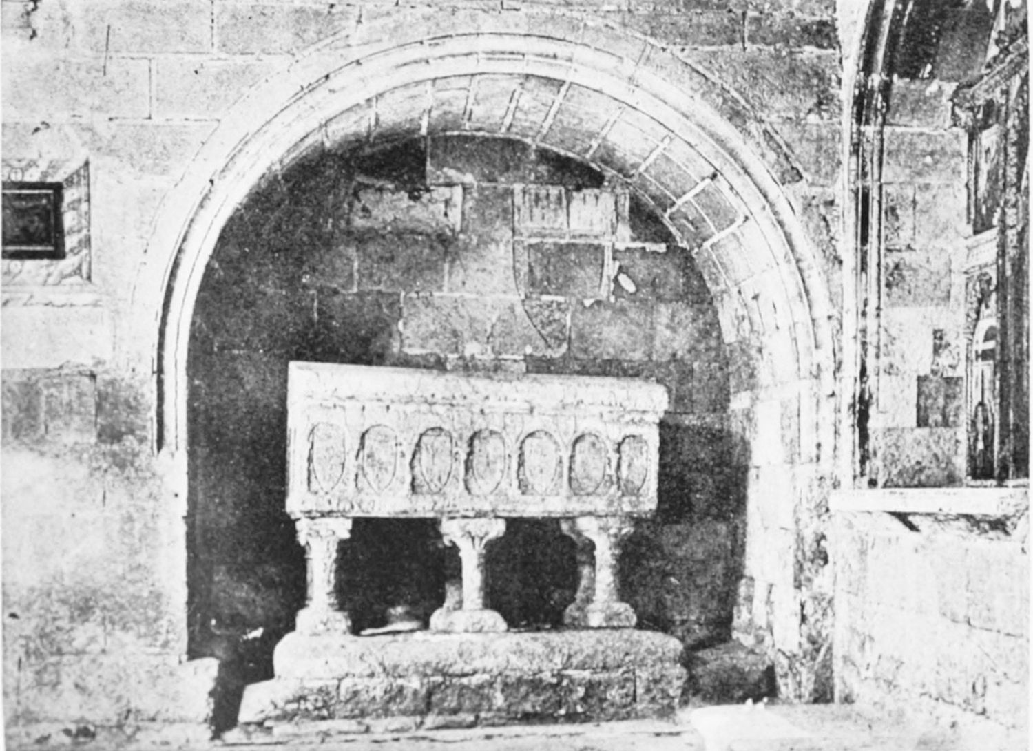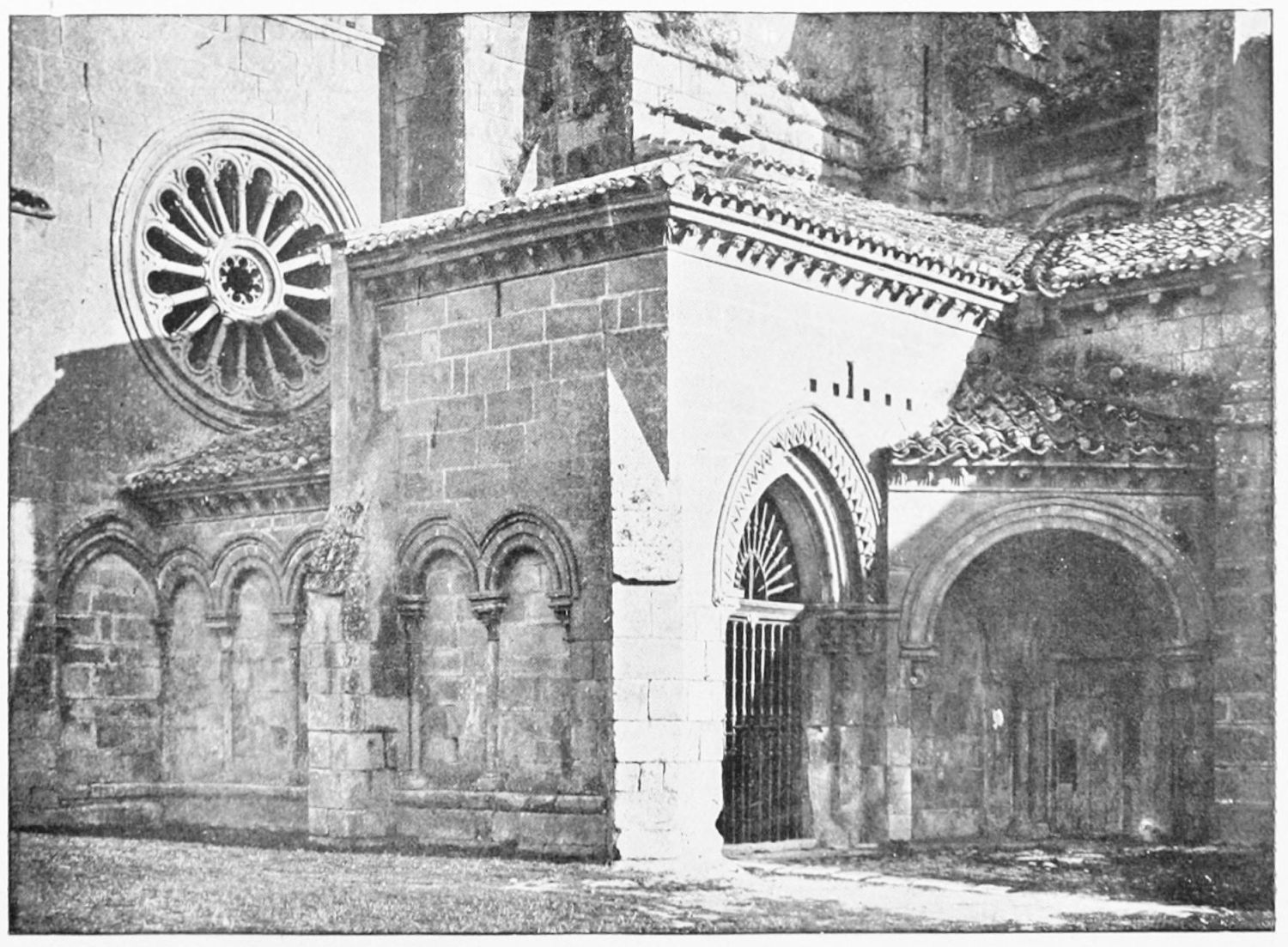 The church is in the Romanesque style, the oldest portion being the chapel of Santa Catalina, which Street thinks was the original fabric of Fernando I. The chapel was intended as a mausoleum for the royal family of Leon, but twelve tombs only remain out of thirty. The only inscriptions are on the resting-places of Alfonso V. and Sancha, the sister of Alfonso VII. Here were buried Alfonso IV., Ramiro II., Ordoño III. and his queen, Sancho I., Ramiro III. and his queen Urraca, Fernando I. and Queen Sancha, Sancho the Great of Navarre, and the murdered Count Garcia. Here, before the Pantheon was despoiled by the French in{11} 1808, might have been seen the marble and porphyry sepulchre of the brave princess Urraca of Zamora, and the urns of the Moorish and French wives of Alfonso VII. Now, the inscriptions having been wantonly defaced, it is impossible to identify the few remaining sarcophagi.