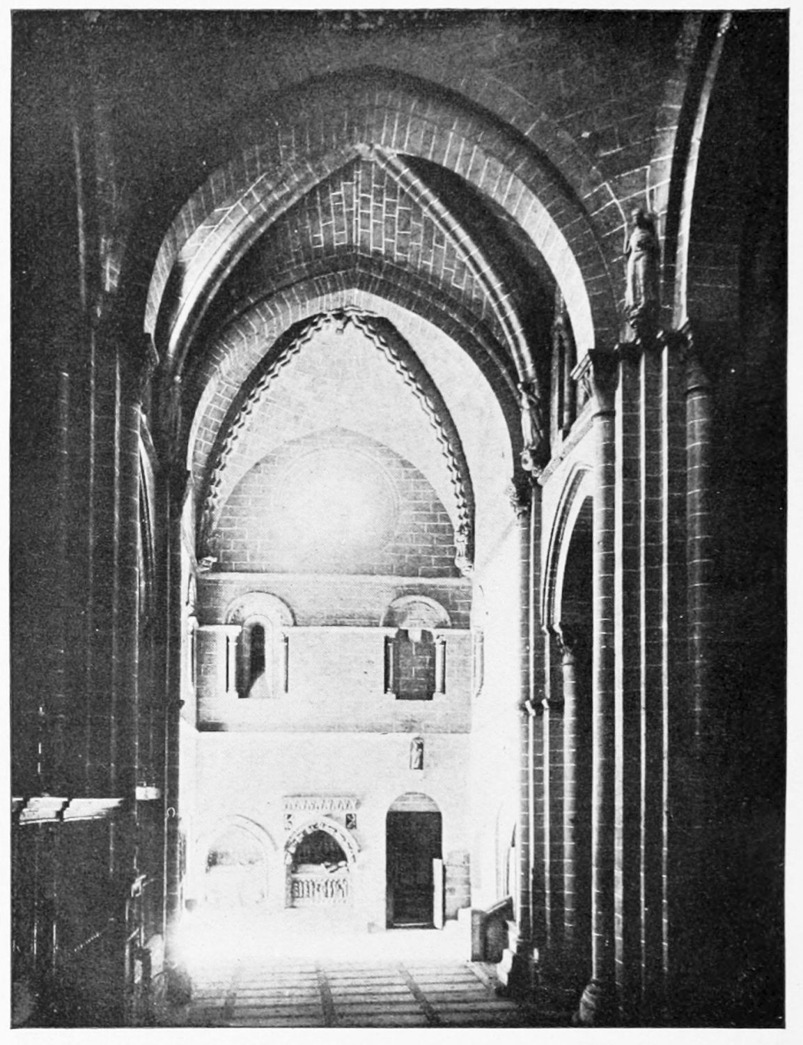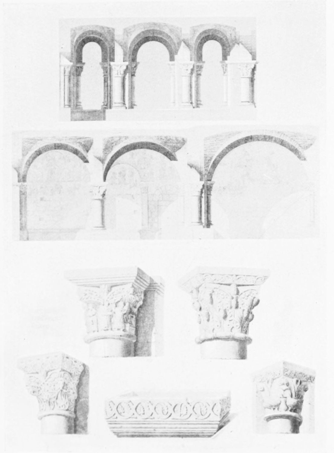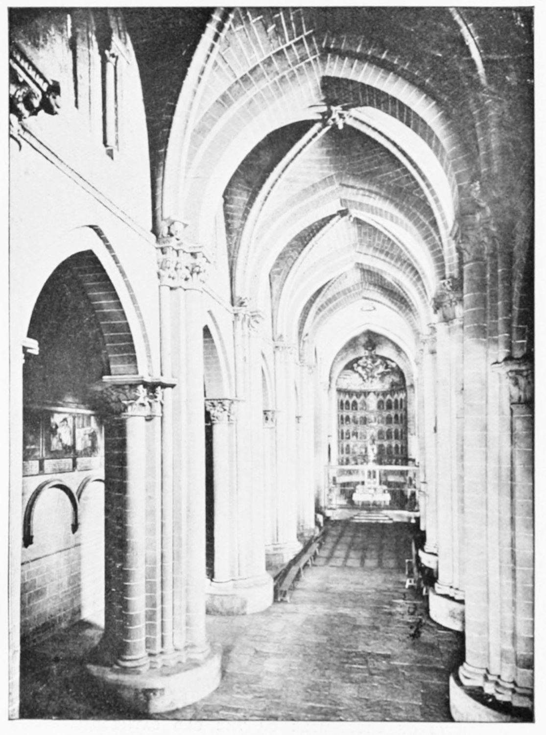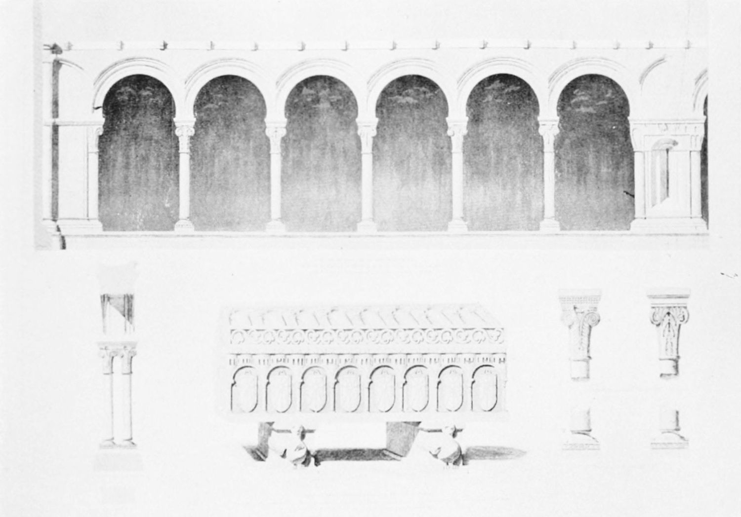 The church is in the Romanesque style, the oldest portion being the chapel of Santa Catalina, which Street thinks was the original fabric of Fernando I. The chapel was intended as a mausoleum for the royal family of Leon, but twelve tombs only remain out of thirty. The only inscriptions are on the resting-places of Alfonso V. and Sancha, the sister of Alfonso VII. Here were buried Alfonso IV., Ramiro II., Ordoño III. and his queen, Sancho I., Ramiro III. and his queen Urraca, Fernando I. and Queen Sancha, Sancho the Great of Navarre, and the murdered Count Garcia. Here, before the Pantheon was despoiled by the French in{11} 1808, might have been seen the marble and porphyry sepulchre of the brave princess Urraca of Zamora, and the urns of the Moorish and French wives of Alfonso VII. Now, the inscriptions having been wantonly defaced, it is impossible to identify the few remaining sarcophagi.