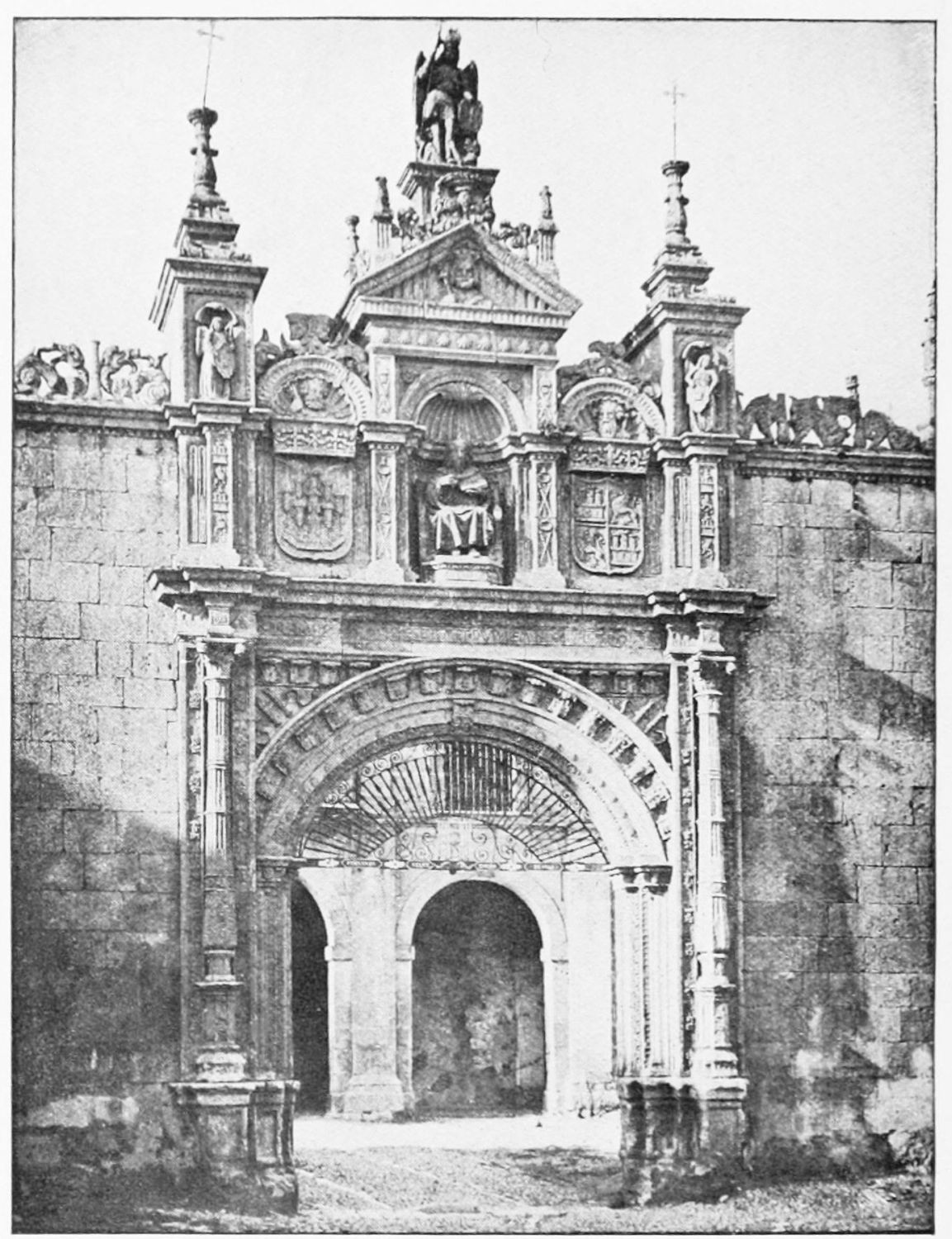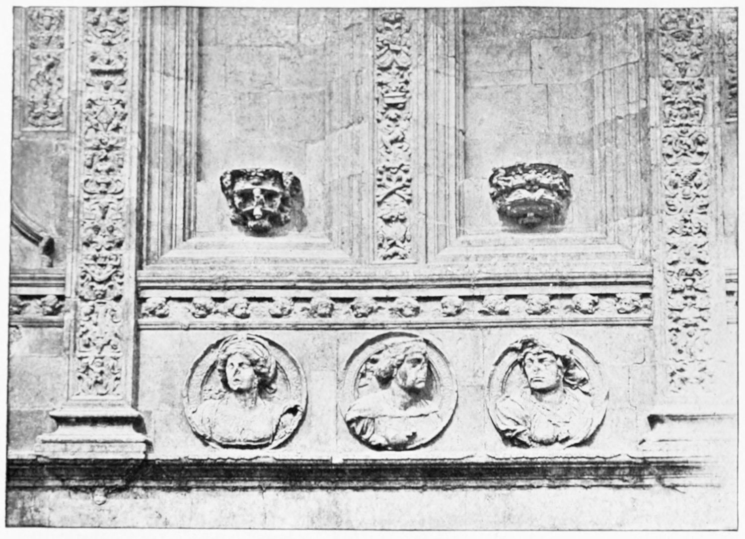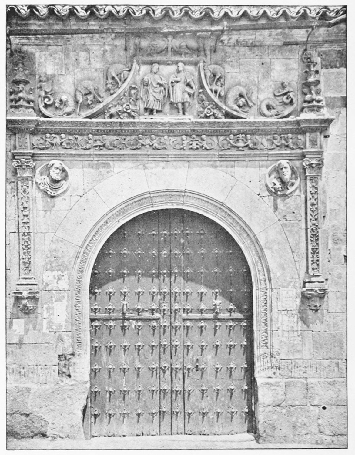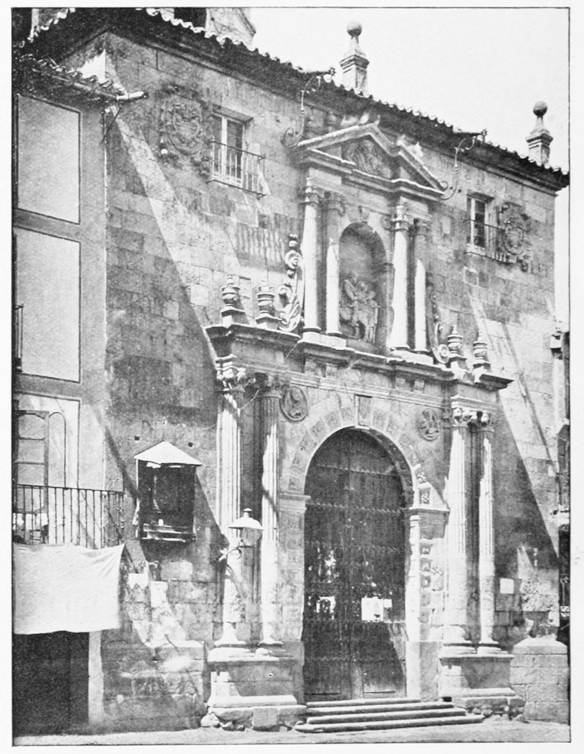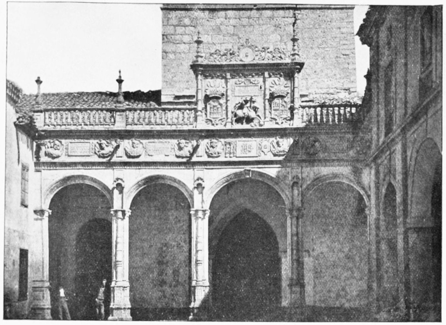 The grand façade of the old convent, extending to the river bank, is divided into two stories, the lower characterised by semicircular windows between pilasters in the plateresque style, and separated by niches; the upper by rectangular windows with balconies, disposed between columns, and likewise separated by niches in pairs. The frieze beneath the lower row of windows is adorned by a series of medallions, displaying the heads of mythological and historical worthies, Gentiles and Christians, ancients and moderns, most oddly assorted. With Priam and Hector, Hannibal and Cæsar, we find Charlemagne and the Cid, Charles V. and Philip II., with Lucretia, Judith and Isabel the Catholic. The busts to the left of the doorway are those of the grand masters of the Order of Santiago. The{29} doorway itself is a very unhappy combination of the plateresque and baroque styles, but the statue of Fame surmounting it is not devoid of grace and dignity. The balconies and windows facing the river date from the eighteenth century.