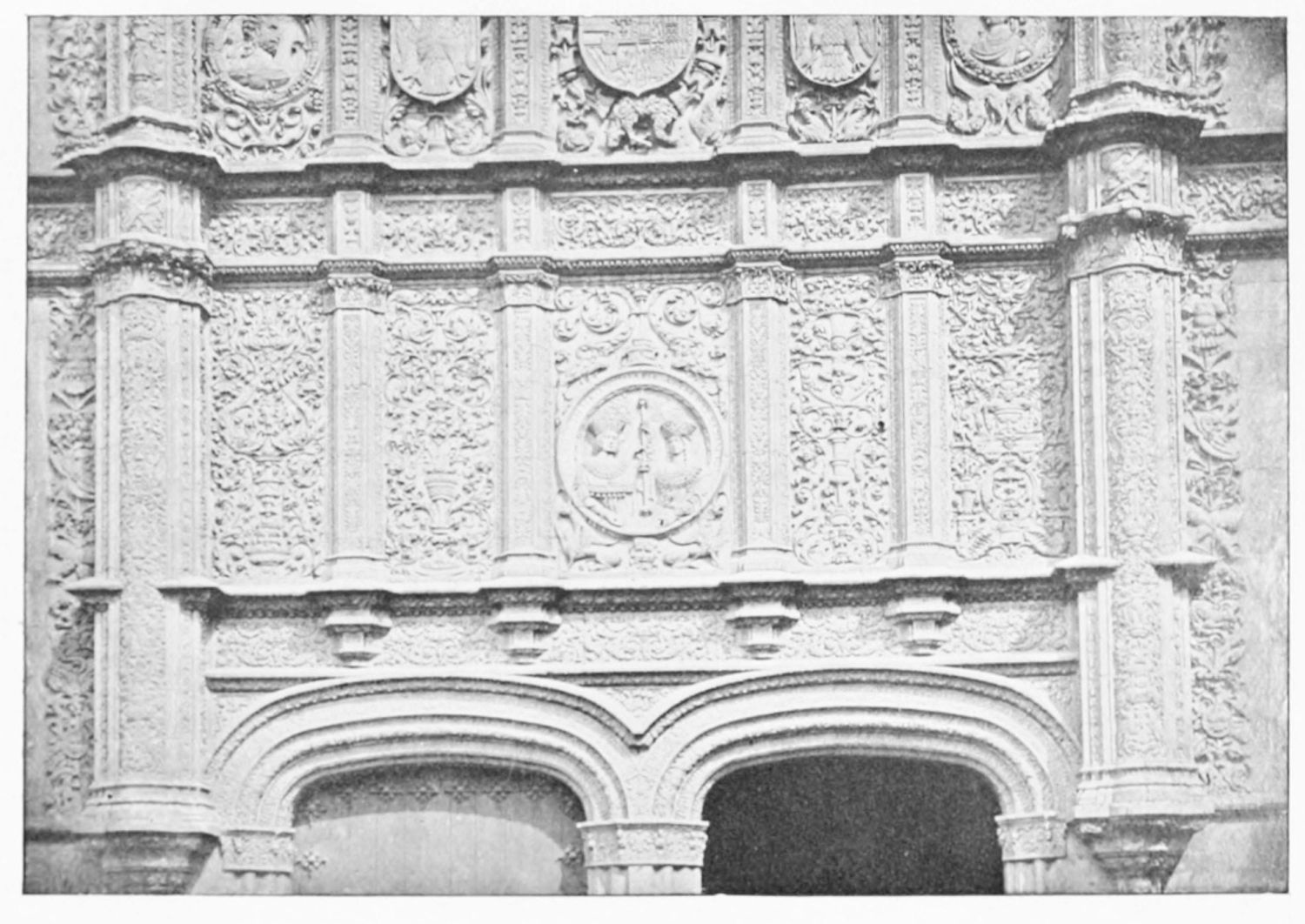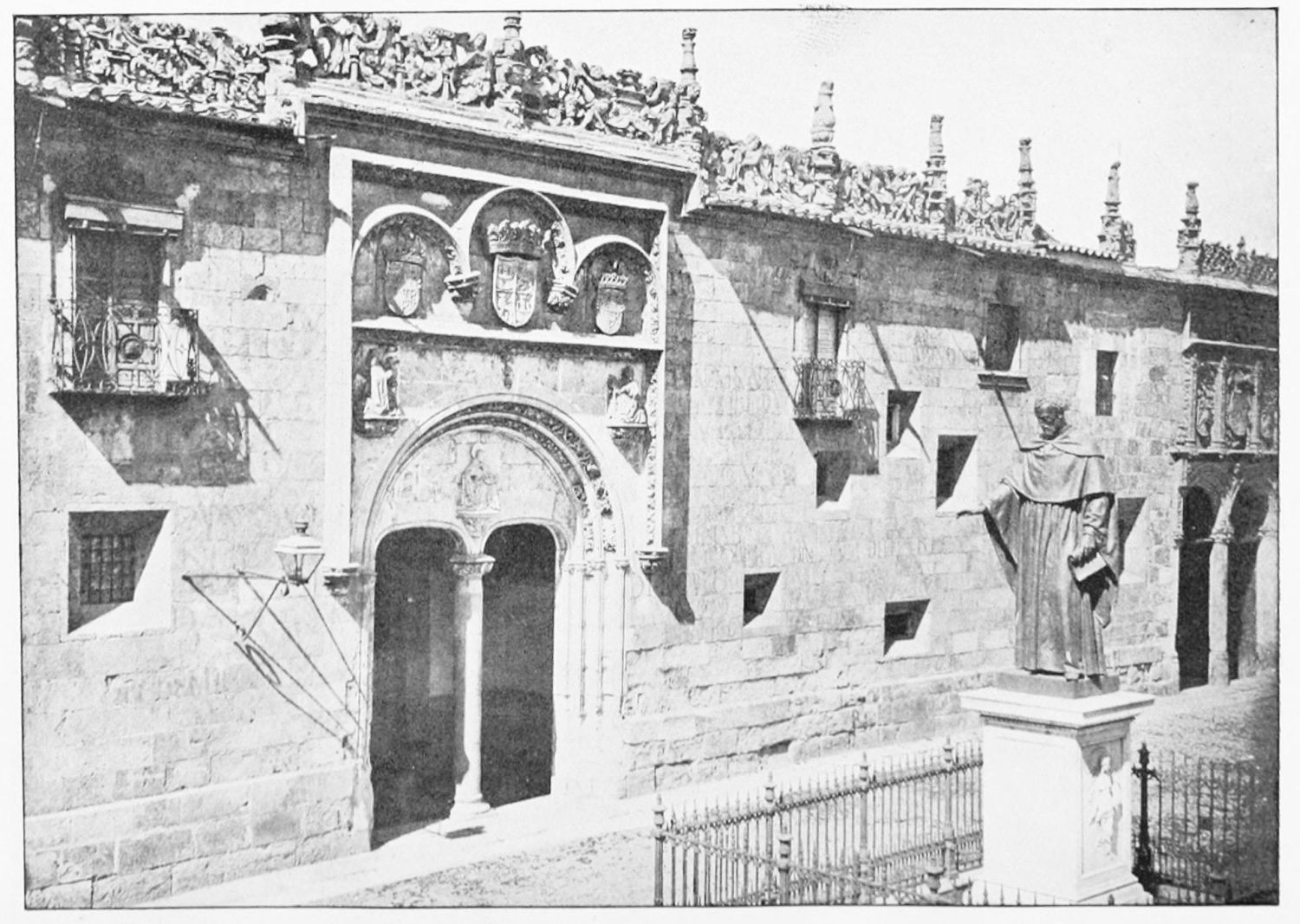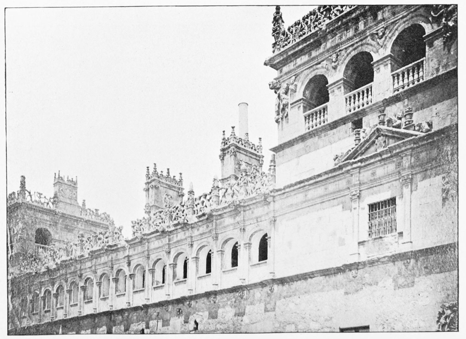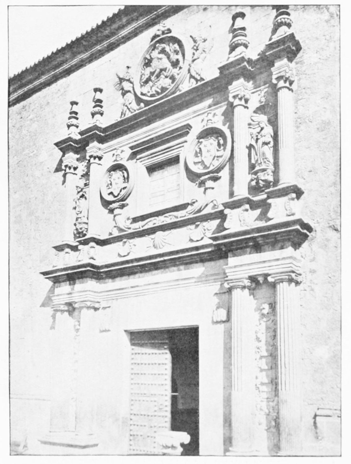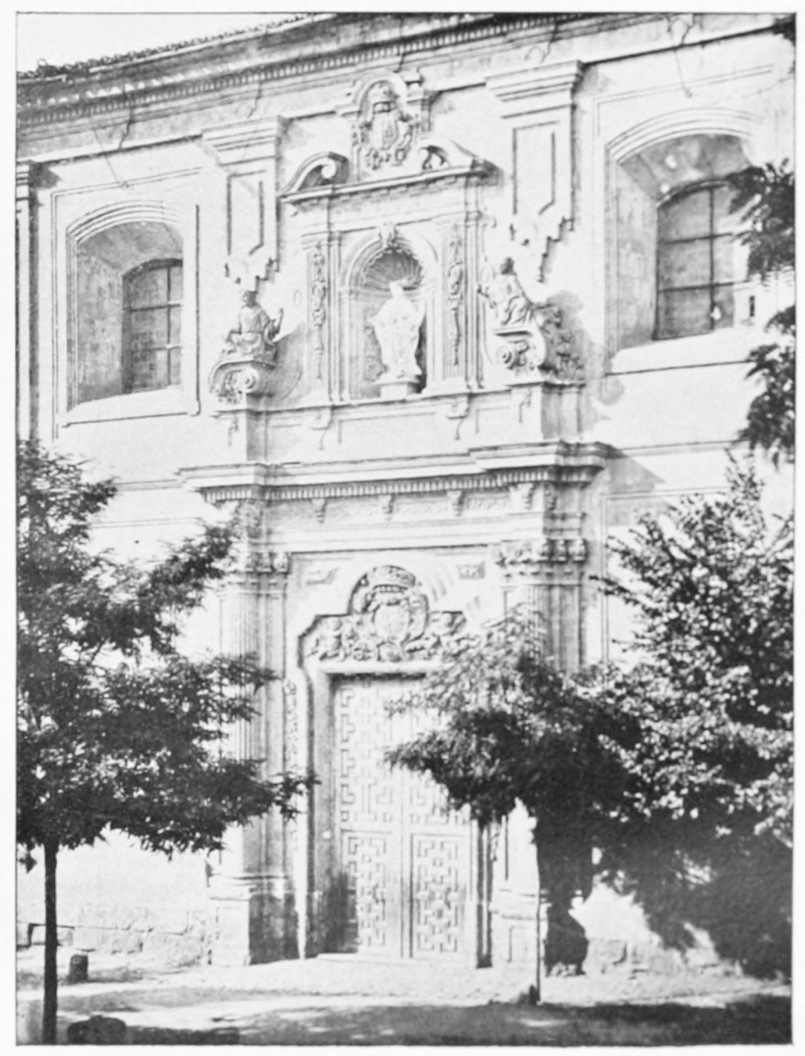 The grand façade of the old convent, extending to the river bank, is divided into two stories, the lower characterised by semicircular windows between pilasters in the plateresque style, and separated by niches; the upper by rectangular windows with balconies, disposed between columns, and likewise separated by niches in pairs. The frieze beneath the lower row of windows is adorned by a series of medallions, displaying the heads of mythological and historical worthies, Gentiles and Christians, ancients and moderns, most oddly assorted. With Priam and Hector, Hannibal and Cæsar, we find Charlemagne and the Cid, Charles V. and Philip II., with Lucretia, Judith and Isabel the Catholic. The busts to the left of the doorway are those of the grand masters of the Order of Santiago. The{29} doorway itself is a very unhappy combination of the plateresque and baroque styles, but the statue of Fame surmounting it is not devoid of grace and dignity. The balconies and windows facing the river date from the eighteenth century.
