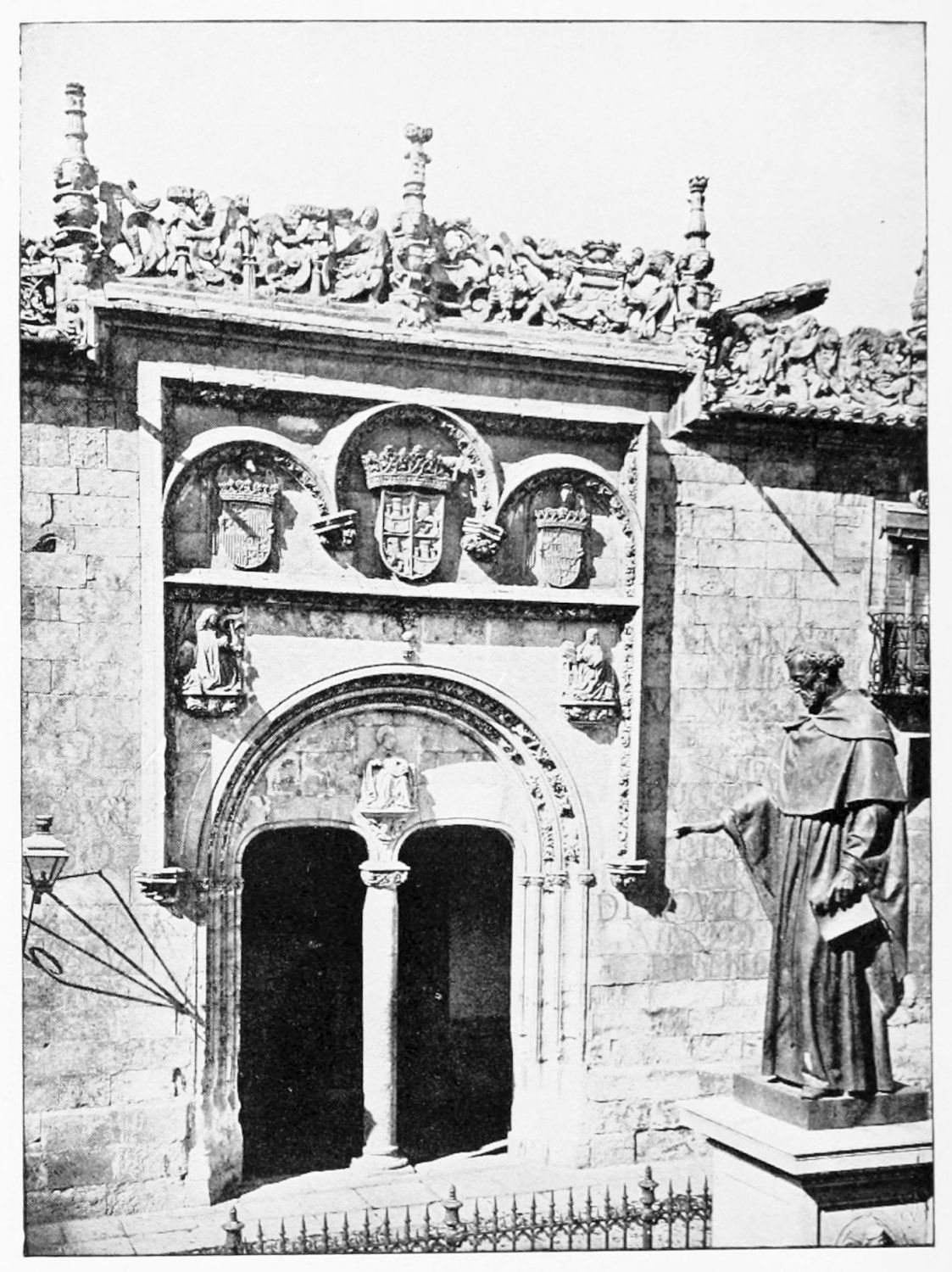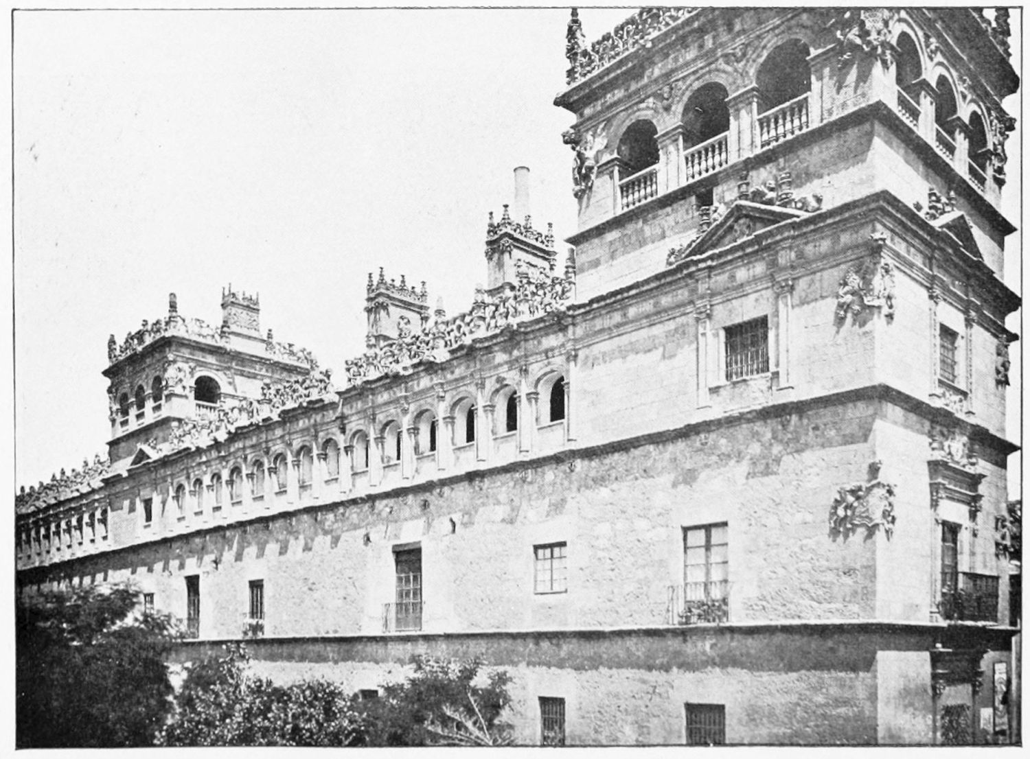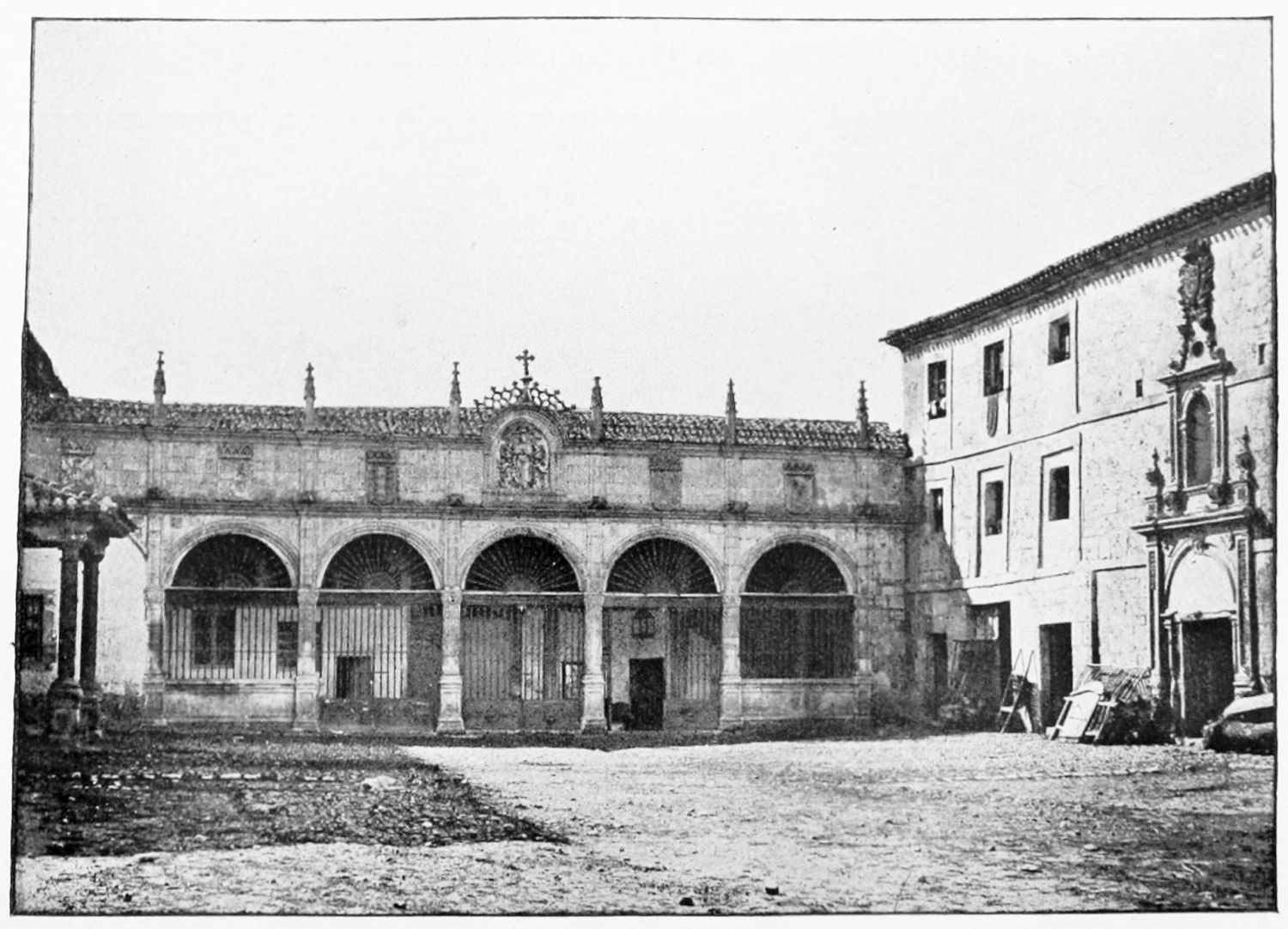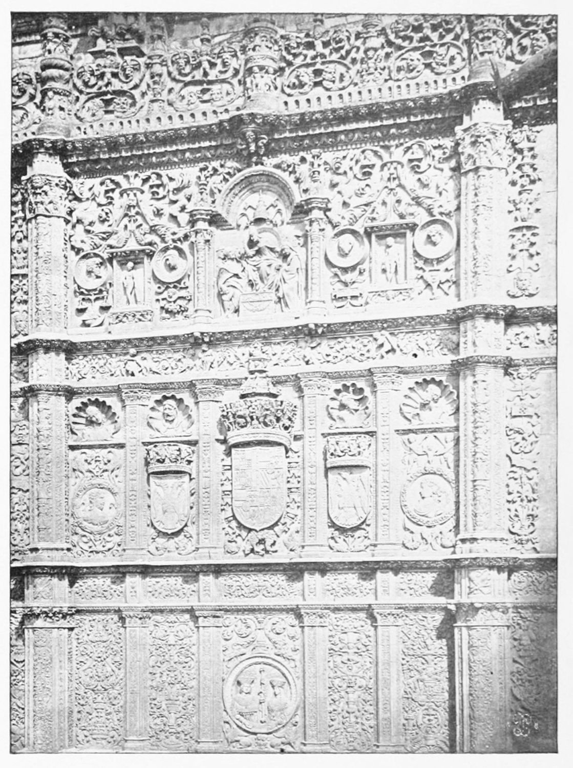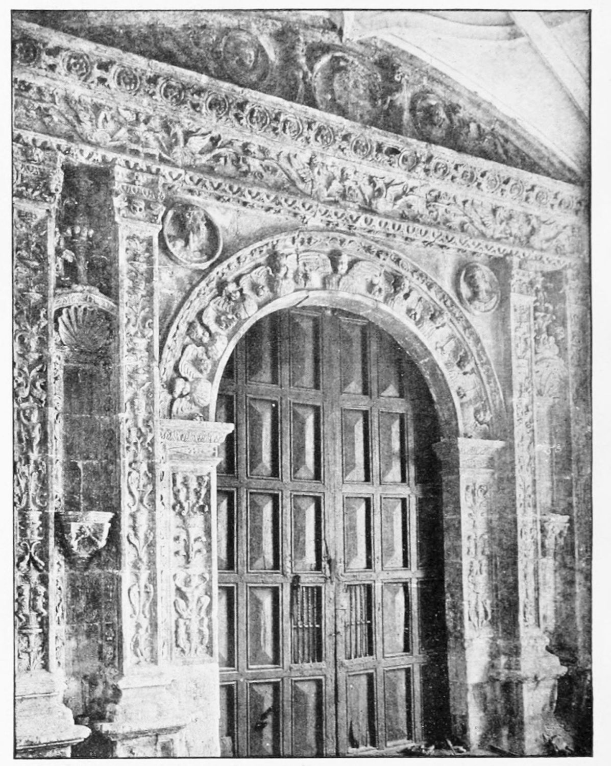 The grand façade of the old convent, extending to the river bank, is divided into two stories, the lower characterised by semicircular windows between pilasters in the plateresque style, and separated by niches; the upper by rectangular windows with balconies, disposed between columns, and likewise separated by niches in pairs. The frieze beneath the lower row of windows is adorned by a series of medallions, displaying the heads of mythological and historical worthies, Gentiles and Christians, ancients and moderns, most oddly assorted. With Priam and Hector, Hannibal and Cæsar, we find Charlemagne and the Cid, Charles V. and Philip II., with Lucretia, Judith and Isabel the Catholic. The busts to the left of the doorway are those of the grand masters of the Order of Santiago. The{29} doorway itself is a very unhappy combination of the plateresque and baroque styles, but the statue of Fame surmounting it is not devoid of grace and dignity. The balconies and windows facing the river date from the eighteenth century.