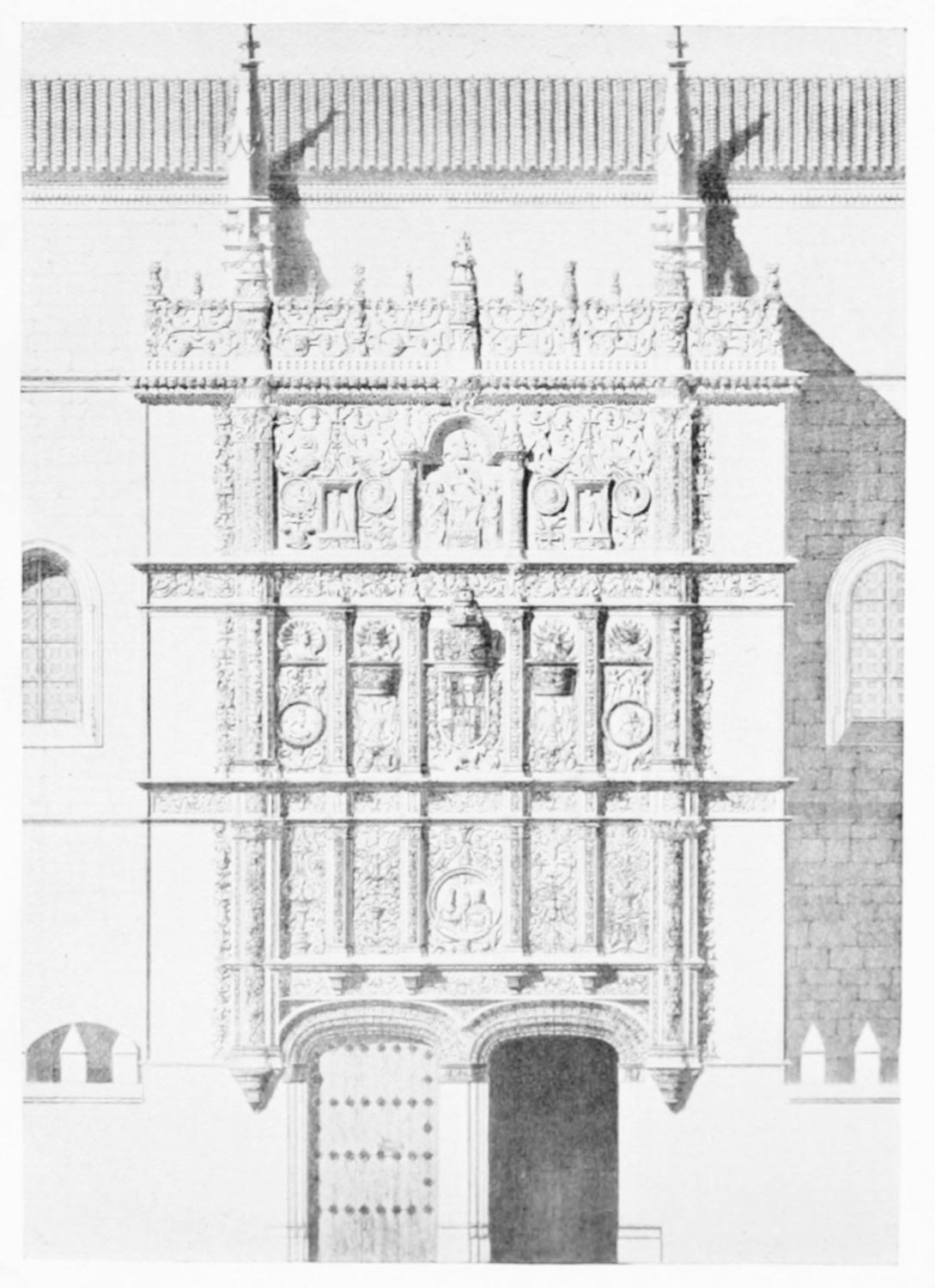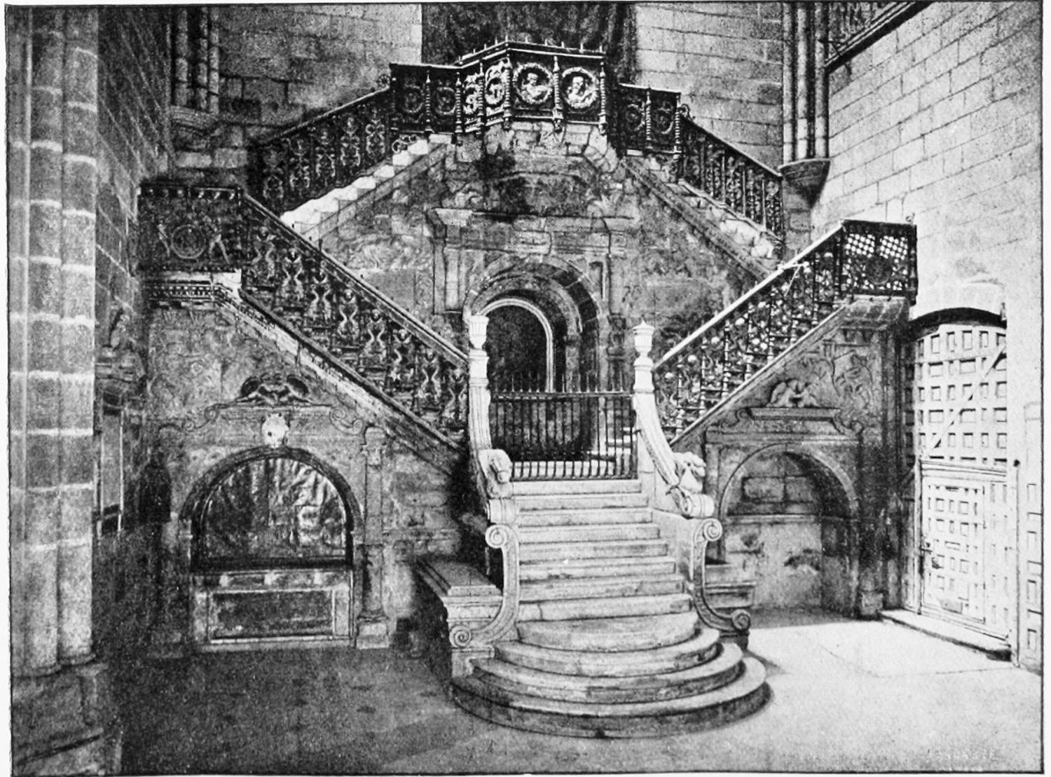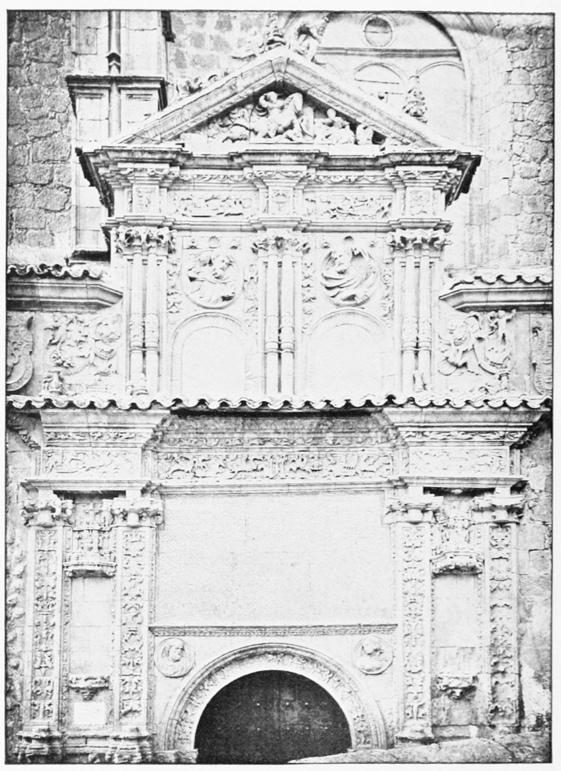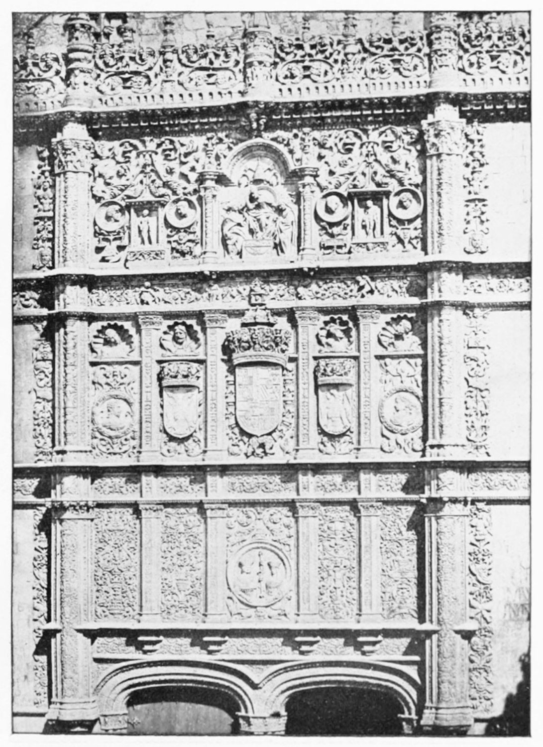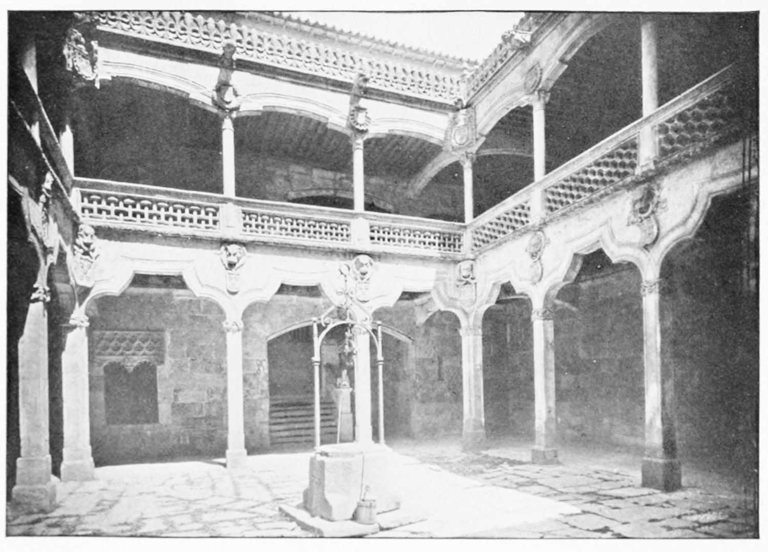 The grand façade of the old convent, extending to the river bank, is divided into two stories, the lower characterised by semicircular windows between pilasters in the plateresque style, and separated by niches; the upper by rectangular windows with balconies, disposed between columns, and likewise separated by niches in pairs. The frieze beneath the lower row of windows is adorned by a series of medallions, displaying the heads of mythological and historical worthies, Gentiles and Christians, ancients and moderns, most oddly assorted. With Priam and Hector, Hannibal and Cæsar, we find Charlemagne and the Cid, Charles V. and Philip II., with Lucretia, Judith and Isabel the Catholic. The busts to the left of the doorway are those of the grand masters of the Order of Santiago. The{29} doorway itself is a very unhappy combination of the plateresque and baroque styles, but the statue of Fame surmounting it is not devoid of grace and dignity. The balconies and windows facing the river date from the eighteenth century.