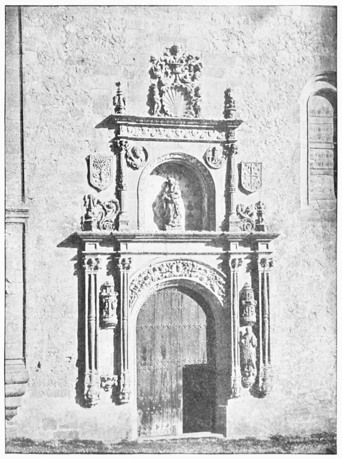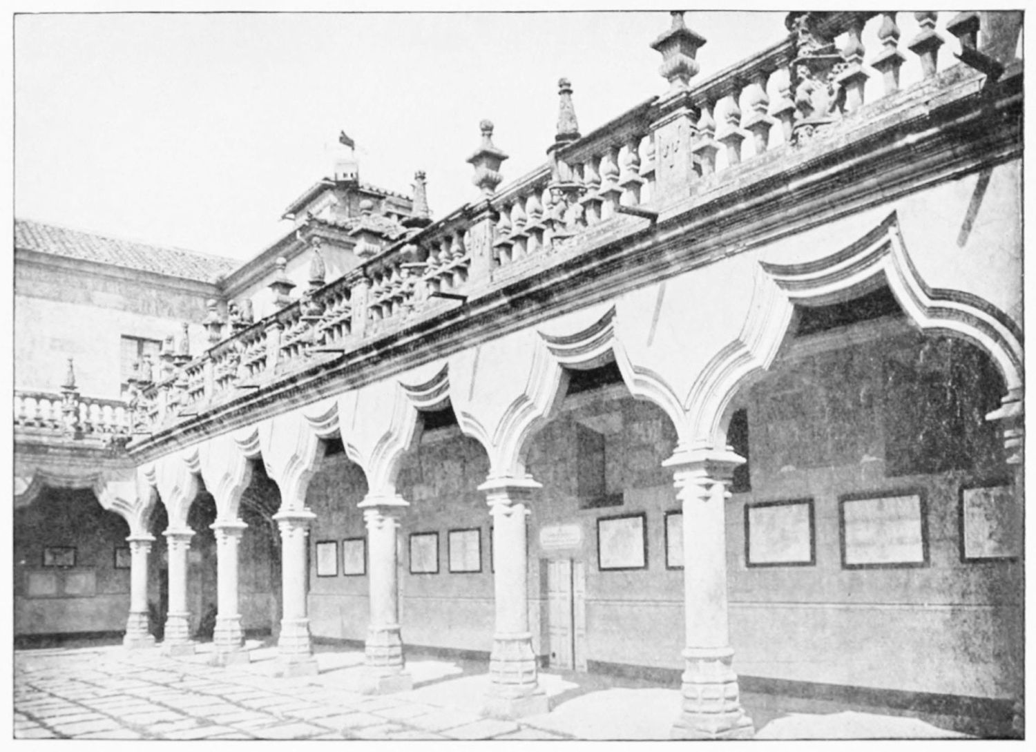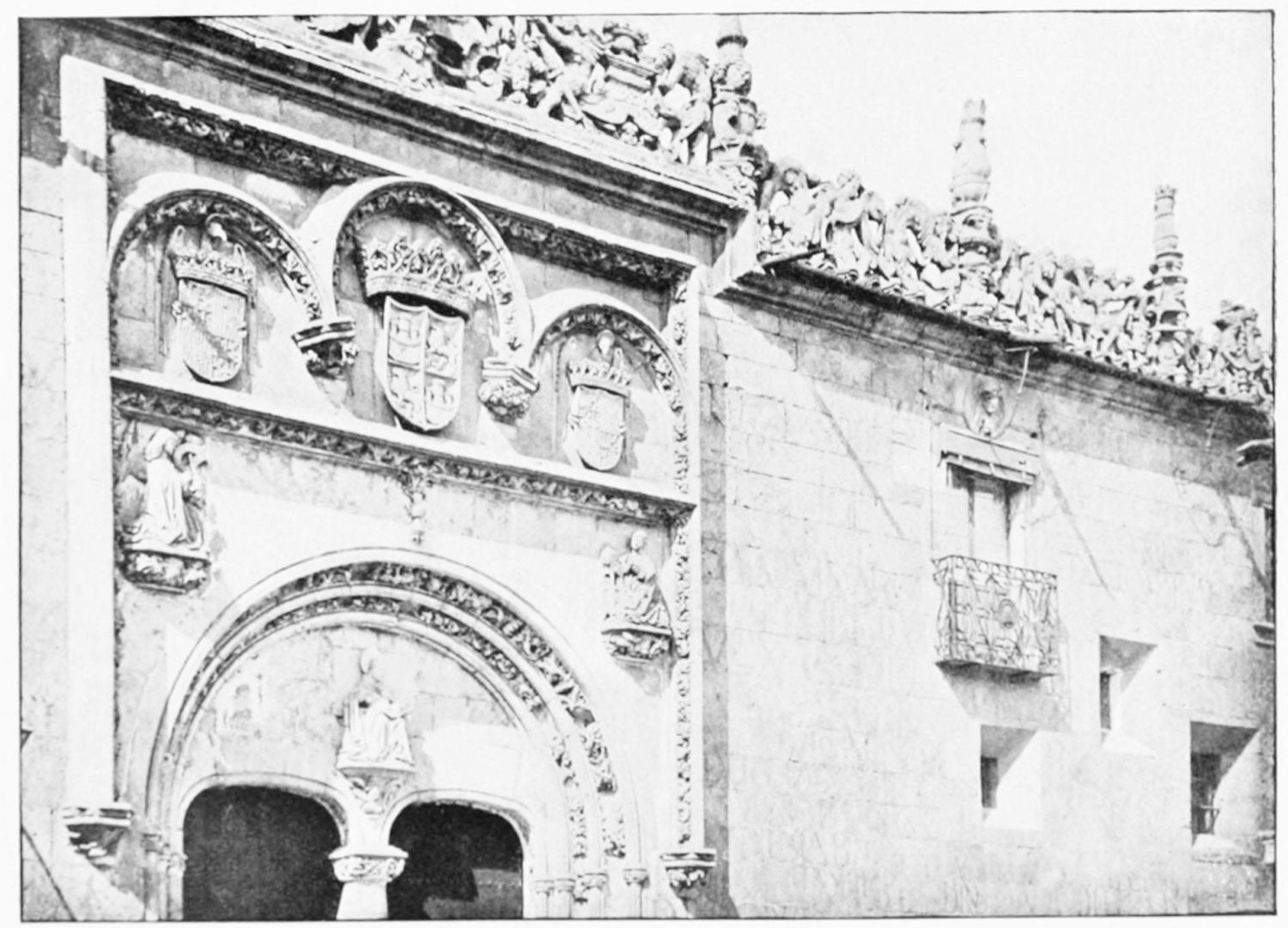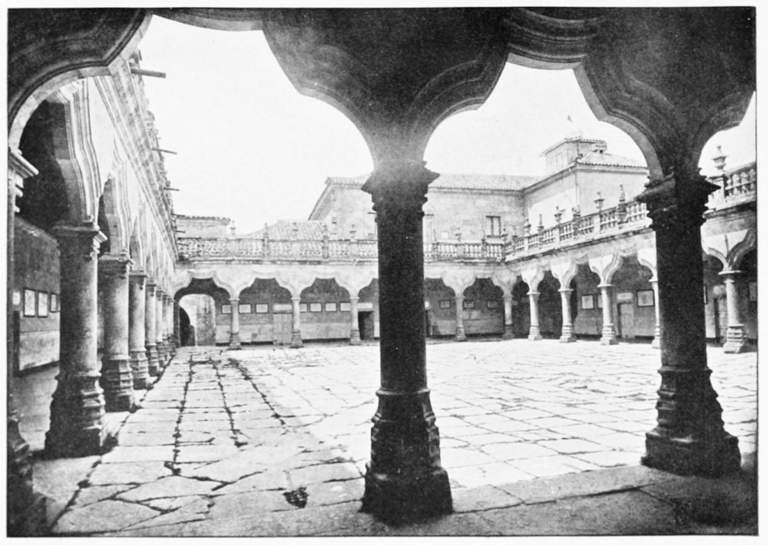 The grand façade of the old convent, extending to the river bank, is divided into two stories, the lower characterised by semicircular windows between pilasters in the plateresque style, and separated by niches; the upper by rectangular windows with balconies, disposed between columns, and likewise separated by niches in pairs. The frieze beneath the lower row of windows is adorned by a series of medallions, displaying the heads of mythological and historical worthies, Gentiles and Christians, ancients and moderns, most oddly assorted. With Priam and Hector, Hannibal and Cæsar, we find Charlemagne and the Cid, Charles V. and Philip II., with Lucretia, Judith and Isabel the Catholic. The busts to the left of the doorway are those of the grand masters of the Order of Santiago. The{29} doorway itself is a very unhappy combination of the plateresque and baroque styles, but the statue of Fame surmounting it is not devoid of grace and dignity. The balconies and windows facing the river date from the eighteenth century.