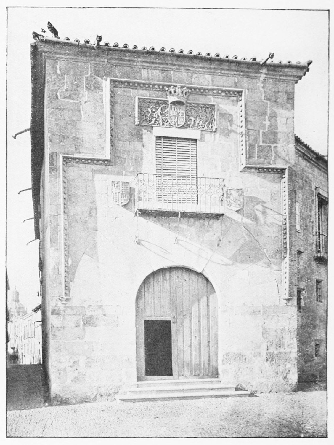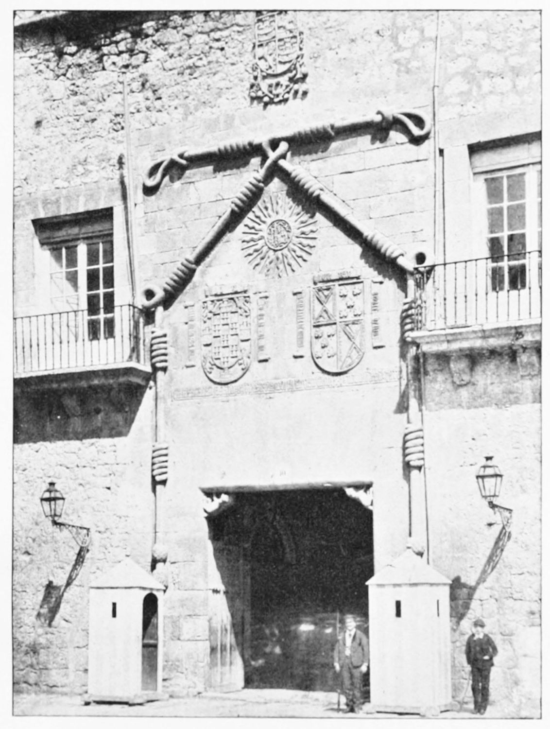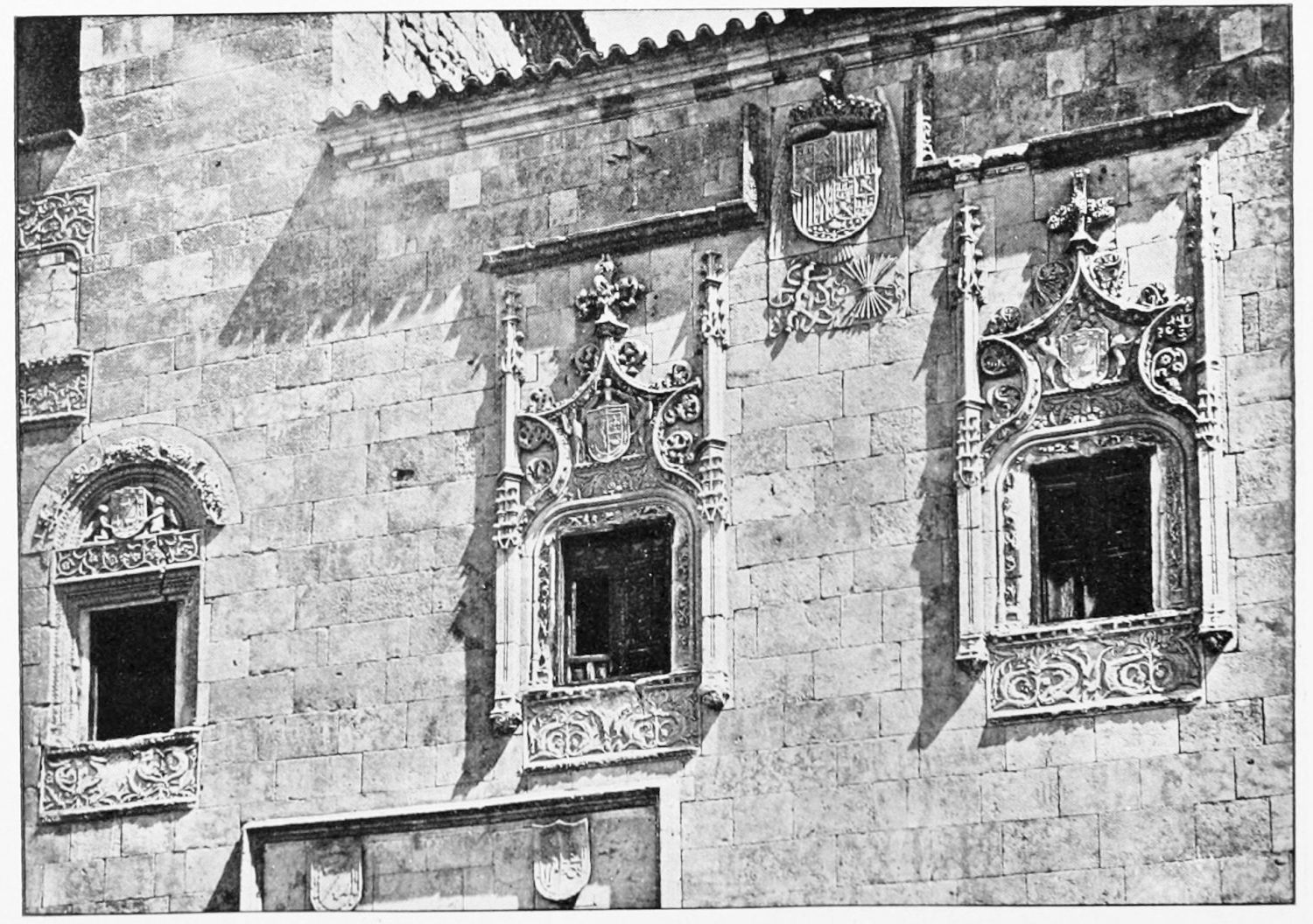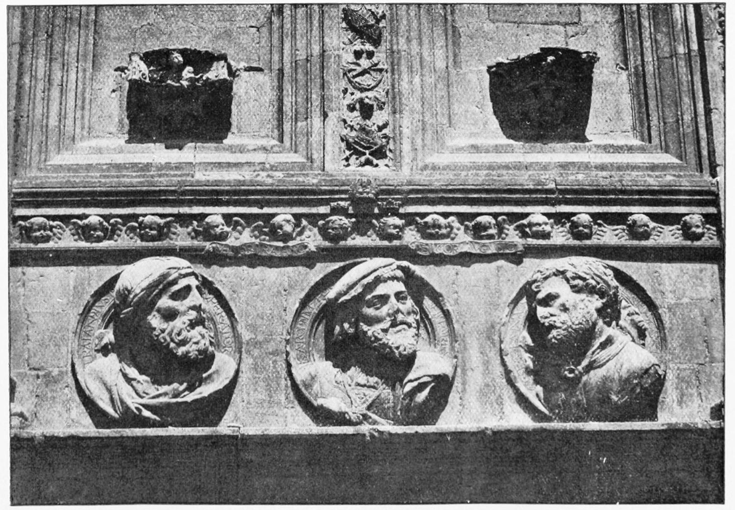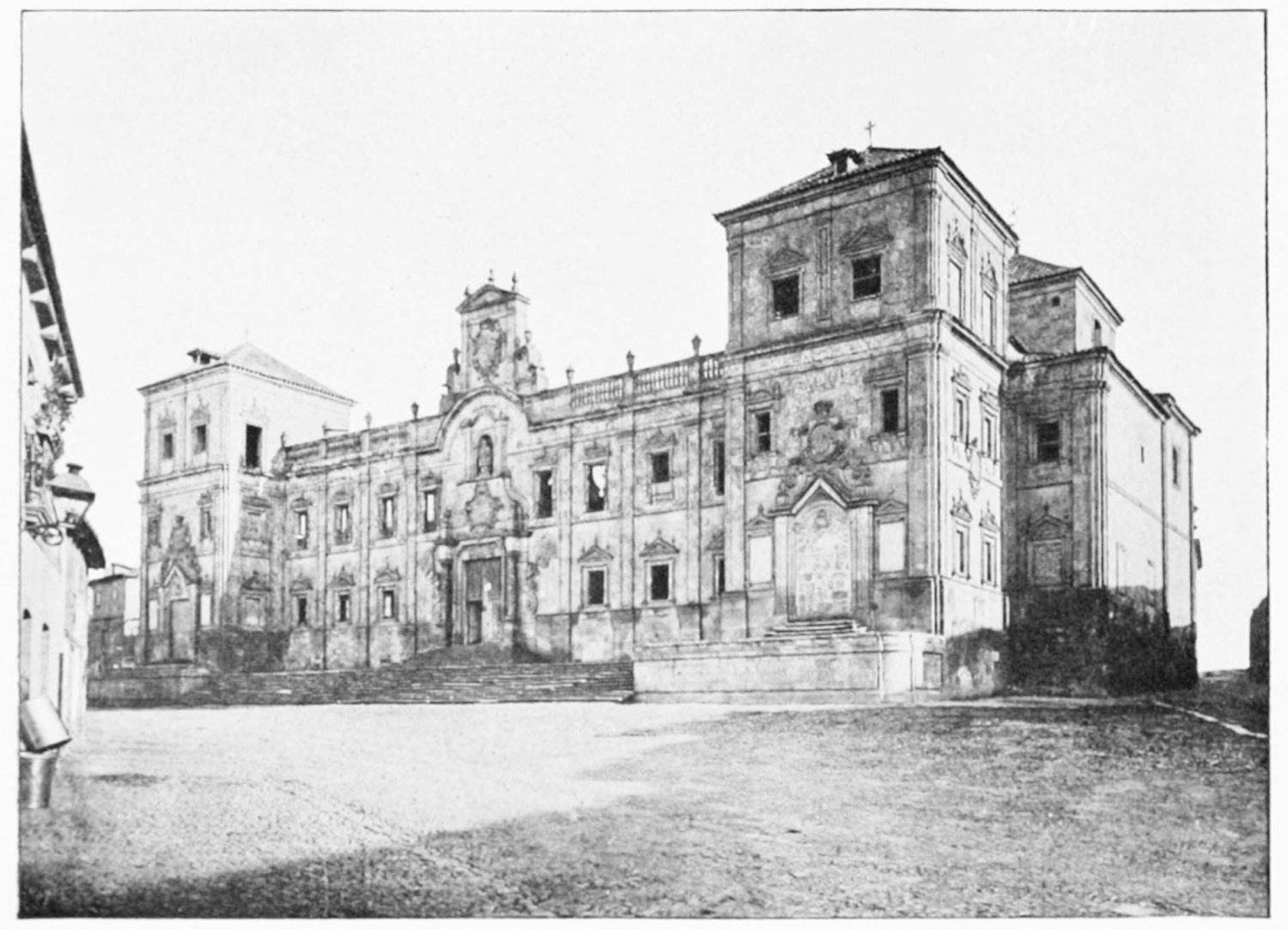 The grand façade of the old convent, extending to the river bank, is divided into two stories, the lower characterised by semicircular windows between pilasters in the plateresque style, and separated by niches; the upper by rectangular windows with balconies, disposed between columns, and likewise separated by niches in pairs. The frieze beneath the lower row of windows is adorned by a series of medallions, displaying the heads of mythological and historical worthies, Gentiles and Christians, ancients and moderns, most oddly assorted. With Priam and Hector, Hannibal and Cæsar, we find Charlemagne and the Cid, Charles V. and Philip II., with Lucretia, Judith and Isabel the Catholic. The busts to the left of the doorway are those of the grand masters of the Order of Santiago. The{29} doorway itself is a very unhappy combination of the plateresque and baroque styles, but the statue of Fame surmounting it is not devoid of grace and dignity. The balconies and windows facing the river date from the eighteenth century.