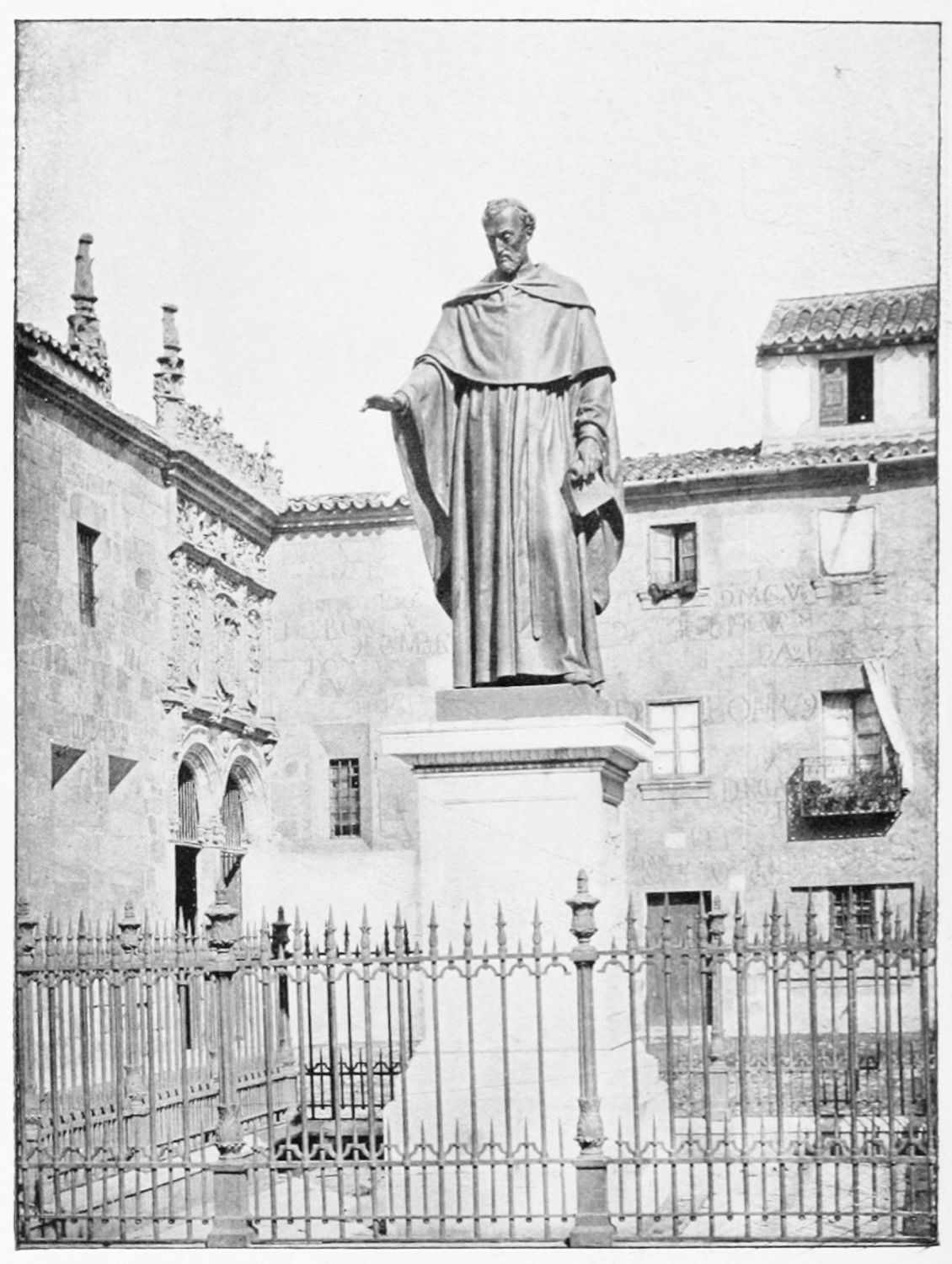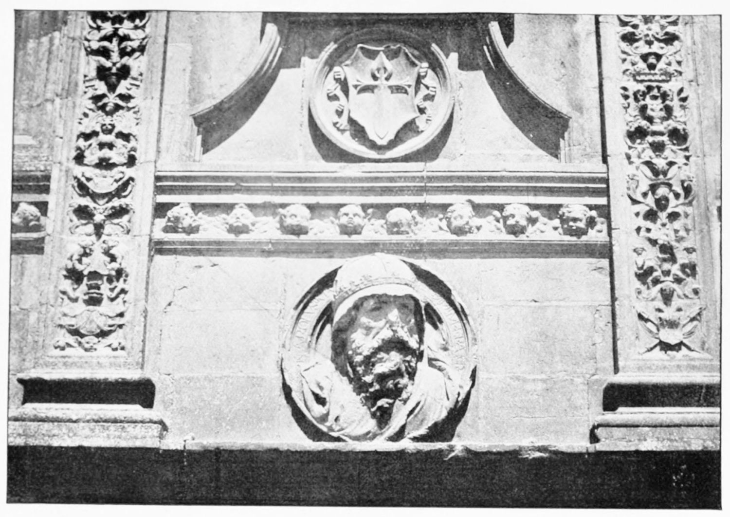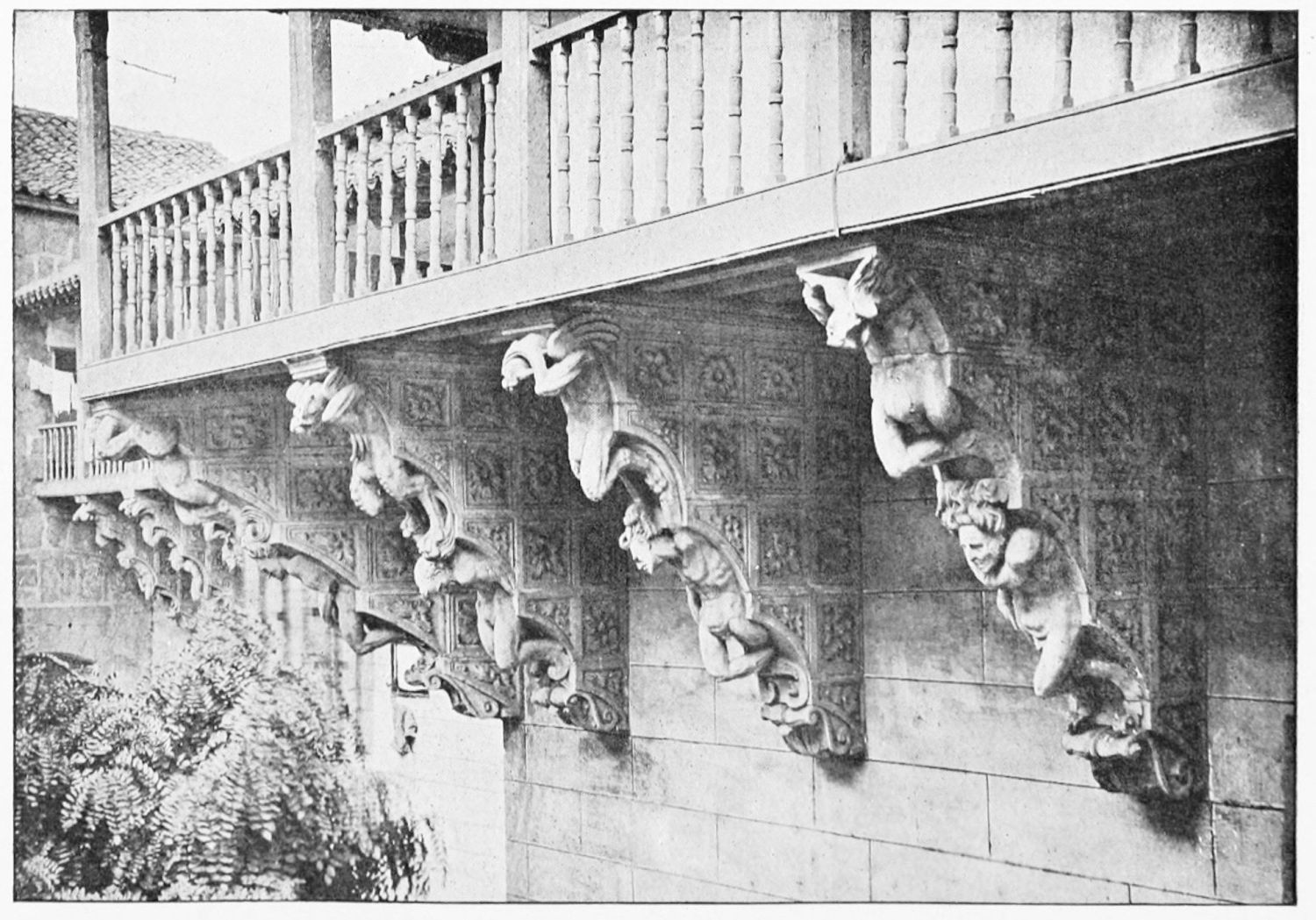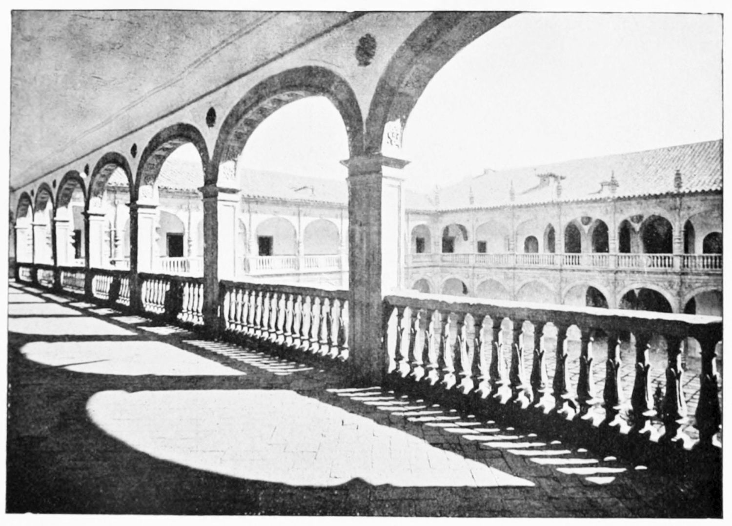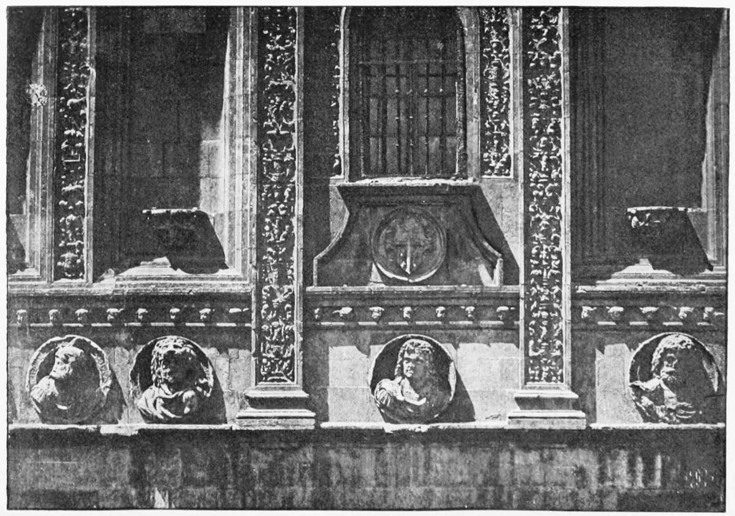 The grand façade of the old convent, extending to the river bank, is divided into two stories, the lower characterised by semicircular windows between pilasters in the plateresque style, and separated by niches; the upper by rectangular windows with balconies, disposed between columns, and likewise separated by niches in pairs. The frieze beneath the lower row of windows is adorned by a series of medallions, displaying the heads of mythological and historical worthies, Gentiles and Christians, ancients and moderns, most oddly assorted. With Priam and Hector, Hannibal and Cæsar, we find Charlemagne and the Cid, Charles V. and Philip II., with Lucretia, Judith and Isabel the Catholic. The busts to the left of the doorway are those of the grand masters of the Order of Santiago. The{29} doorway itself is a very unhappy combination of the plateresque and baroque styles, but the statue of Fame surmounting it is not devoid of grace and dignity. The balconies and windows facing the river date from the eighteenth century.