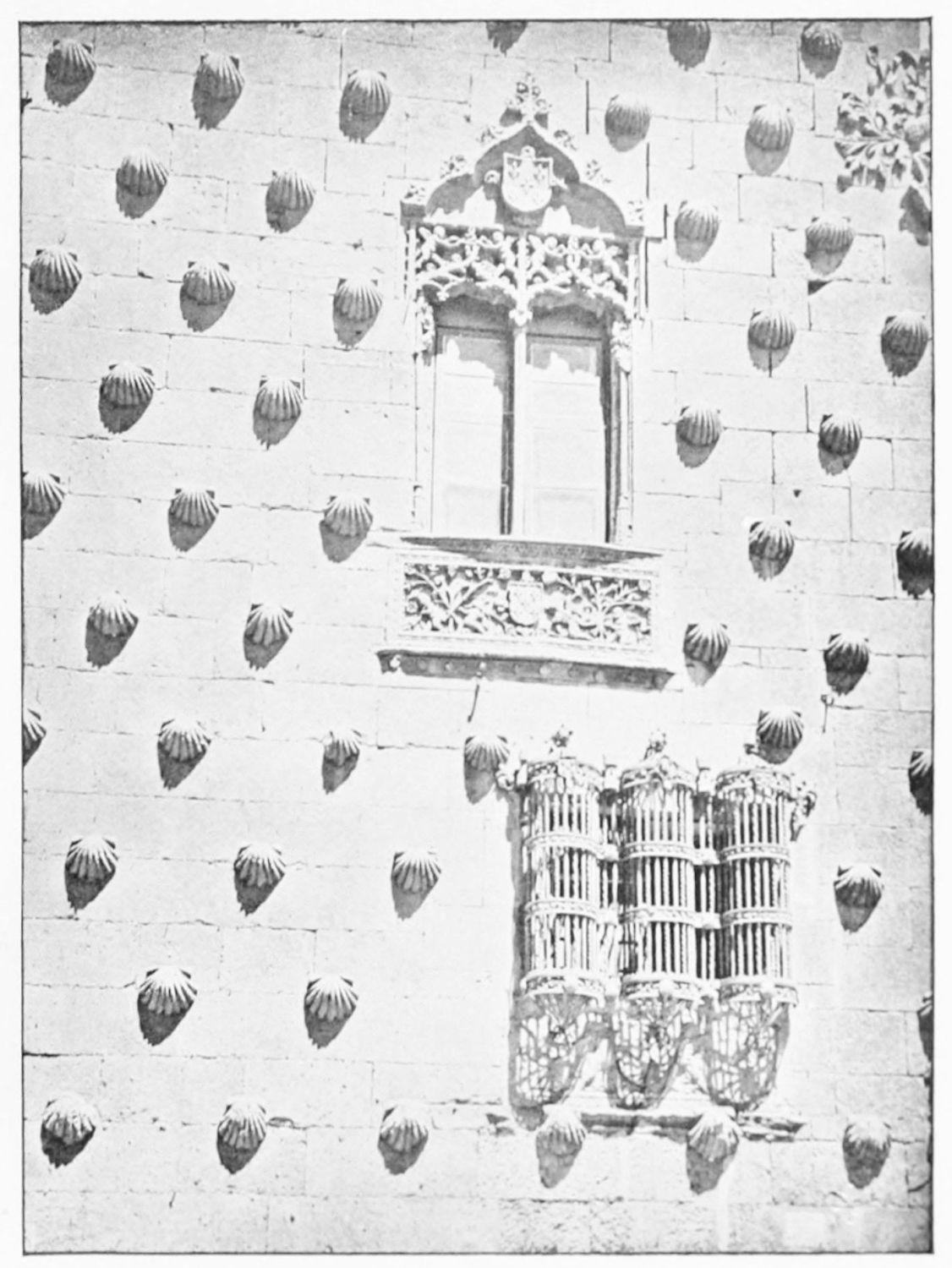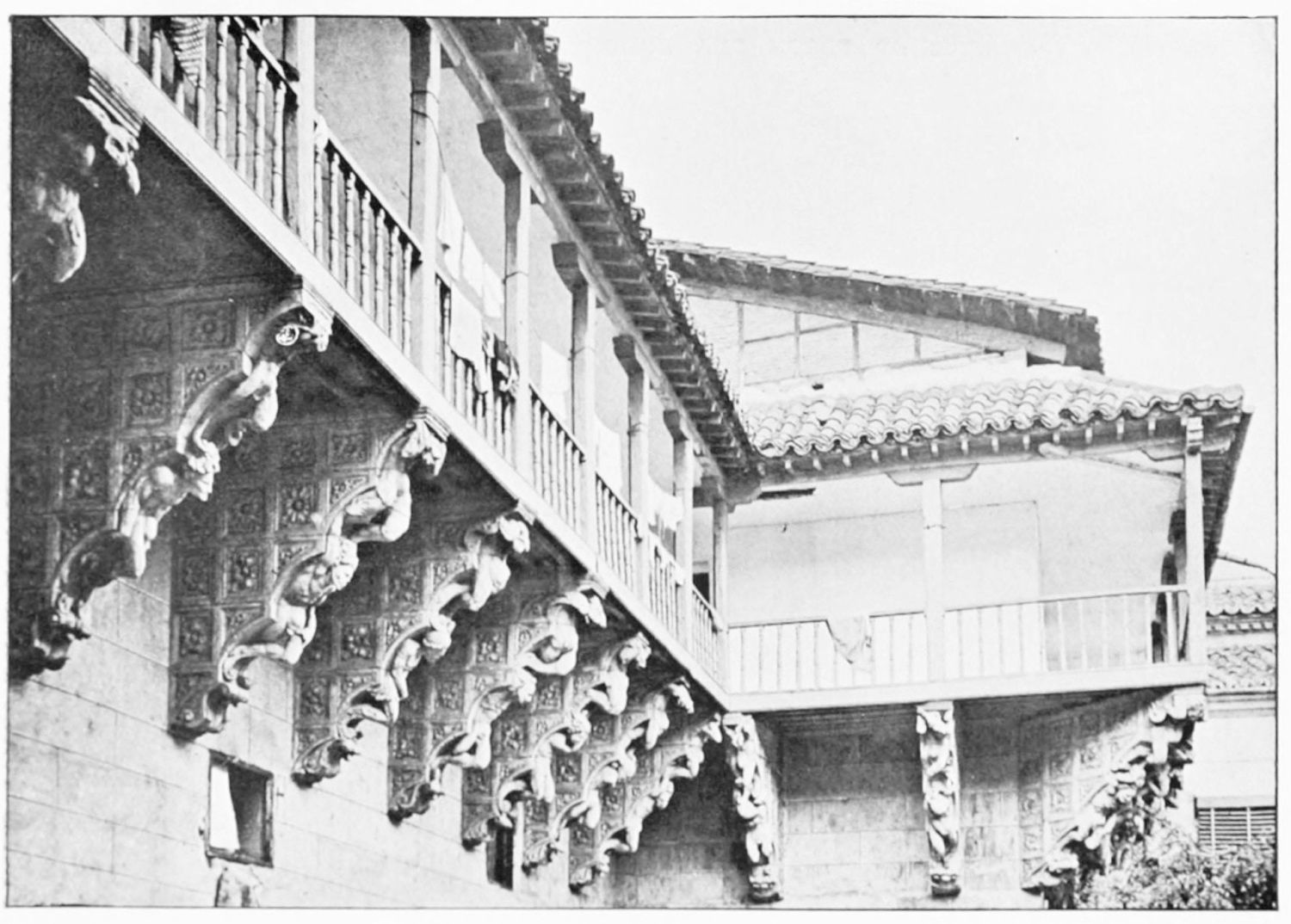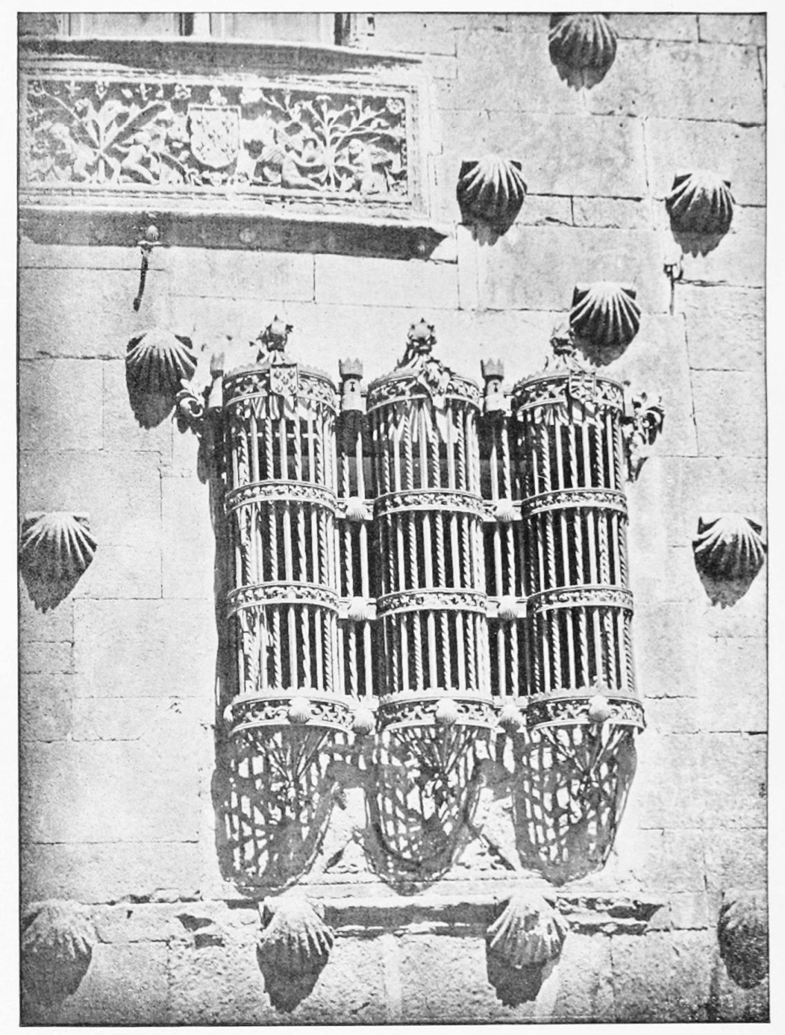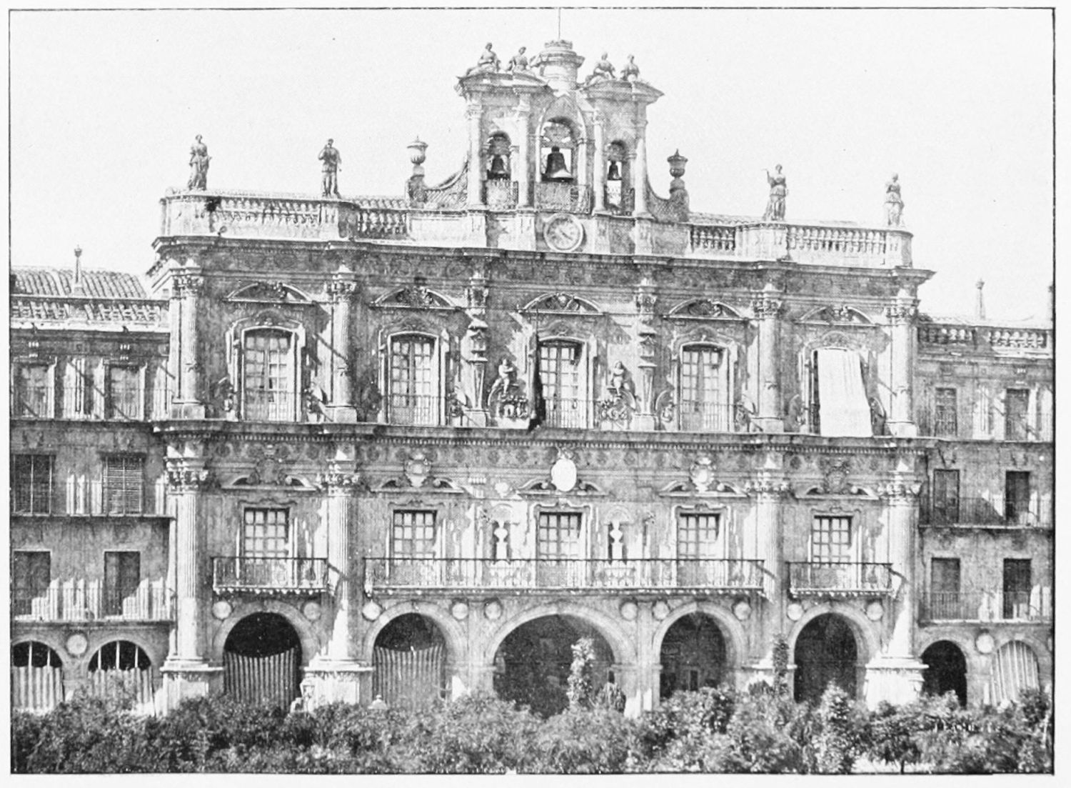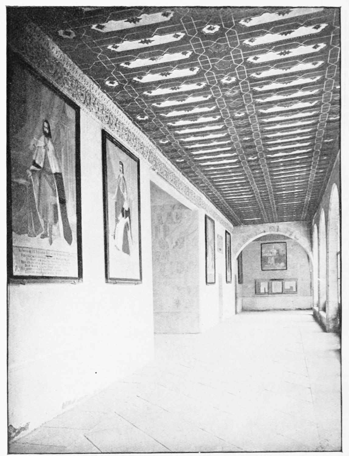 The grand façade of the old convent, extending to the river bank, is divided into two stories, the lower characterised by semicircular windows between pilasters in the plateresque style, and separated by niches; the upper by rectangular windows with balconies, disposed between columns, and likewise separated by niches in pairs. The frieze beneath the lower row of windows is adorned by a series of medallions, displaying the heads of mythological and historical worthies, Gentiles and Christians, ancients and moderns, most oddly assorted. With Priam and Hector, Hannibal and Cæsar, we find Charlemagne and the Cid, Charles V. and Philip II., with Lucretia, Judith and Isabel the Catholic. The busts to the left of the doorway are those of the grand masters of the Order of Santiago. The{29} doorway itself is a very unhappy combination of the plateresque and baroque styles, but the statue of Fame surmounting it is not devoid of grace and dignity. The balconies and windows facing the river date from the eighteenth century.