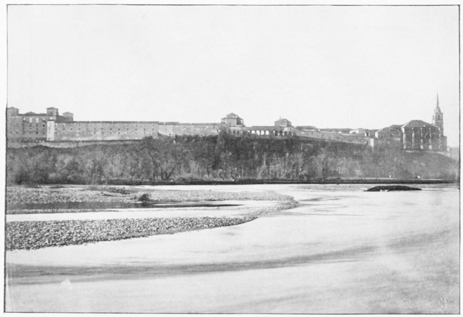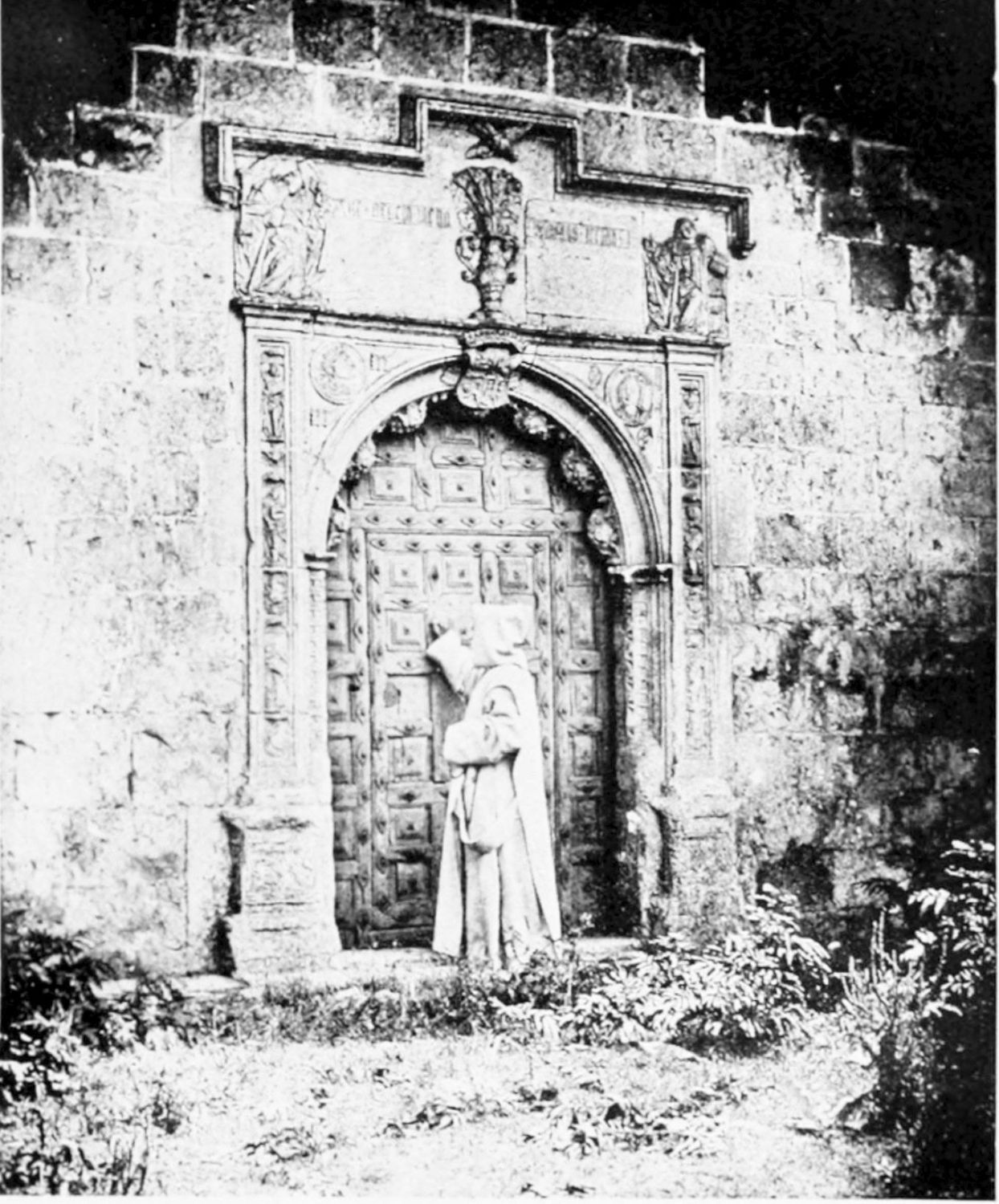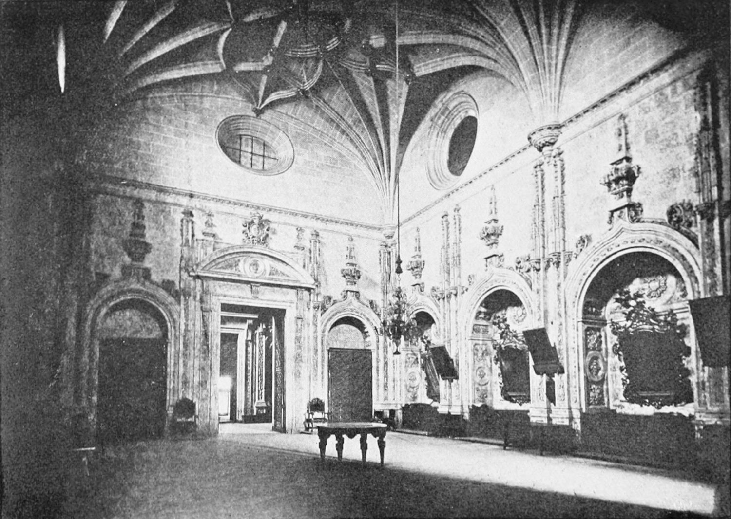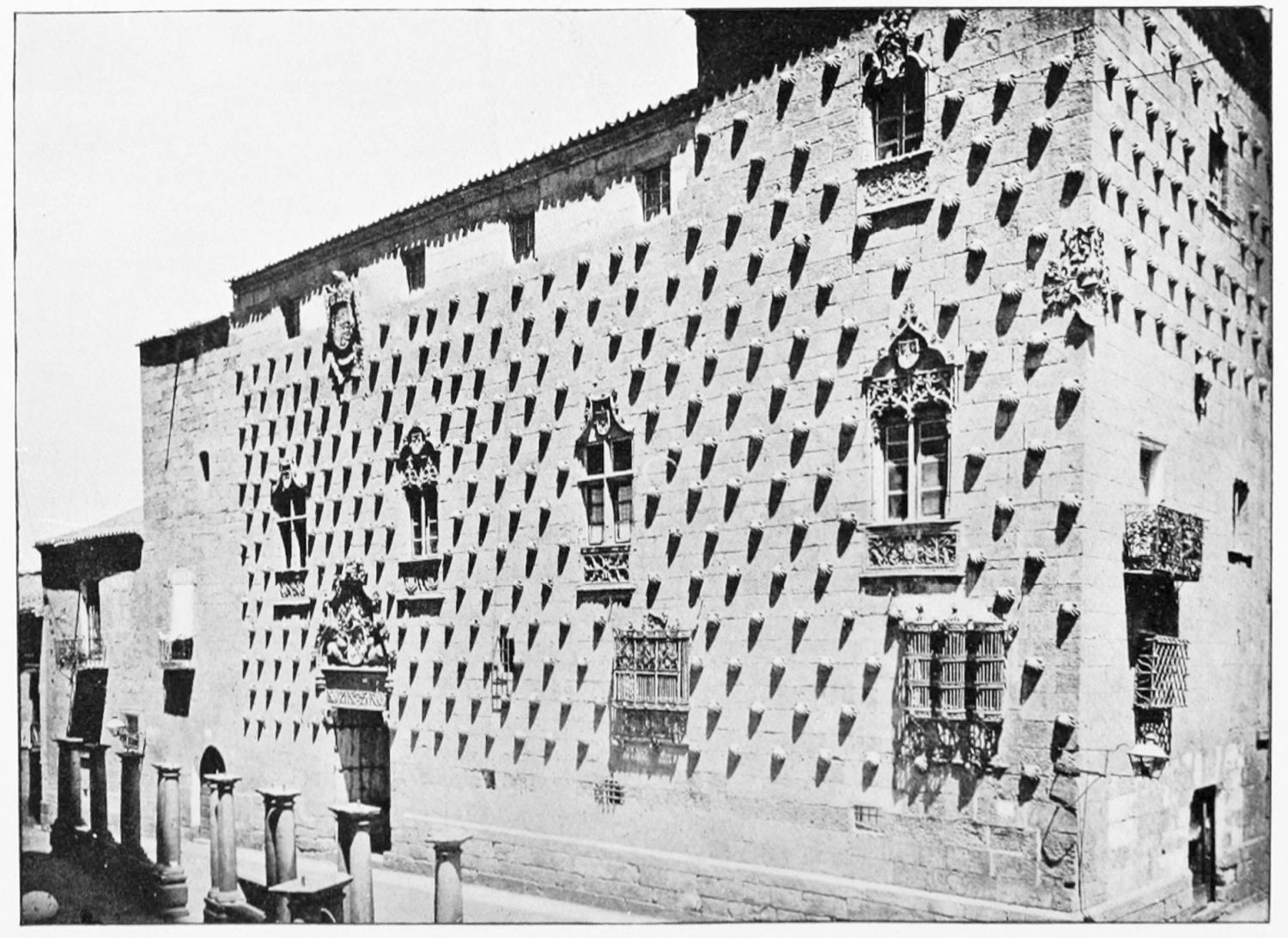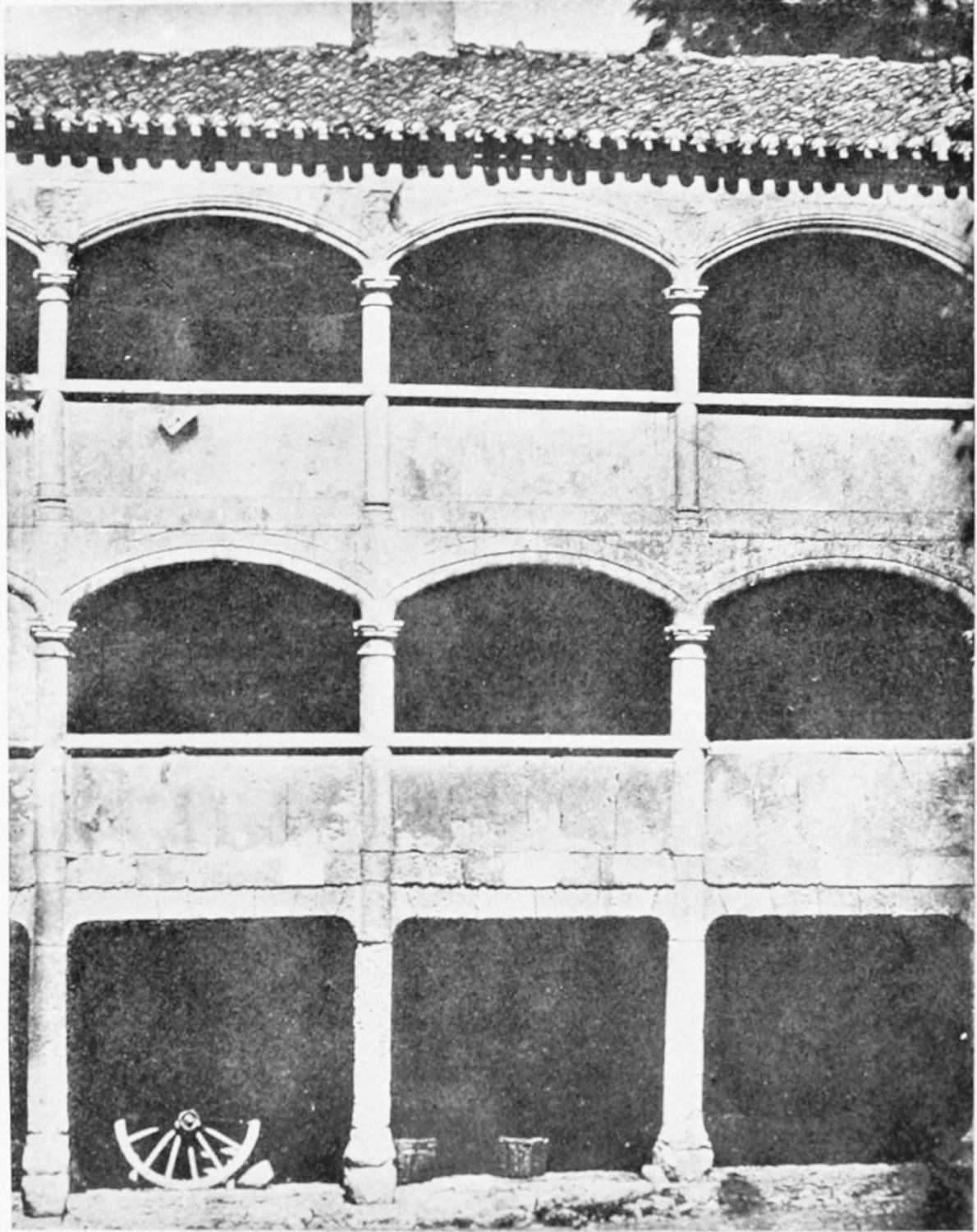 The grand façade of the old convent, extending to the river bank, is divided into two stories, the lower characterised by semicircular windows between pilasters in the plateresque style, and separated by niches; the upper by rectangular windows with balconies, disposed between columns, and likewise separated by niches in pairs. The frieze beneath the lower row of windows is adorned by a series of medallions, displaying the heads of mythological and historical worthies, Gentiles and Christians, ancients and moderns, most oddly assorted. With Priam and Hector, Hannibal and Cæsar, we find Charlemagne and the Cid, Charles V. and Philip II., with Lucretia, Judith and Isabel the Catholic. The busts to the left of the doorway are those of the grand masters of the Order of Santiago. The{29} doorway itself is a very unhappy combination of the plateresque and baroque styles, but the statue of Fame surmounting it is not devoid of grace and dignity. The balconies and windows facing the river date from the eighteenth century.