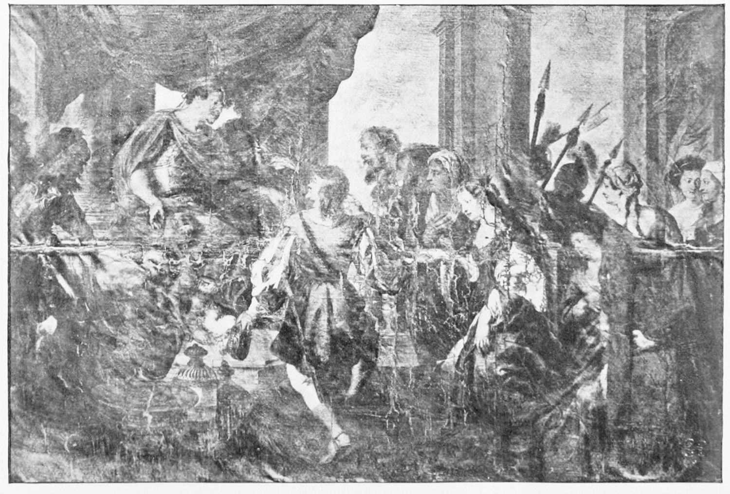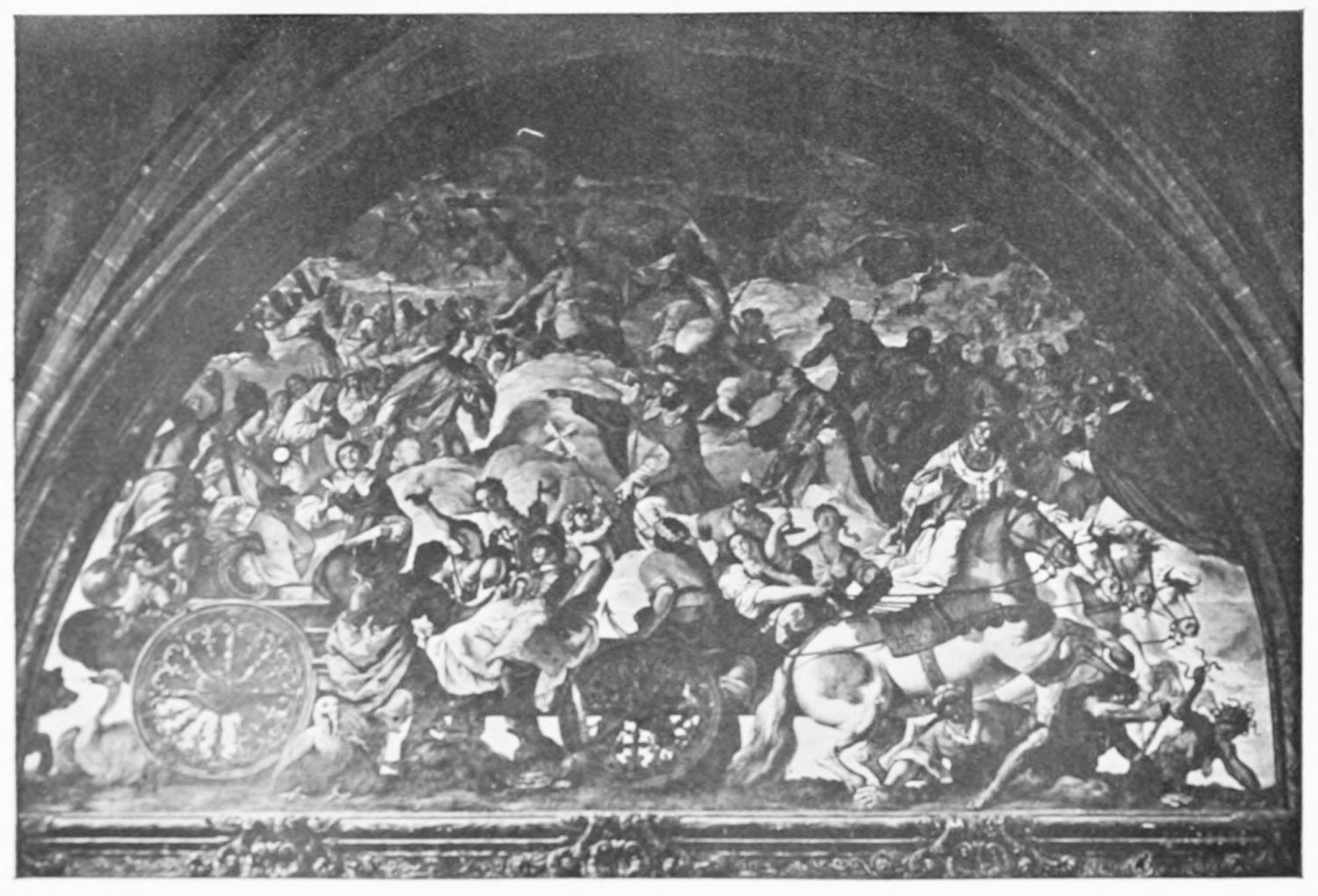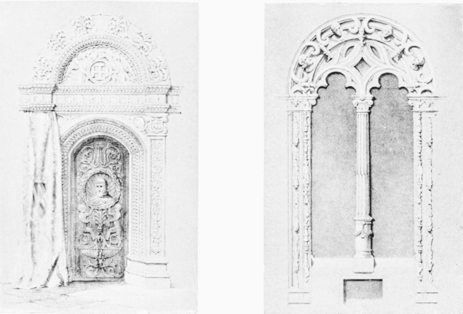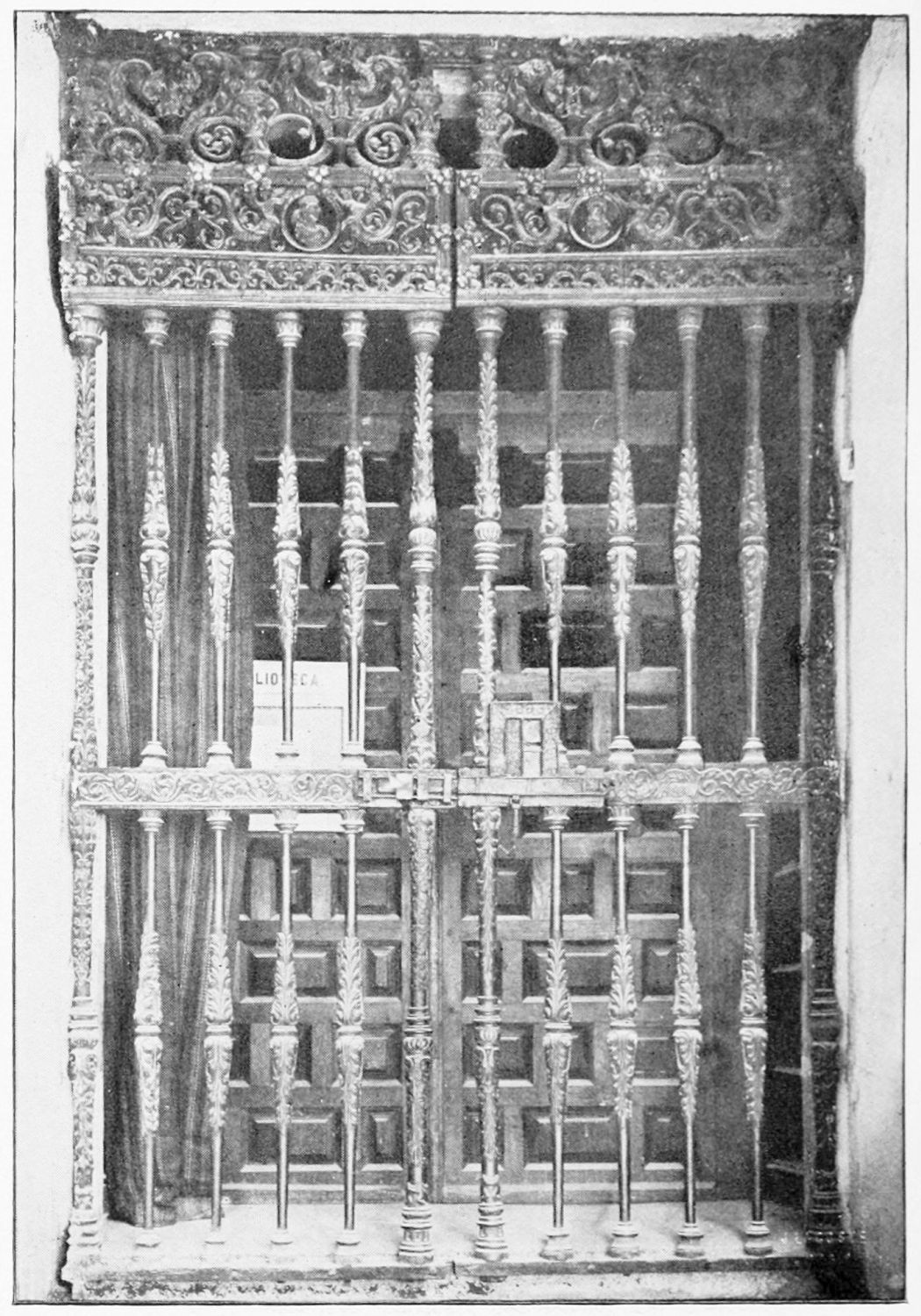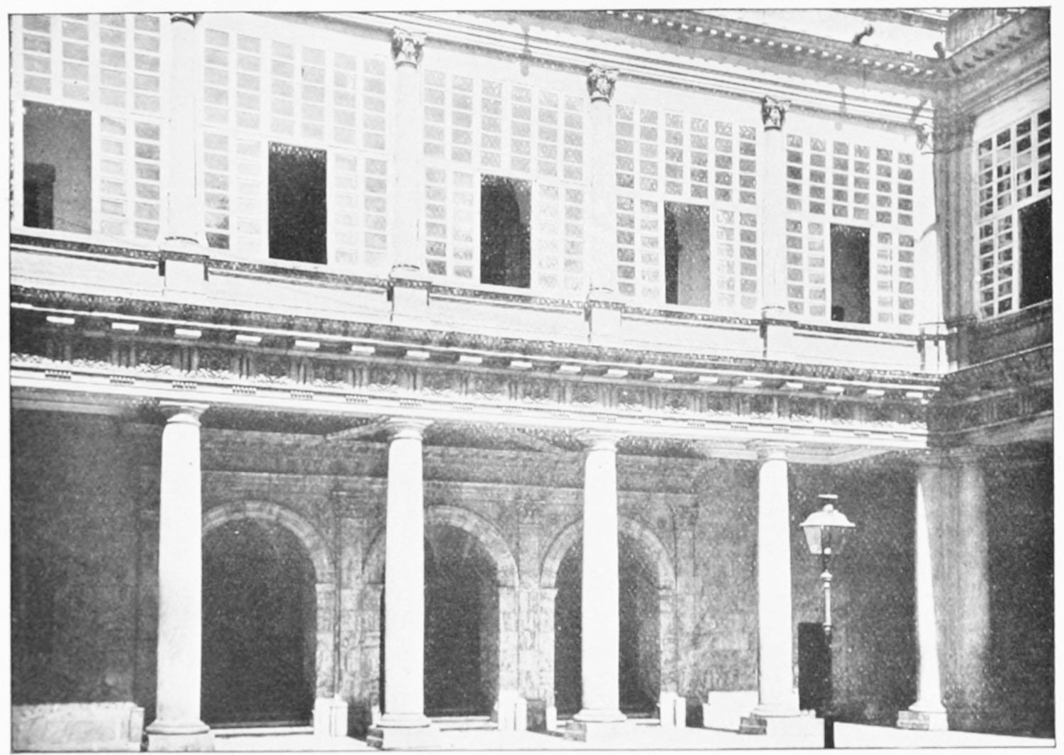 The grand façade of the old convent, extending to the river bank, is divided into two stories, the lower characterised by semicircular windows between pilasters in the plateresque style, and separated by niches; the upper by rectangular windows with balconies, disposed between columns, and likewise separated by niches in pairs. The frieze beneath the lower row of windows is adorned by a series of medallions, displaying the heads of mythological and historical worthies, Gentiles and Christians, ancients and moderns, most oddly assorted. With Priam and Hector, Hannibal and Cæsar, we find Charlemagne and the Cid, Charles V. and Philip II., with Lucretia, Judith and Isabel the Catholic. The busts to the left of the doorway are those of the grand masters of the Order of Santiago. The{29} doorway itself is a very unhappy combination of the plateresque and baroque styles, but the statue of Fame surmounting it is not devoid of grace and dignity. The balconies and windows facing the river date from the eighteenth century.