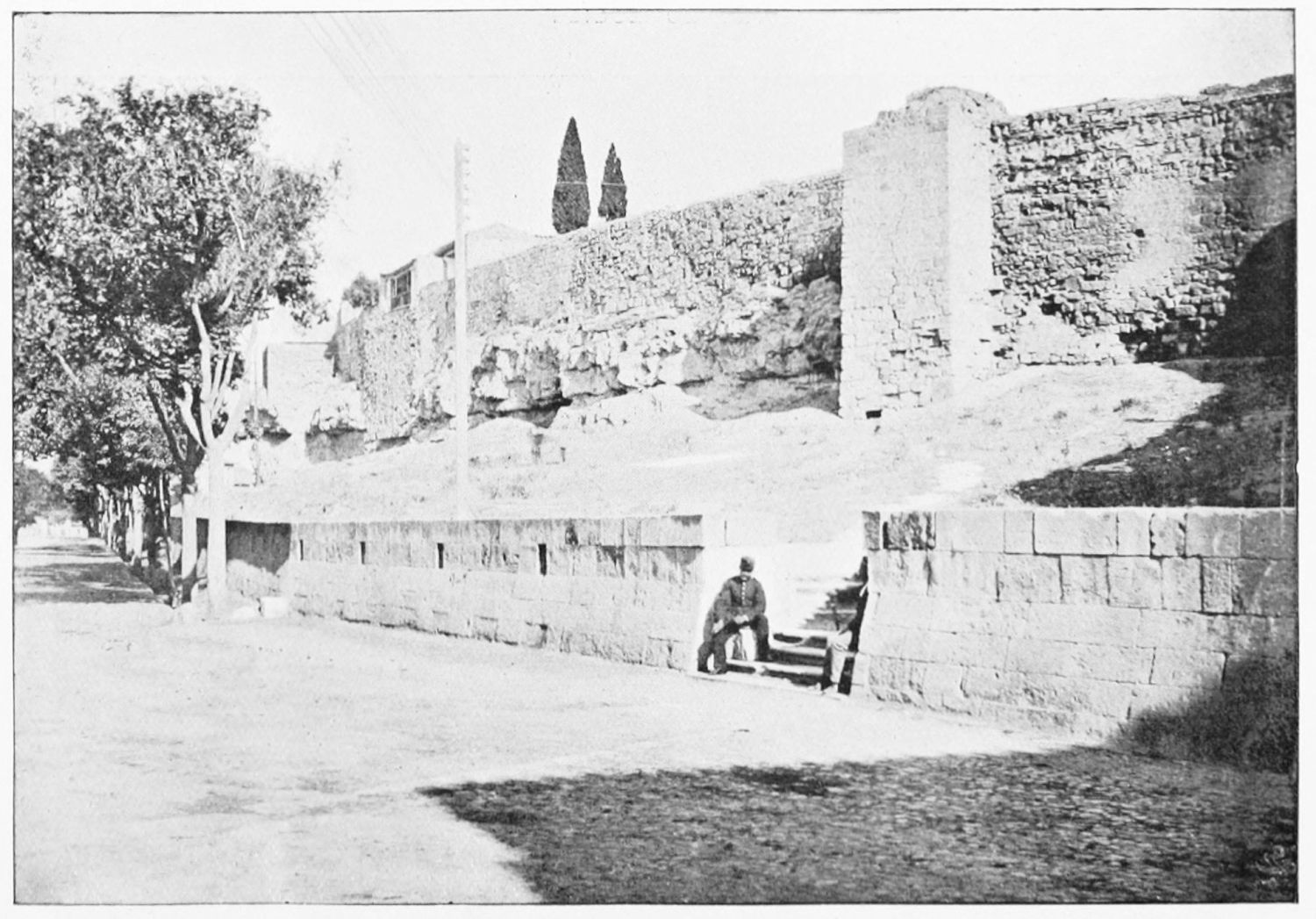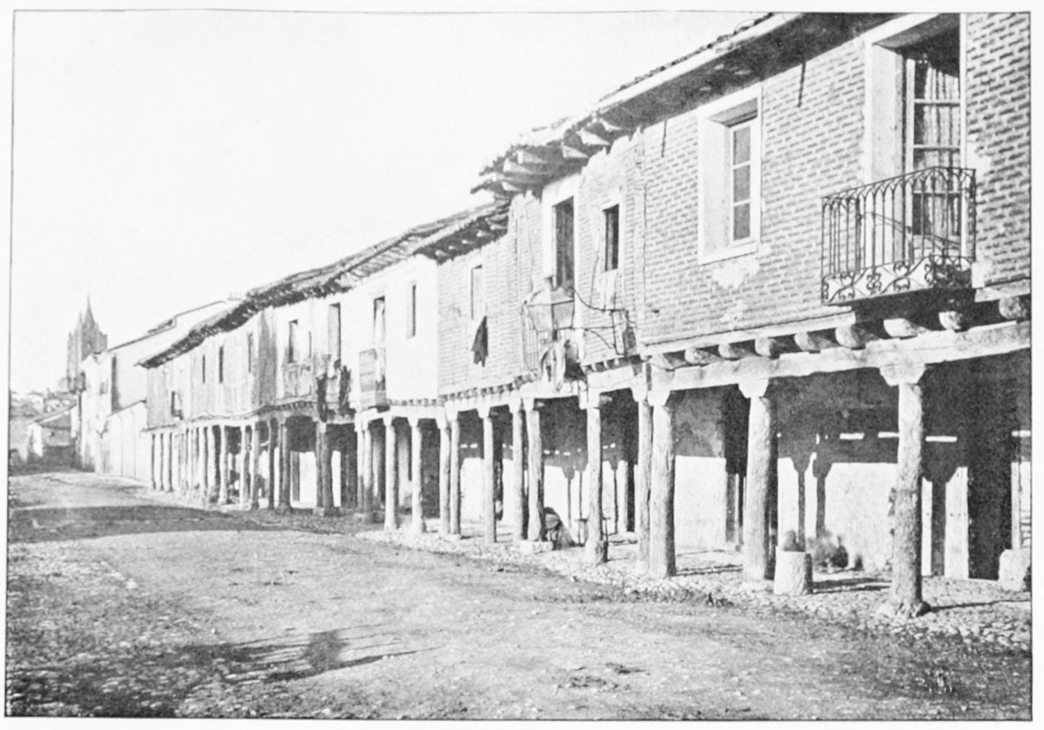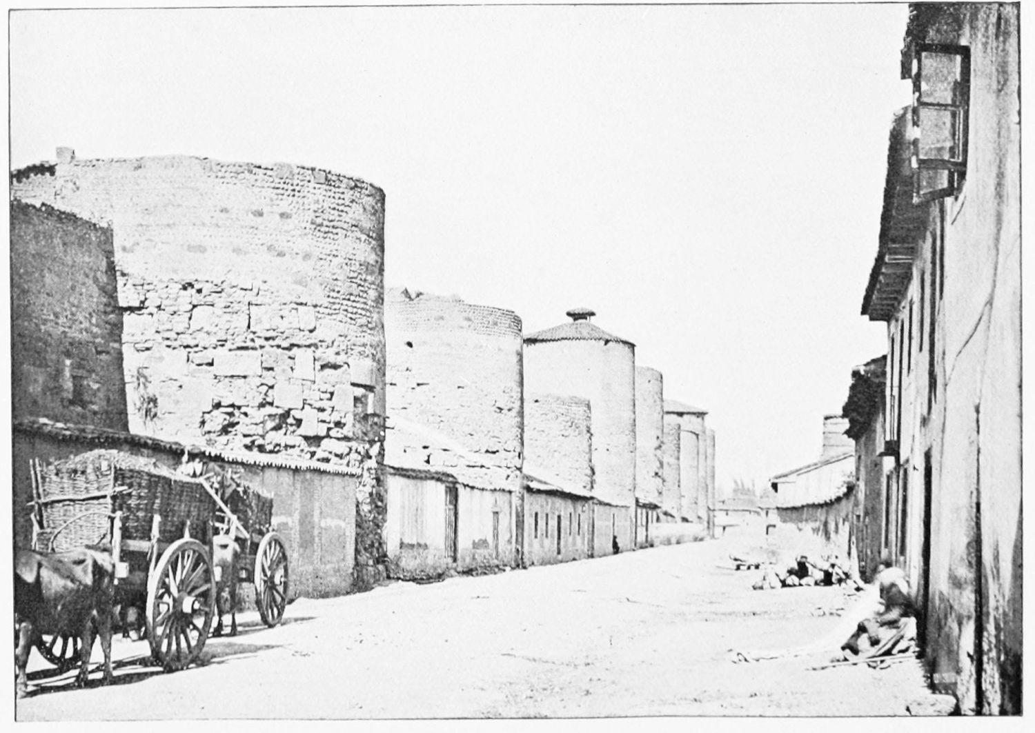 The legion which preserved the pax Romana in this remote corner of the empire may have varied in strength from six to seven thousand men of all arms. The camp was rectangular, and measured 380 by 570 metres. It was confined by the wall, of which the northern, eastern, and part of the western sides remain,—or rather the bases, for the masonry of the upper part reveals the handiwork of various subsequent ages. Walking round the city, you notice the stout round bastions outcropping between the houses which frequently obscure the trace of the wall. Of the four Roman gates, faced with marble slabs and inscribed with the names of the commanders of the{8} legion, two remain—the eastern, or Bishop’s gateway, behind the cathedral, and the low semicircular arch in the Plazuela del Conde de Luna.