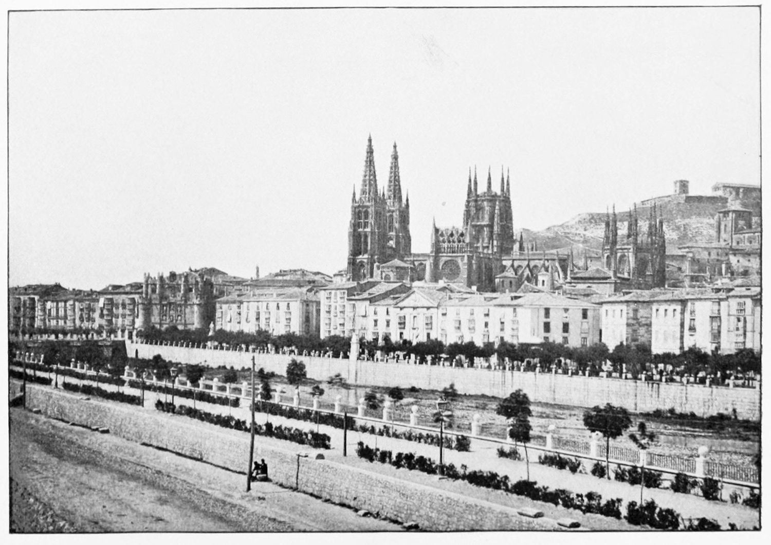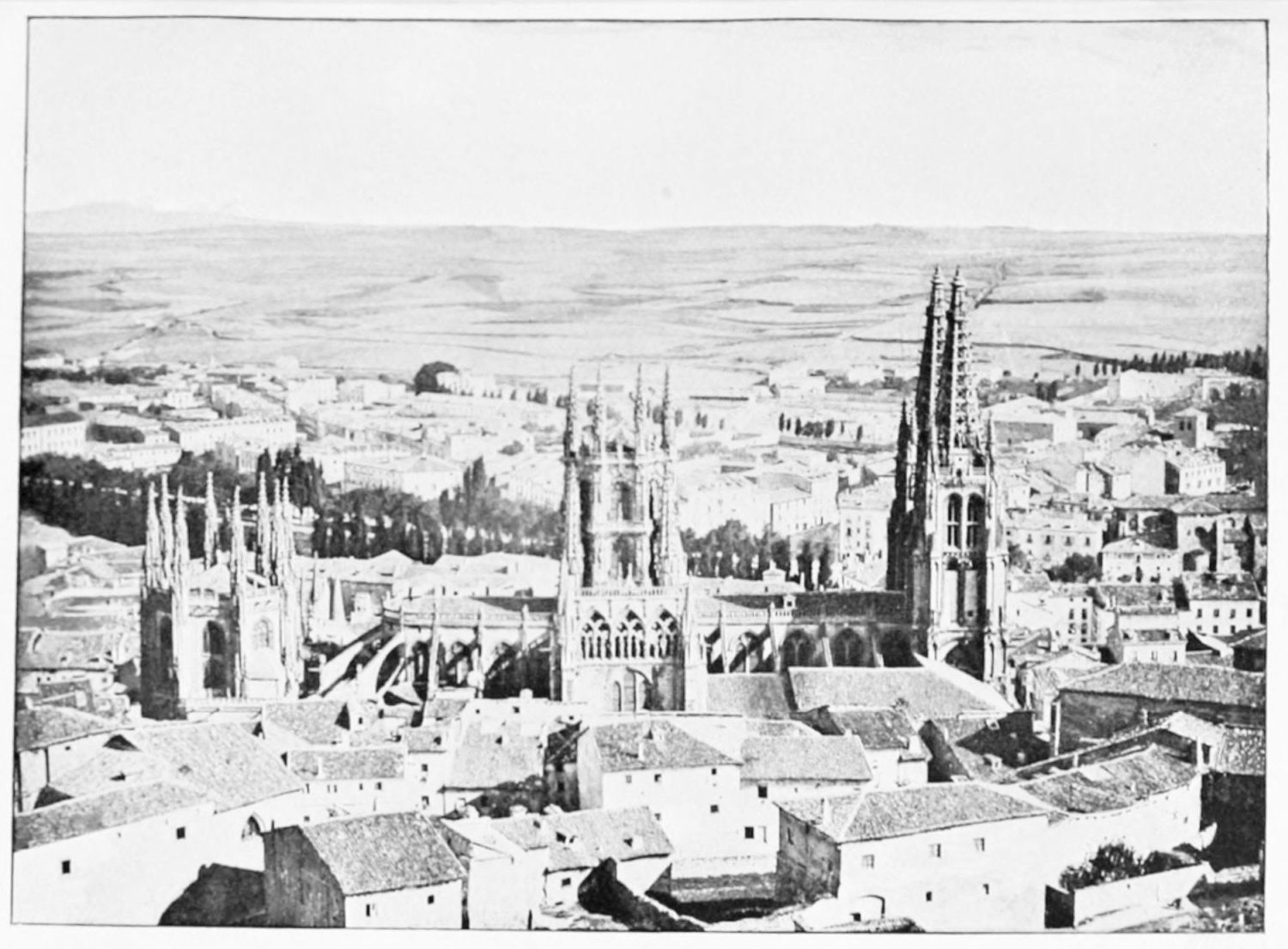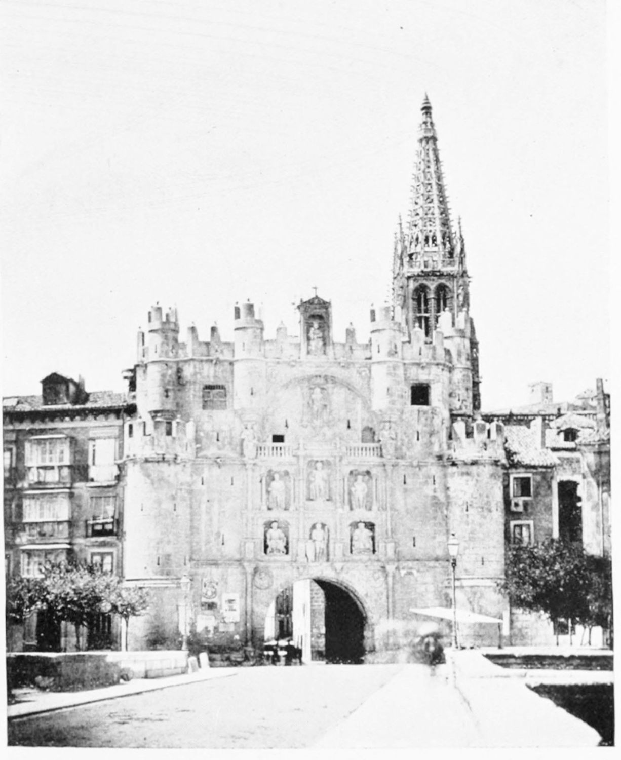 Burgos, the red and white city in the broad valley of the Arlanzon, is more mediæval than many an older town. For she was no inheritance from Celts or Romans, but was born in the Dark Ages, waxed prosperous within them, and declined with the Renaissance and the dawn of the modern era. There is nothing that is classical, little that is modern, about this old capital of Castile. All her memories are of Gothic, mediæval, romantic Spain. To her belong knights and barons, shield and helm and lance, tournaments and jousts, soaring Gothic spires, and the quiet of the cloister—all the pageant and panorama of mediævalism.