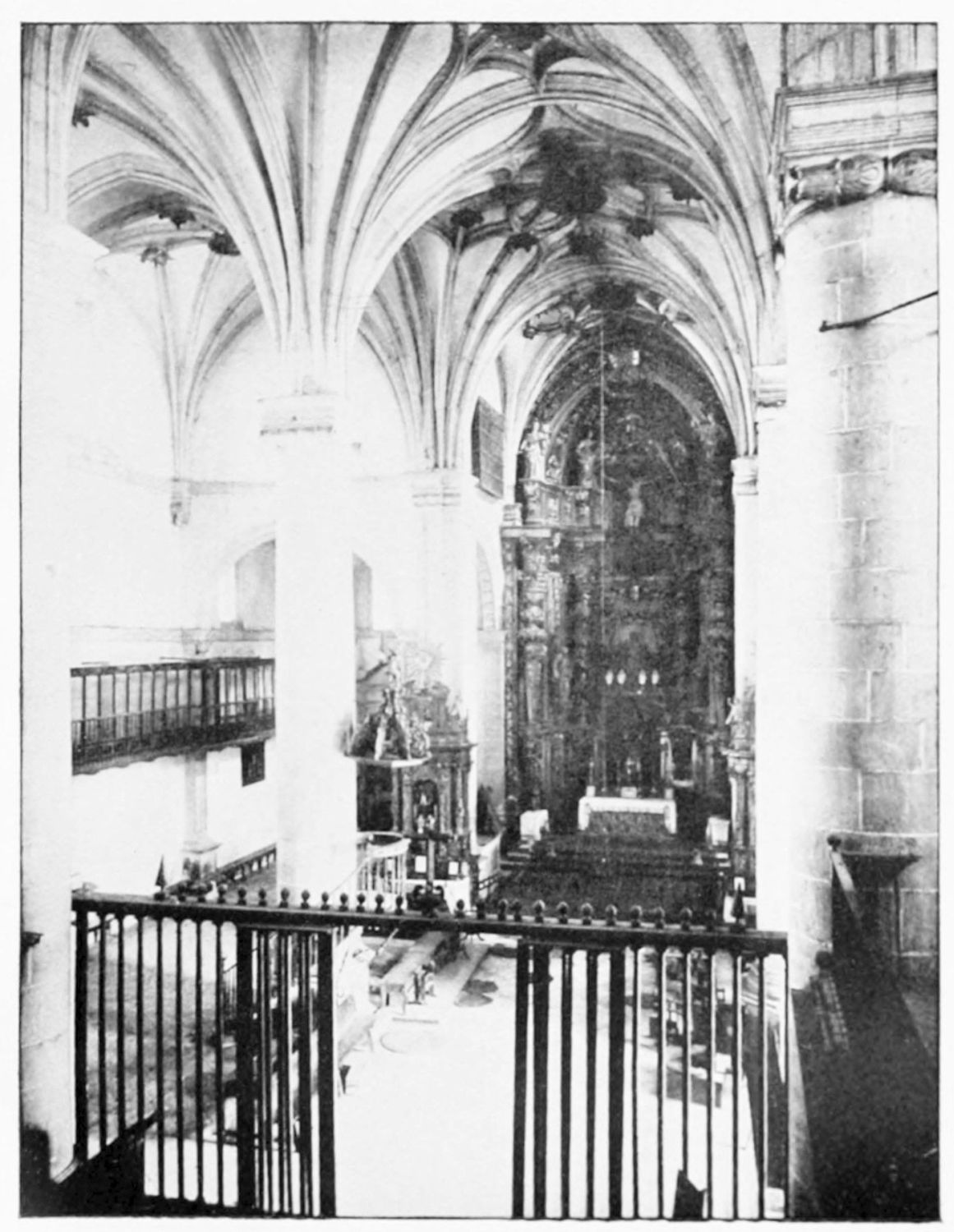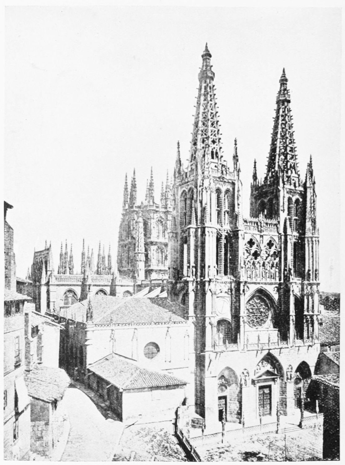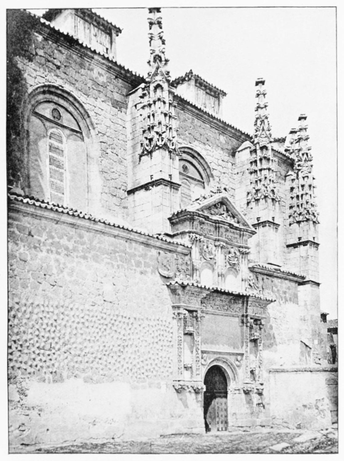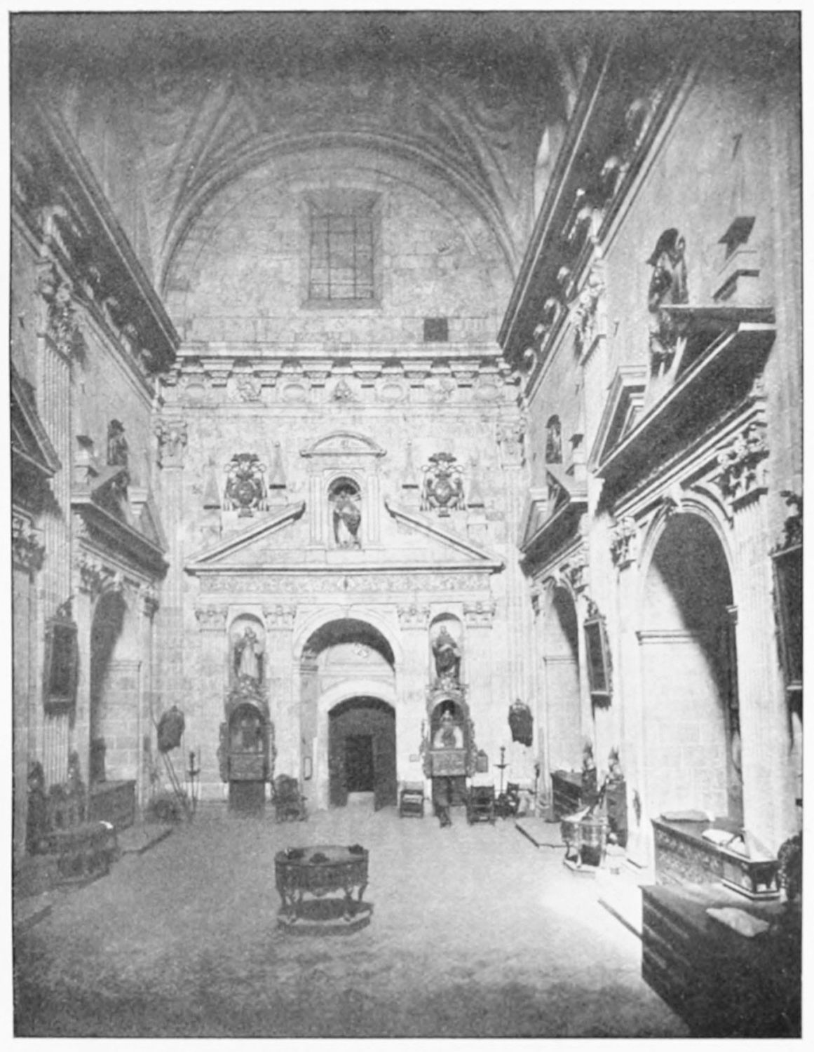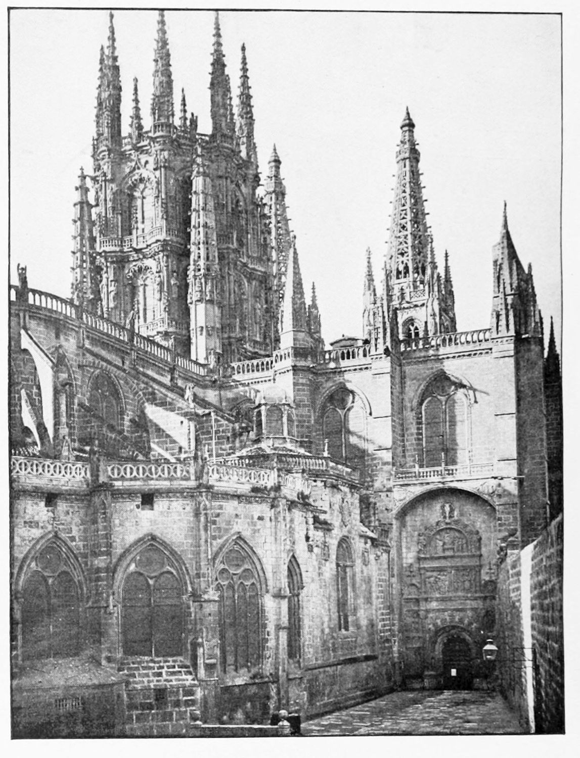 The eastern end, or chevet, projects beyond the city wall, which forms the eastern boundary of the adjacent cloister. The transept, if that term may be applied to the whole space between the Capilla Mayor and Coro, is of unusual breadth, and may be said to include a nave, two aisles to the east and{17} one to the west. North and south it projects but slightly beyond the nave. The west front is flanked by two steeples, which stand on each side of, and do not terminate, the aisles. They are heavier than the rest of the structure, and of different heights and ages. Ugly, too, is the empty space left between their side walls and those of the clerestory over the main entrance. The northern steeple is the older, lower, and simpler; it is surmounted by a spire with a vane. The other tower is more ornate, and contains the belfry. Its traceries are in a debased Gothic style.