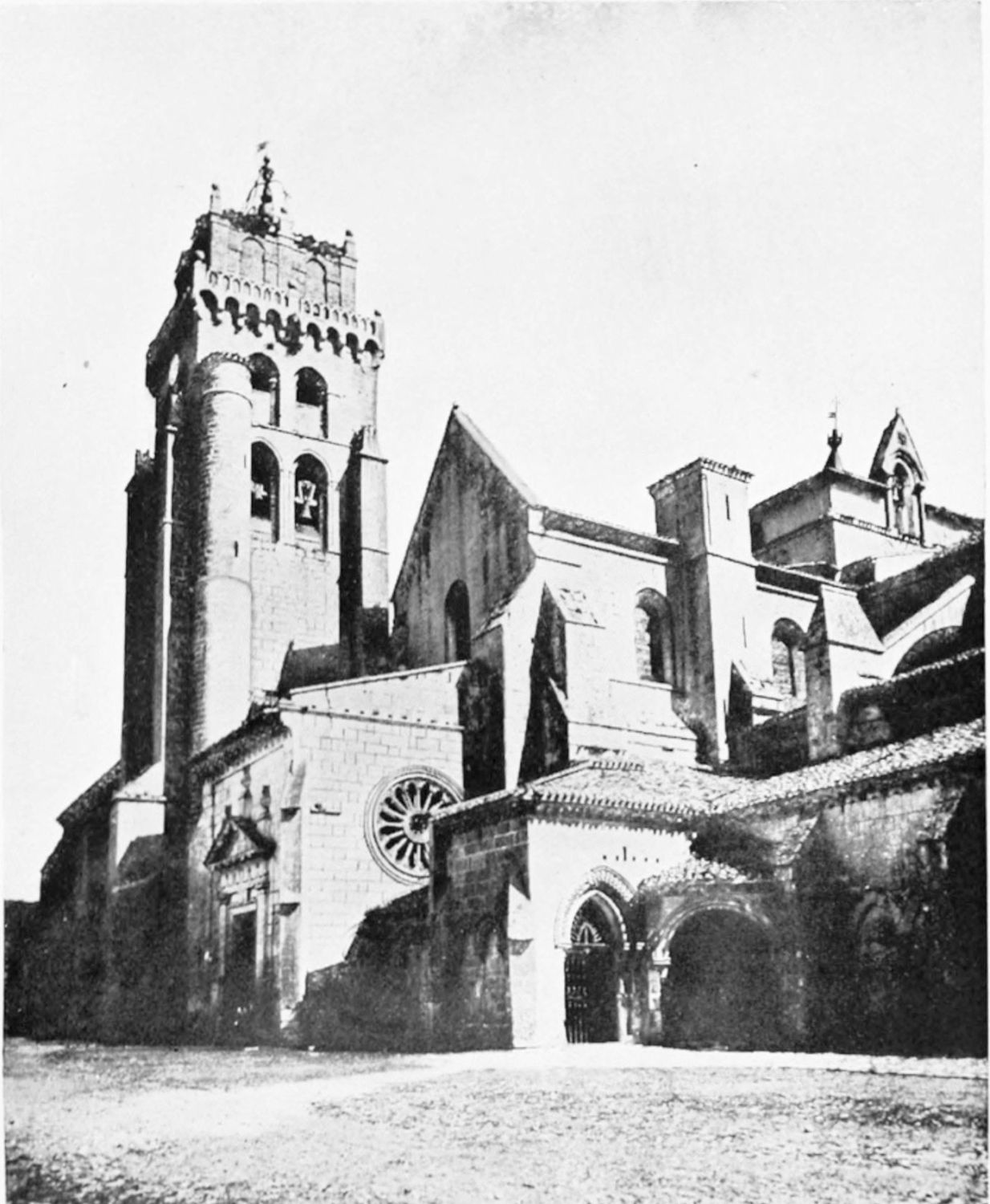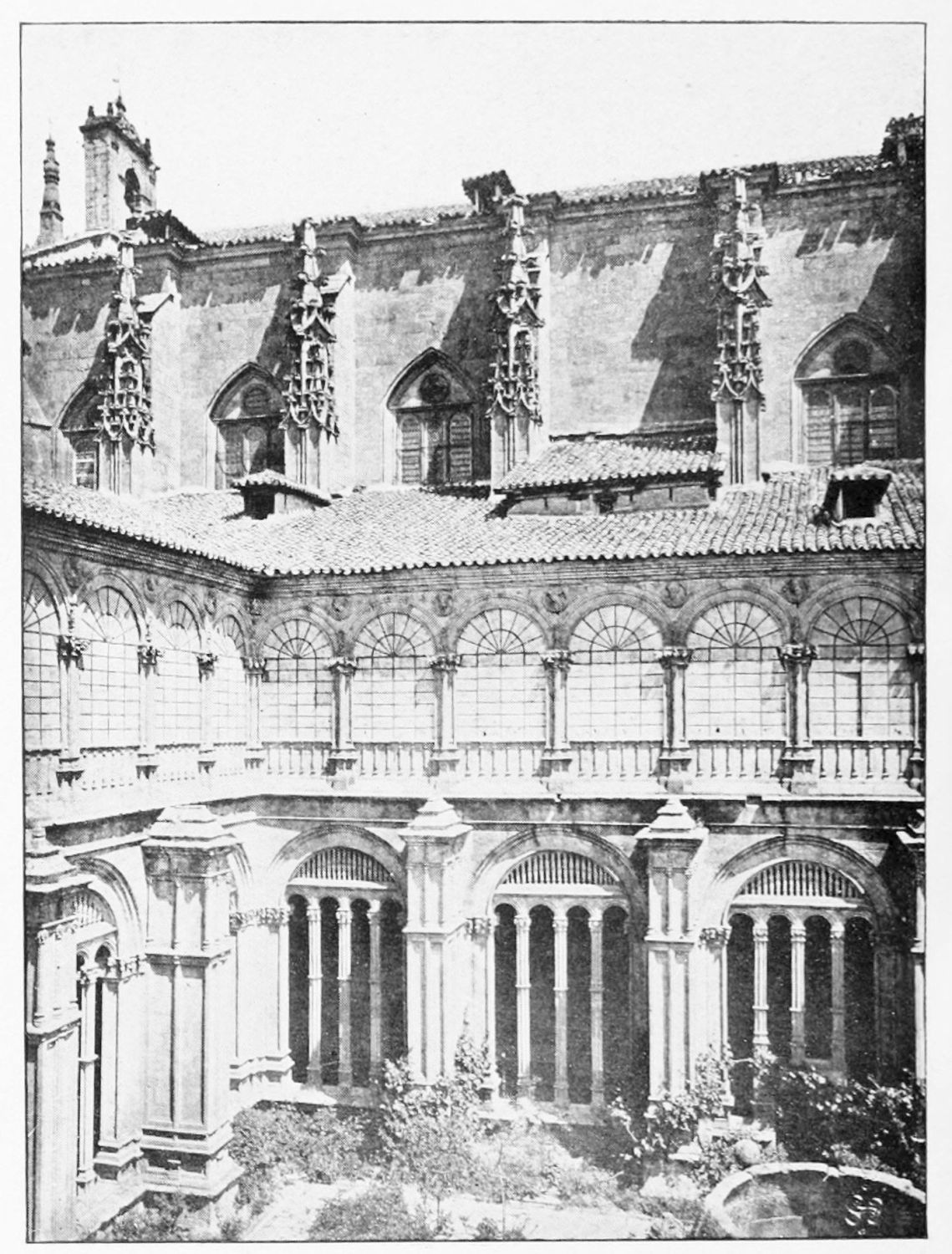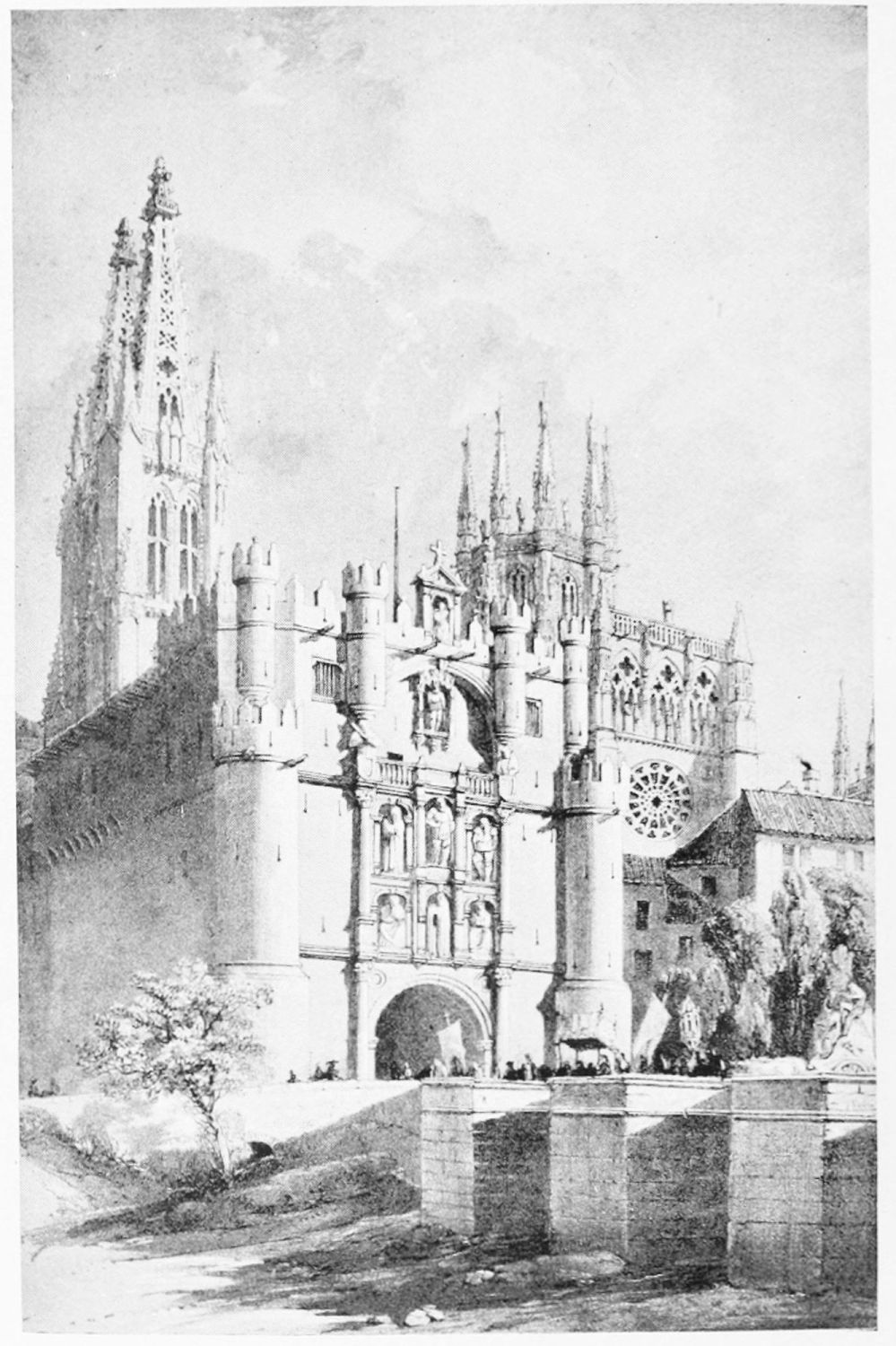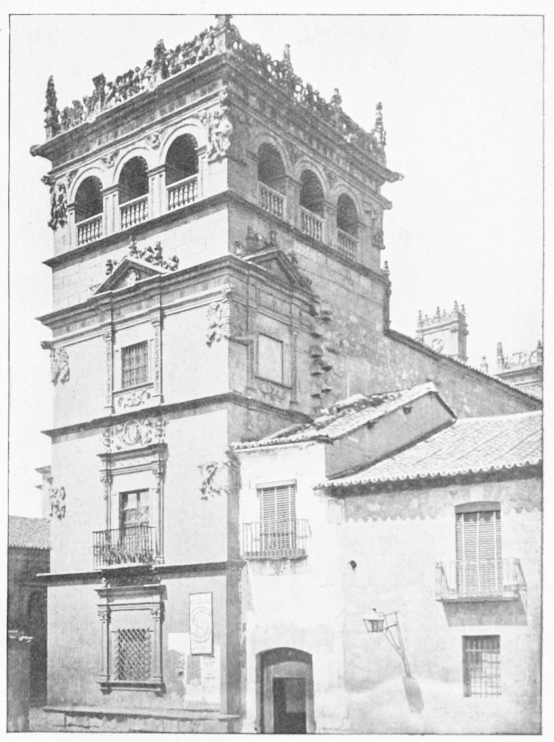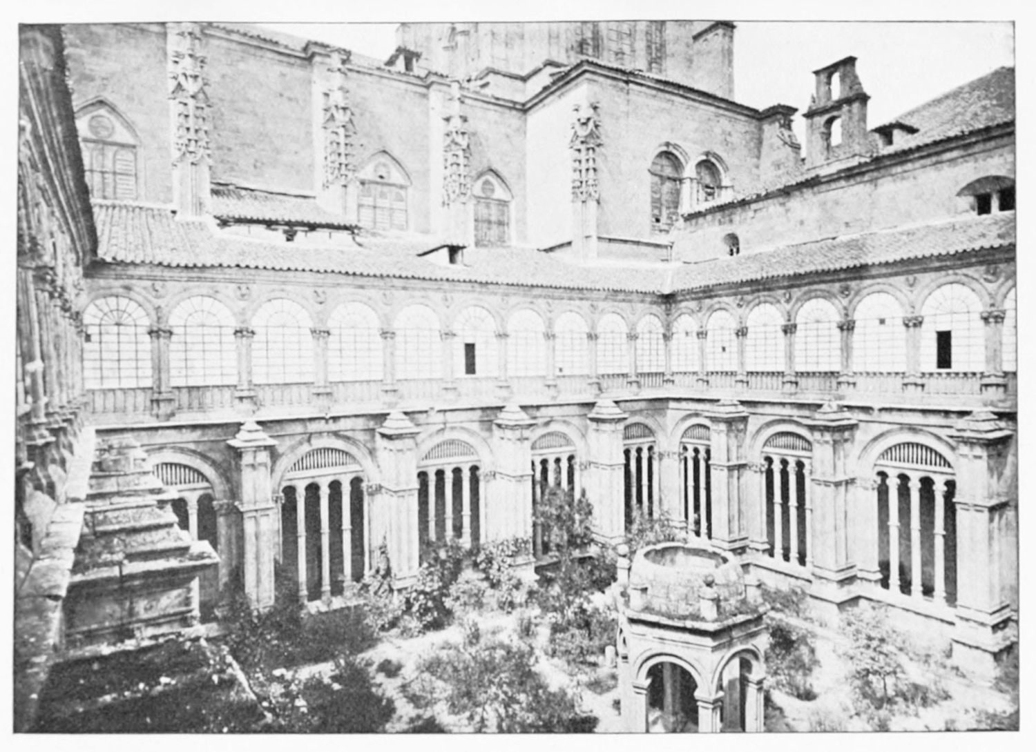 The eastern end, or chevet, projects beyond the city wall, which forms the eastern boundary of the adjacent cloister. The transept, if that term may be applied to the whole space between the Capilla Mayor and Coro, is of unusual breadth, and may be said to include a nave, two aisles to the east and{17} one to the west. North and south it projects but slightly beyond the nave. The west front is flanked by two steeples, which stand on each side of, and do not terminate, the aisles. They are heavier than the rest of the structure, and of different heights and ages. Ugly, too, is the empty space left between their side walls and those of the clerestory over the main entrance. The northern steeple is the older, lower, and simpler; it is surmounted by a spire with a vane. The other tower is more ornate, and contains the belfry. Its traceries are in a debased Gothic style.