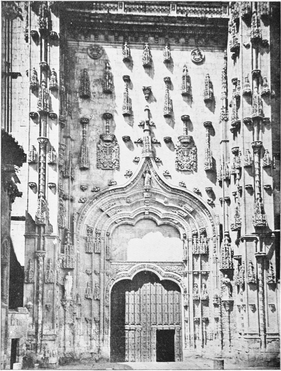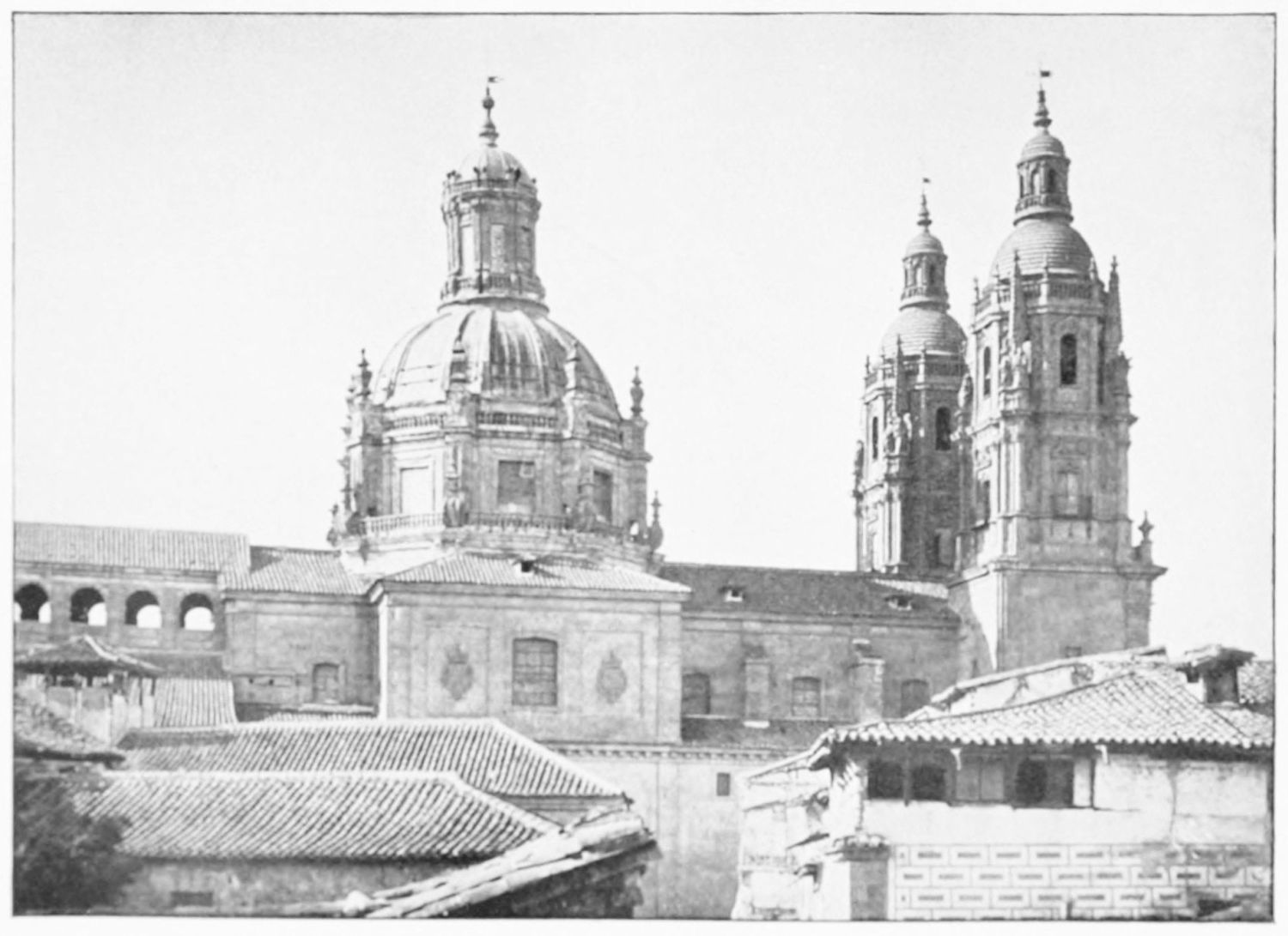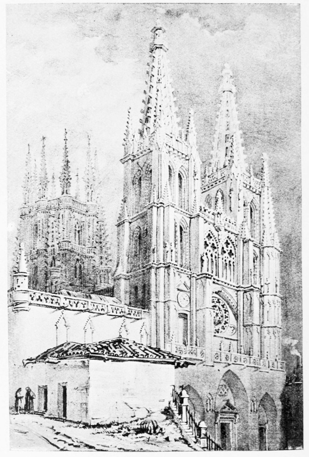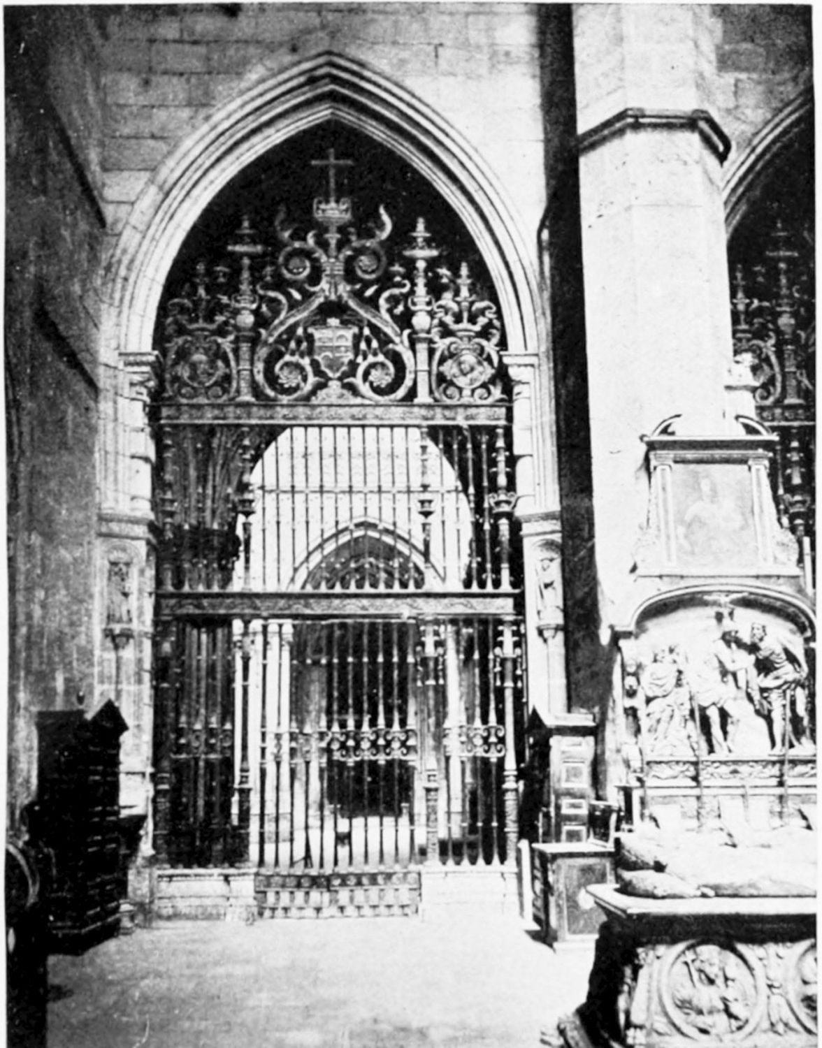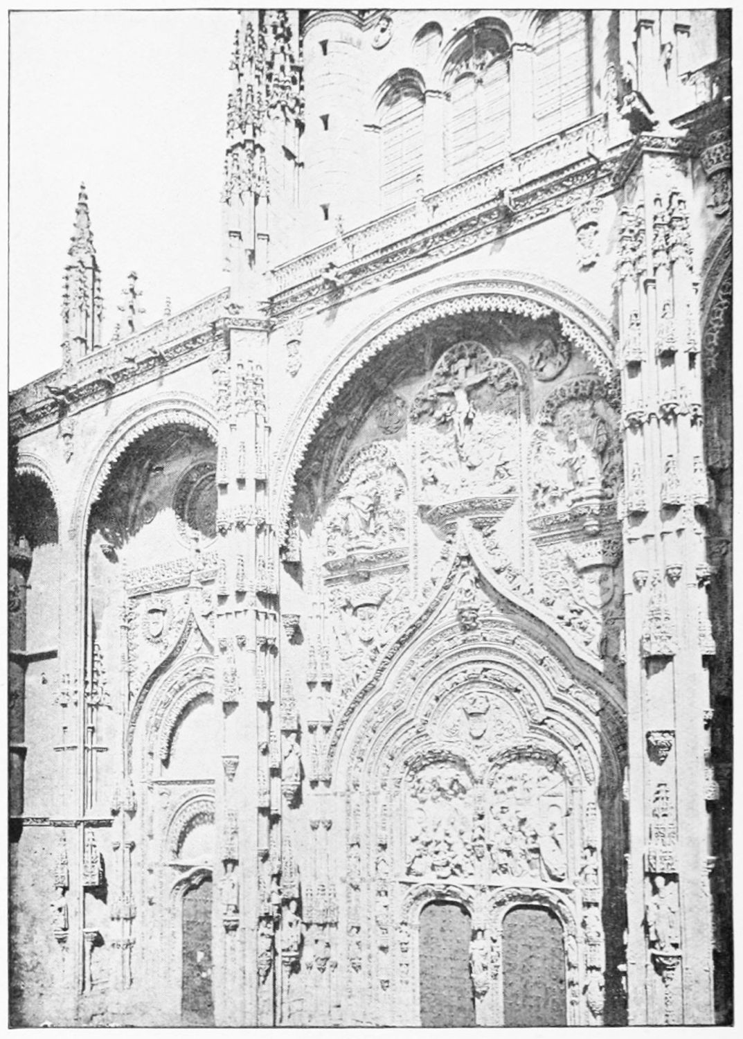 The eastern end, or chevet, projects beyond the city wall, which forms the eastern boundary of the adjacent cloister. The transept, if that term may be applied to the whole space between the Capilla Mayor and Coro, is of unusual breadth, and may be said to include a nave, two aisles to the east and{17} one to the west. North and south it projects but slightly beyond the nave. The west front is flanked by two steeples, which stand on each side of, and do not terminate, the aisles. They are heavier than the rest of the structure, and of different heights and ages. Ugly, too, is the empty space left between their side walls and those of the clerestory over the main entrance. The northern steeple is the older, lower, and simpler; it is surmounted by a spire with a vane. The other tower is more ornate, and contains the belfry. Its traceries are in a debased Gothic style.