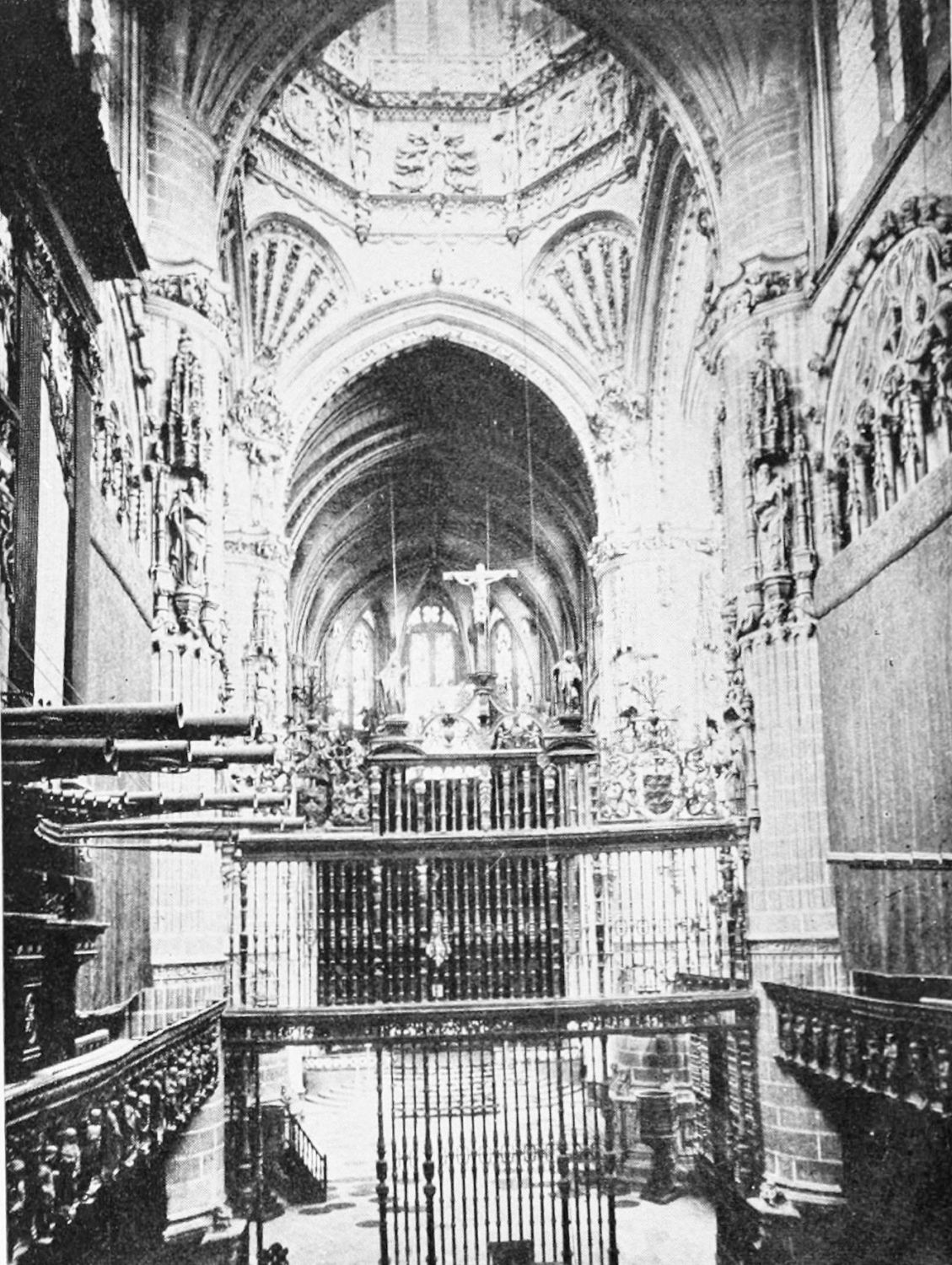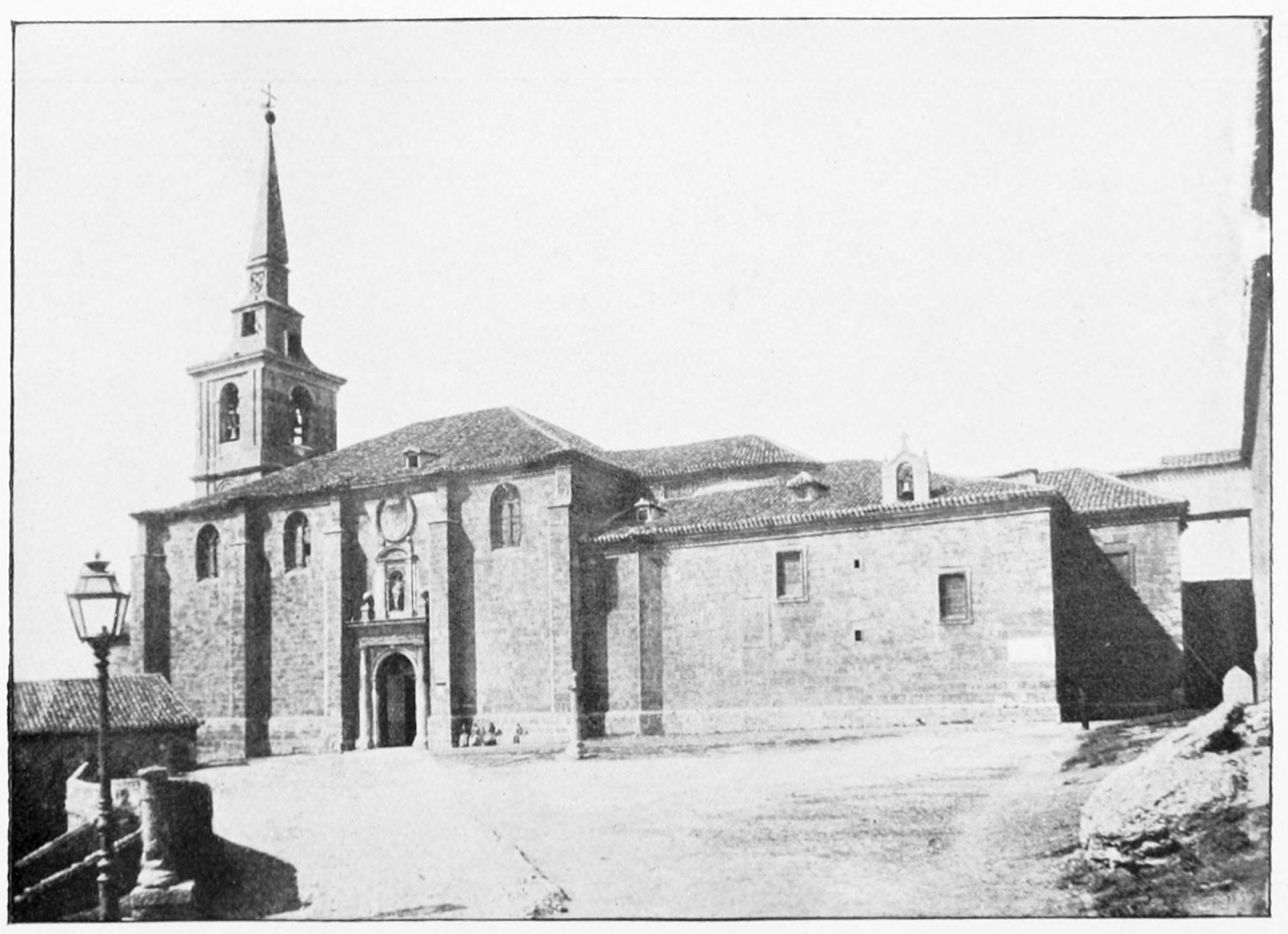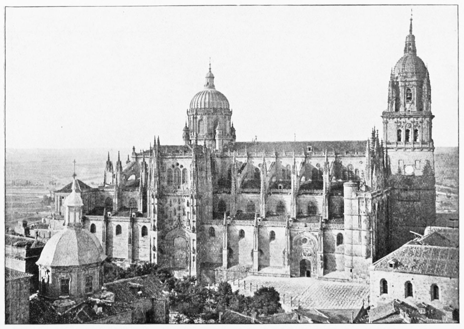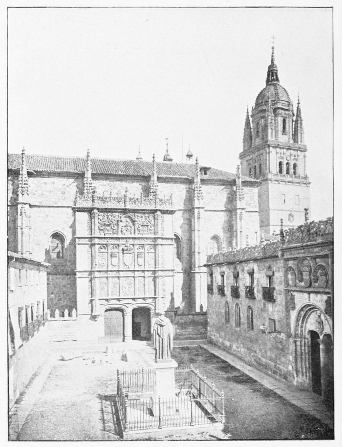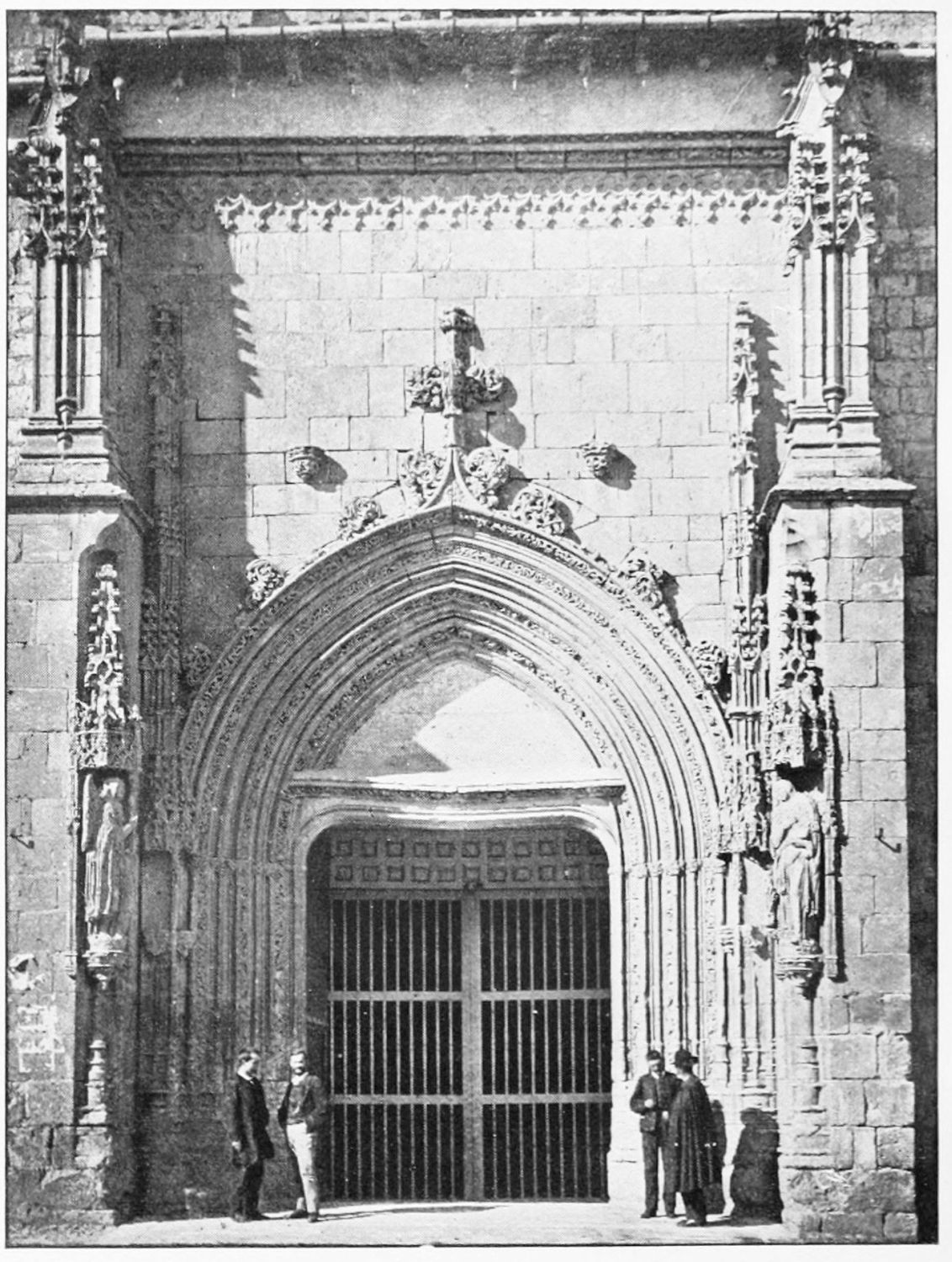 The eastern end, or chevet, projects beyond the city wall, which forms the eastern boundary of the adjacent cloister. The transept, if that term may be applied to the whole space between the Capilla Mayor and Coro, is of unusual breadth, and may be said to include a nave, two aisles to the east and{17} one to the west. North and south it projects but slightly beyond the nave. The west front is flanked by two steeples, which stand on each side of, and do not terminate, the aisles. They are heavier than the rest of the structure, and of different heights and ages. Ugly, too, is the empty space left between their side walls and those of the clerestory over the main entrance. The northern steeple is the older, lower, and simpler; it is surmounted by a spire with a vane. The other tower is more ornate, and contains the belfry. Its traceries are in a debased Gothic style.