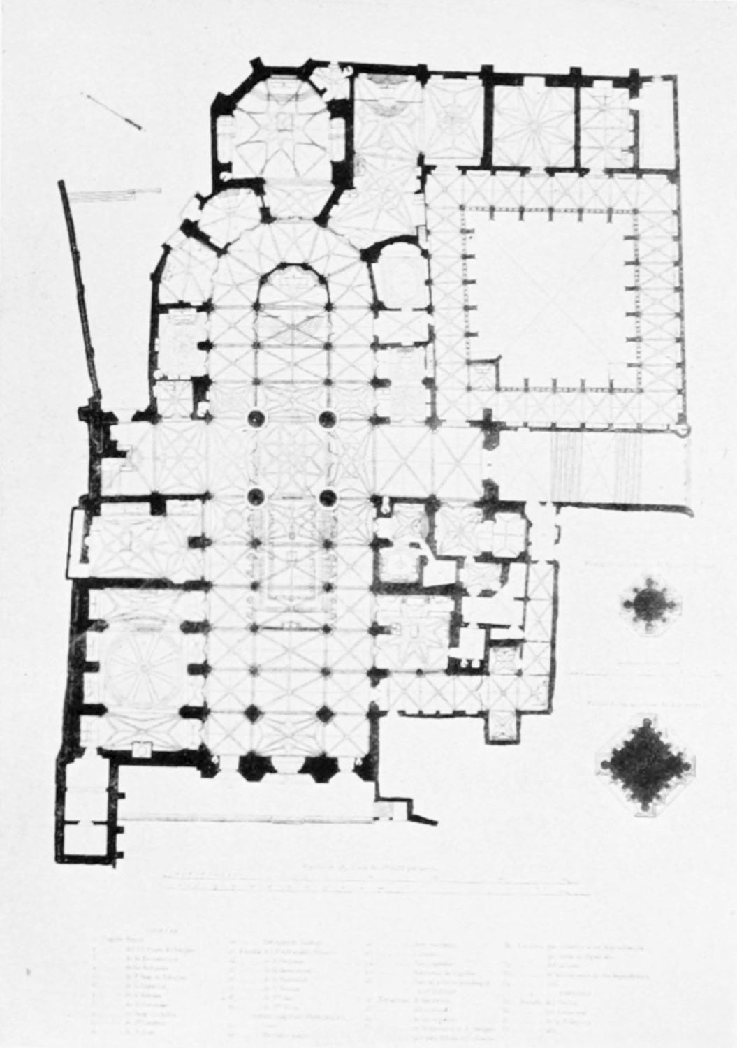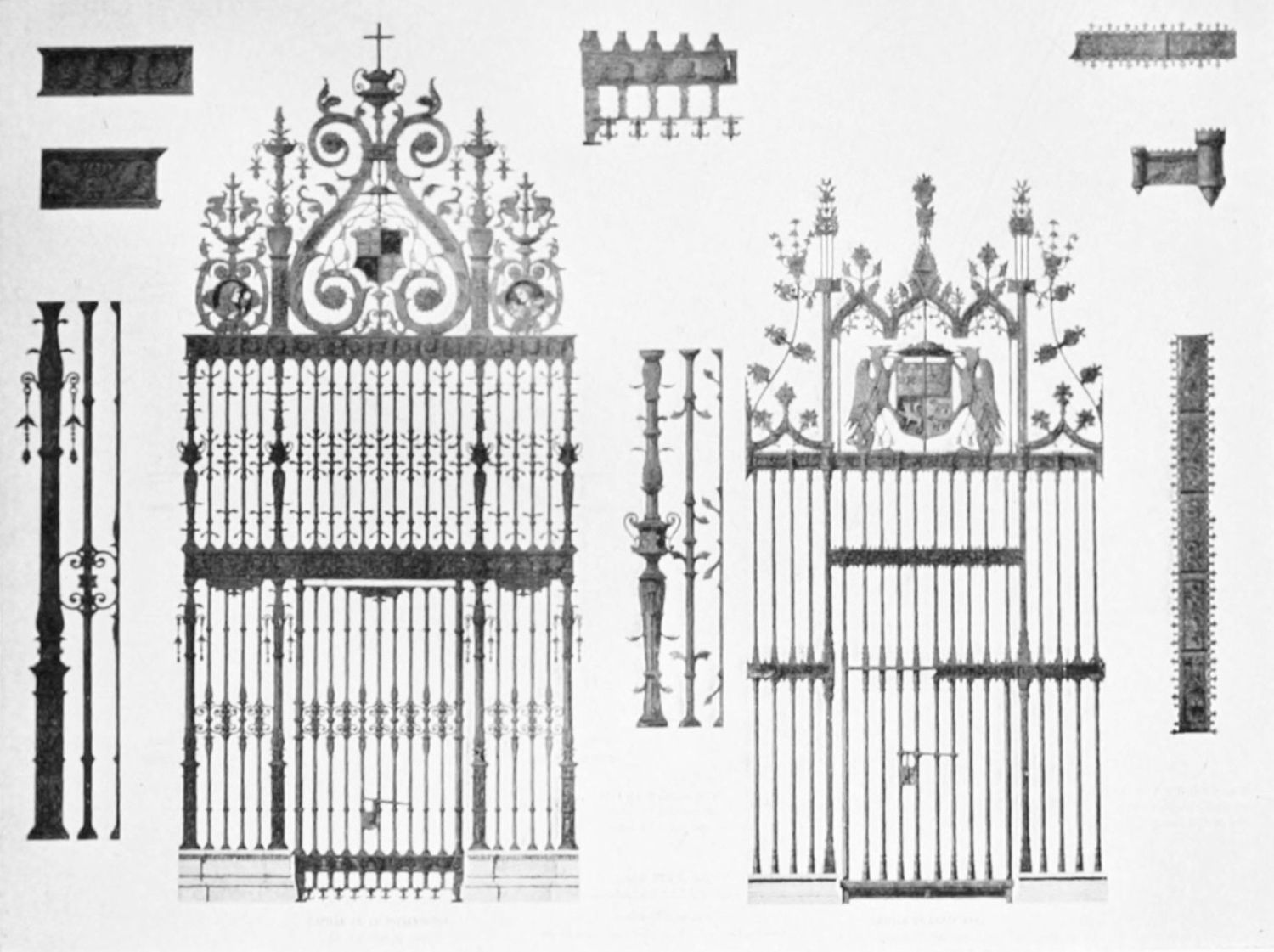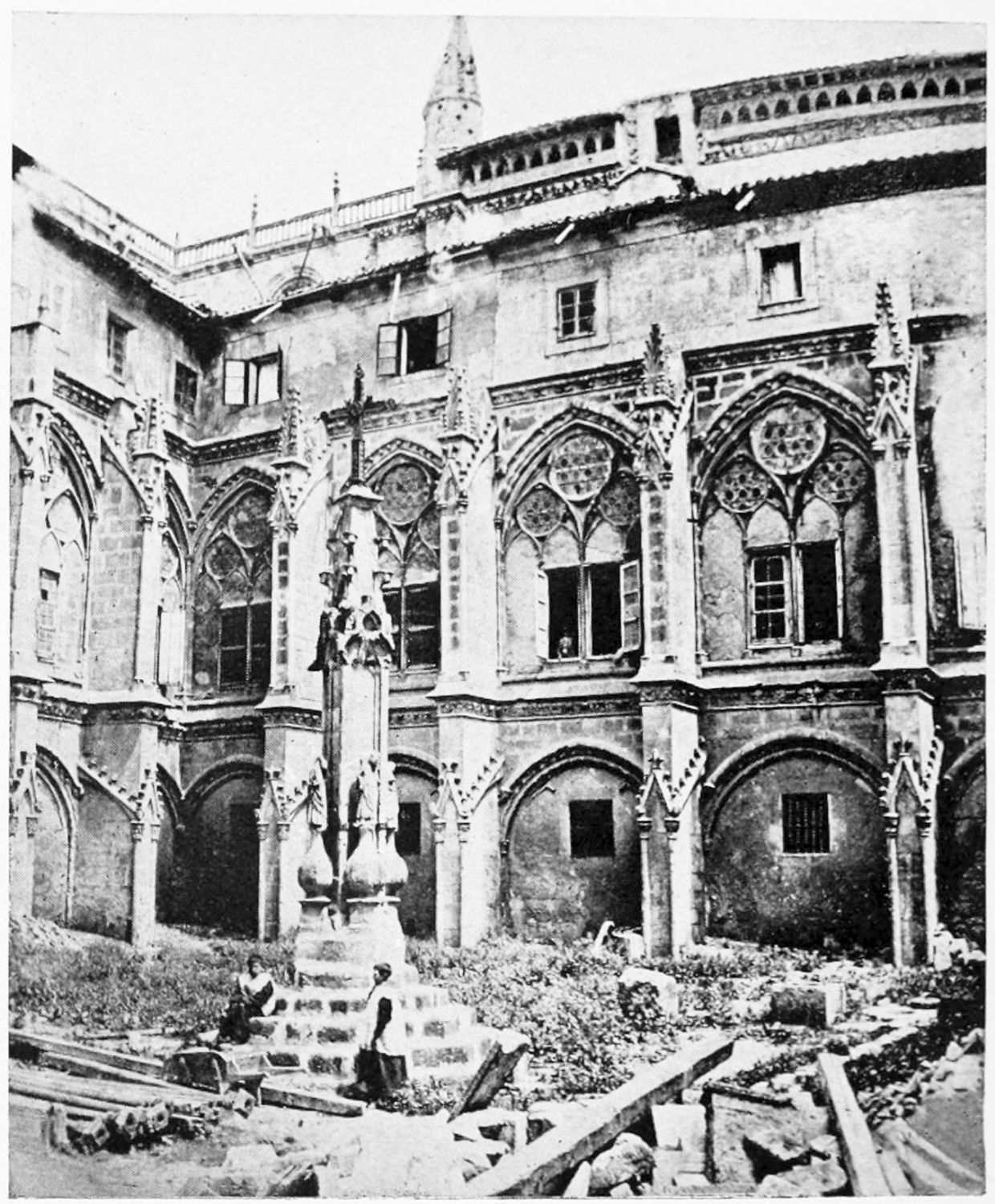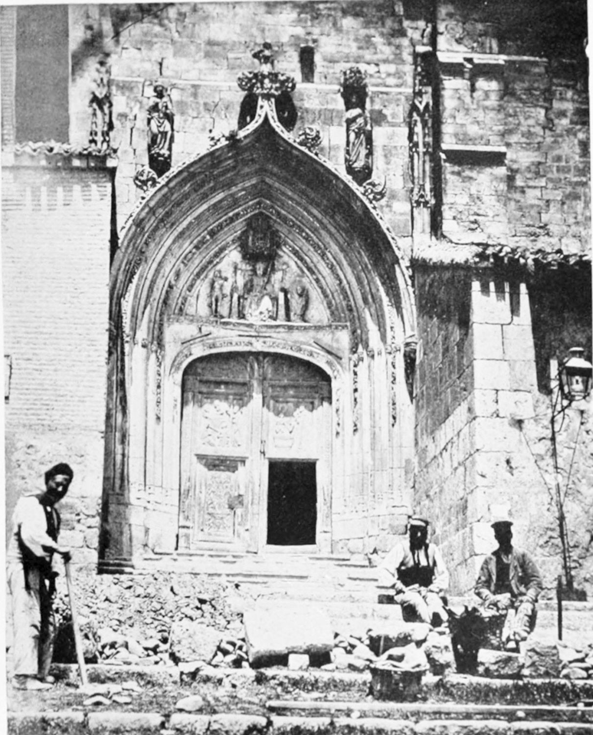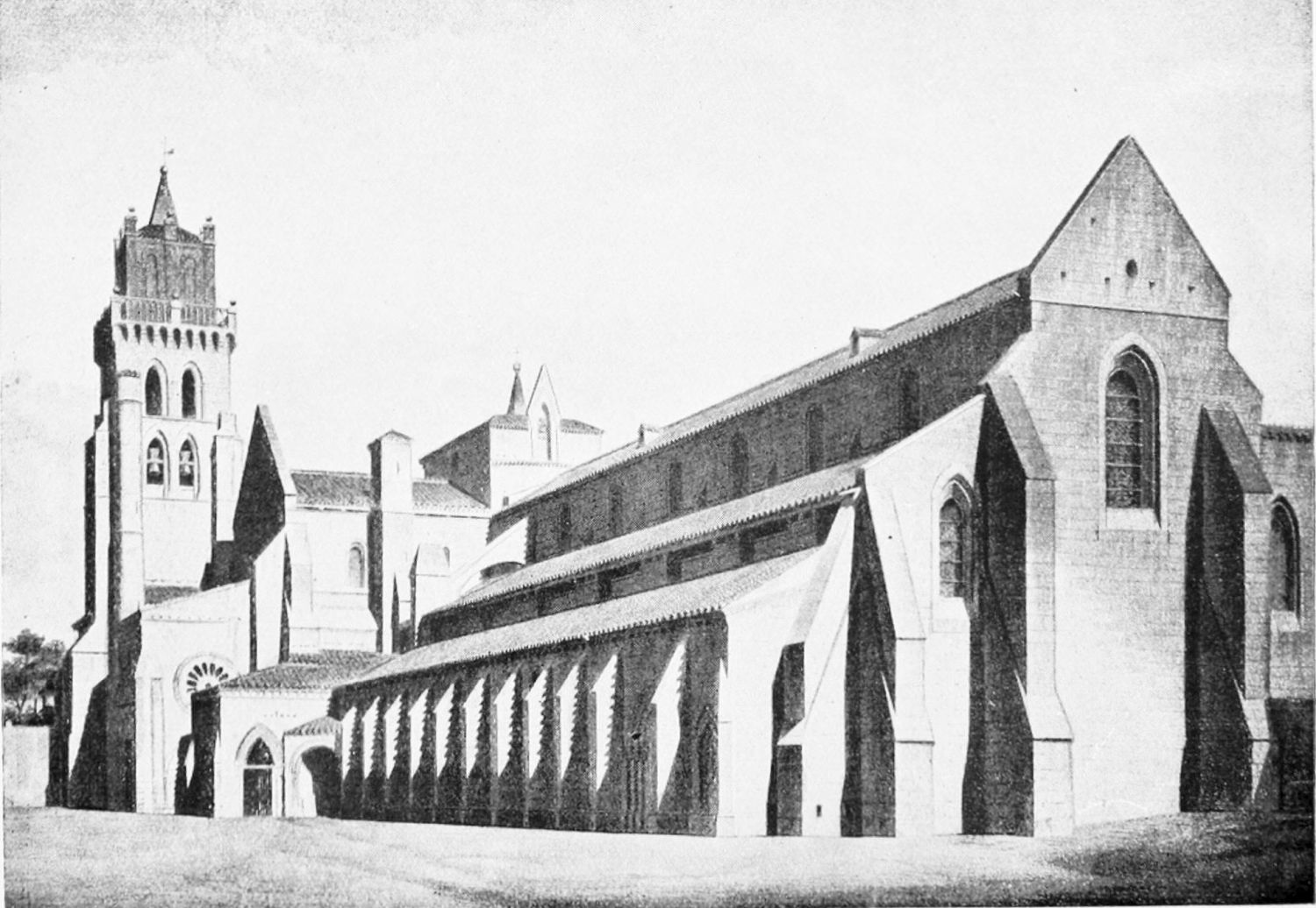 The eastern end, or chevet, projects beyond the city wall, which forms the eastern boundary of the adjacent cloister. The transept, if that term may be applied to the whole space between the Capilla Mayor and Coro, is of unusual breadth, and may be said to include a nave, two aisles to the east and{17} one to the west. North and south it projects but slightly beyond the nave. The west front is flanked by two steeples, which stand on each side of, and do not terminate, the aisles. They are heavier than the rest of the structure, and of different heights and ages. Ugly, too, is the empty space left between their side walls and those of the clerestory over the main entrance. The northern steeple is the older, lower, and simpler; it is surmounted by a spire with a vane. The other tower is more ornate, and contains the belfry. Its traceries are in a debased Gothic style.
