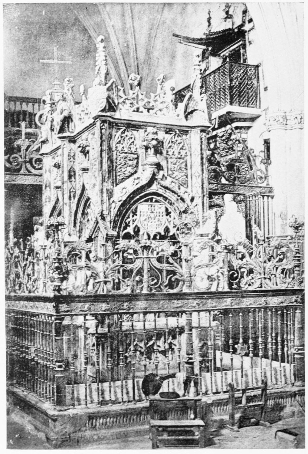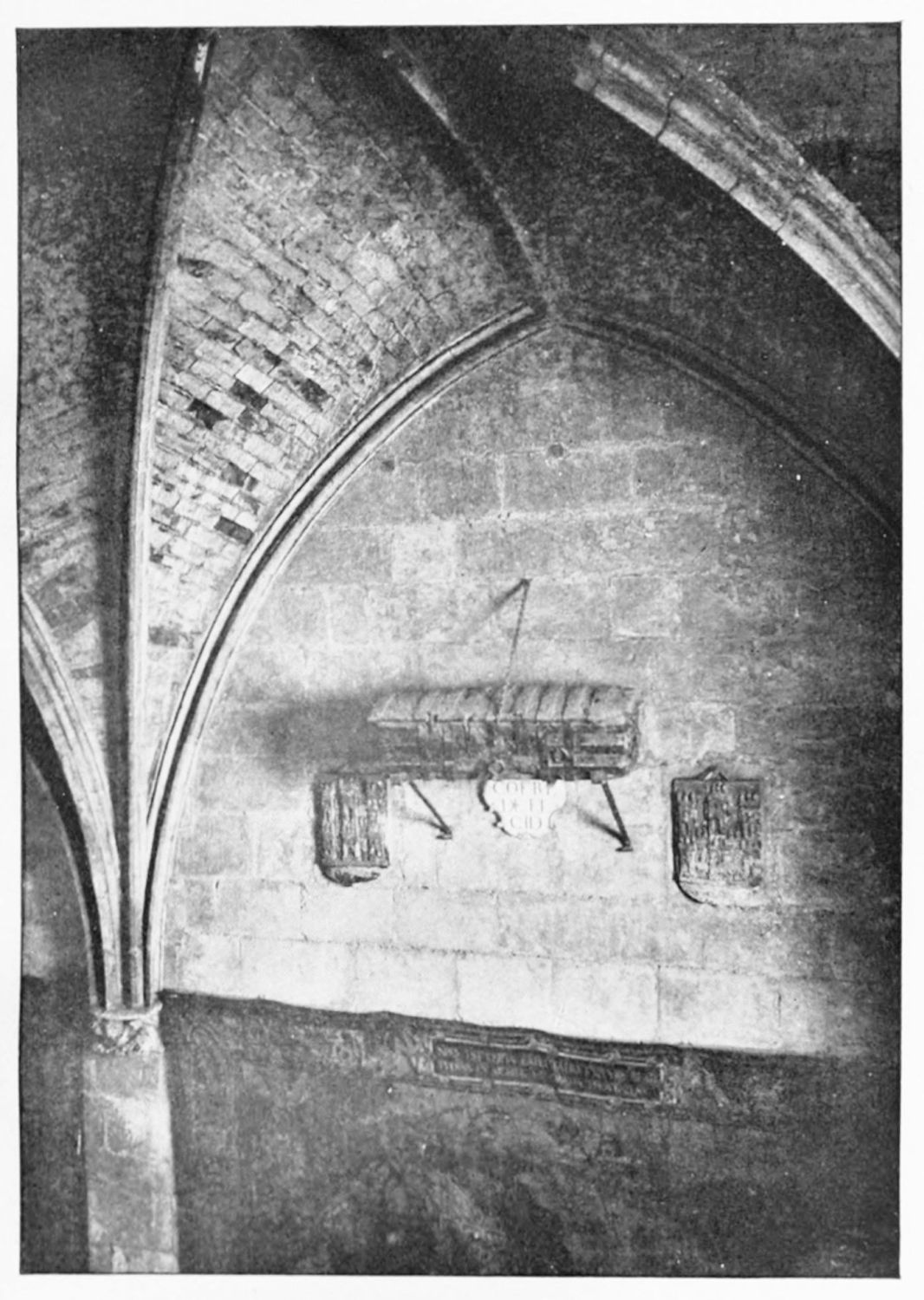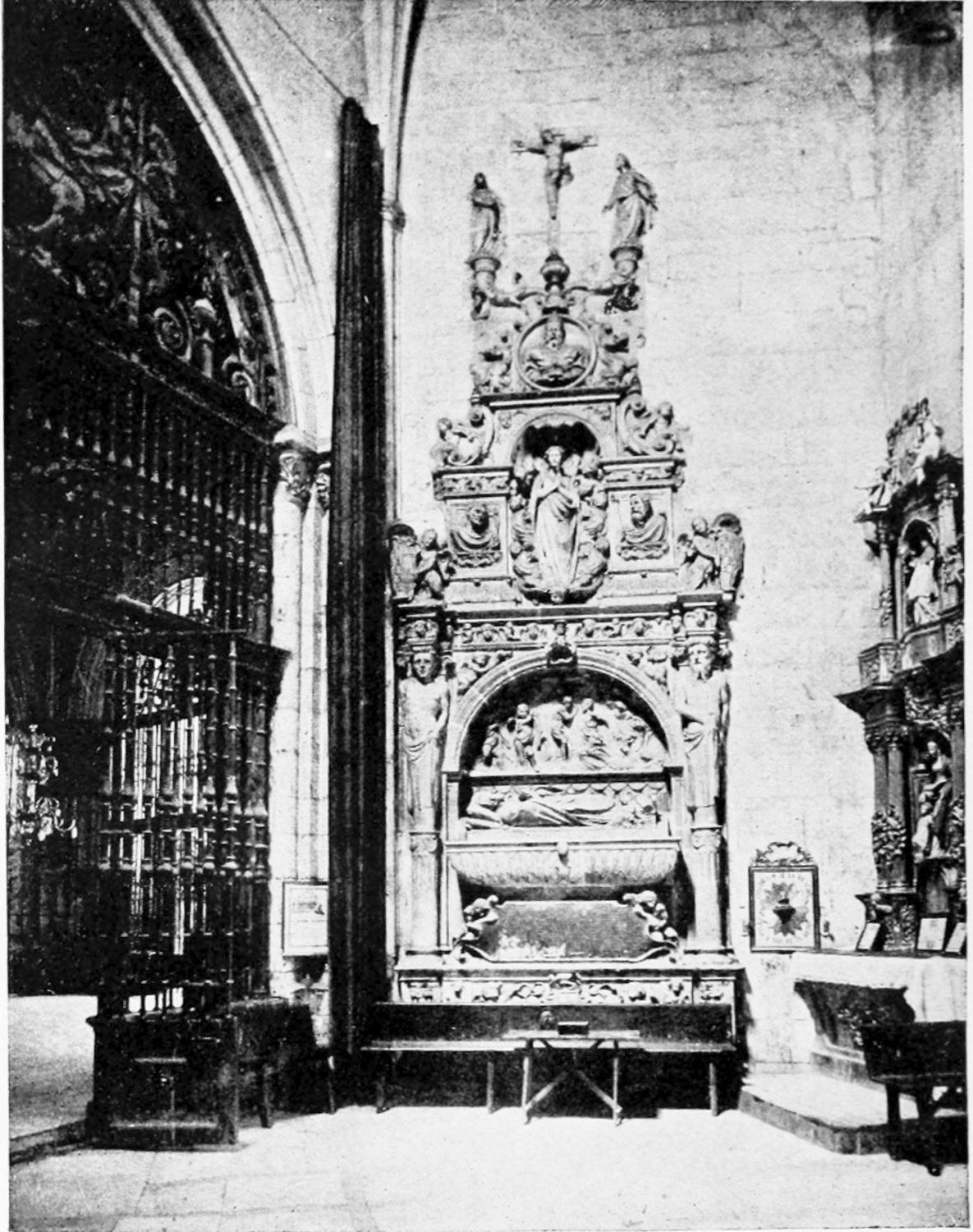At the north-eastern shoulder of the church, between it and the tower in the city wall already mentioned, is the fine rectangular chapel of Santiago, built in the time of the Catholic sovereigns—on the site, it would seem, of a{23} twelfth-century chapel. The pillars are borne on the shoulders of various figures, among them being Samson, the Queen of Sheba, Laocoon, and a monk with a book on which is the derisive motto legere et non intelligere. The details of the architecture are capricious and graceful. The chapel is lighted by colossal windows, filled with gorgeous stained glass—blue and gold, purple and emerald—the reflected colour producing a magical effect.