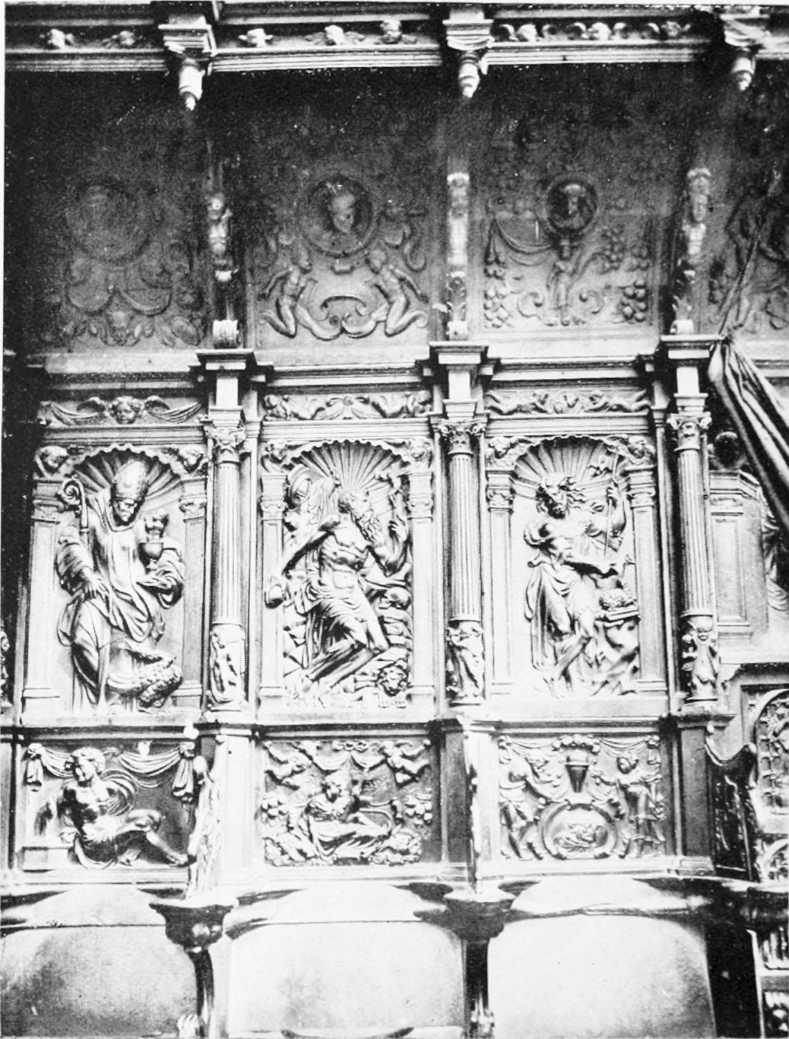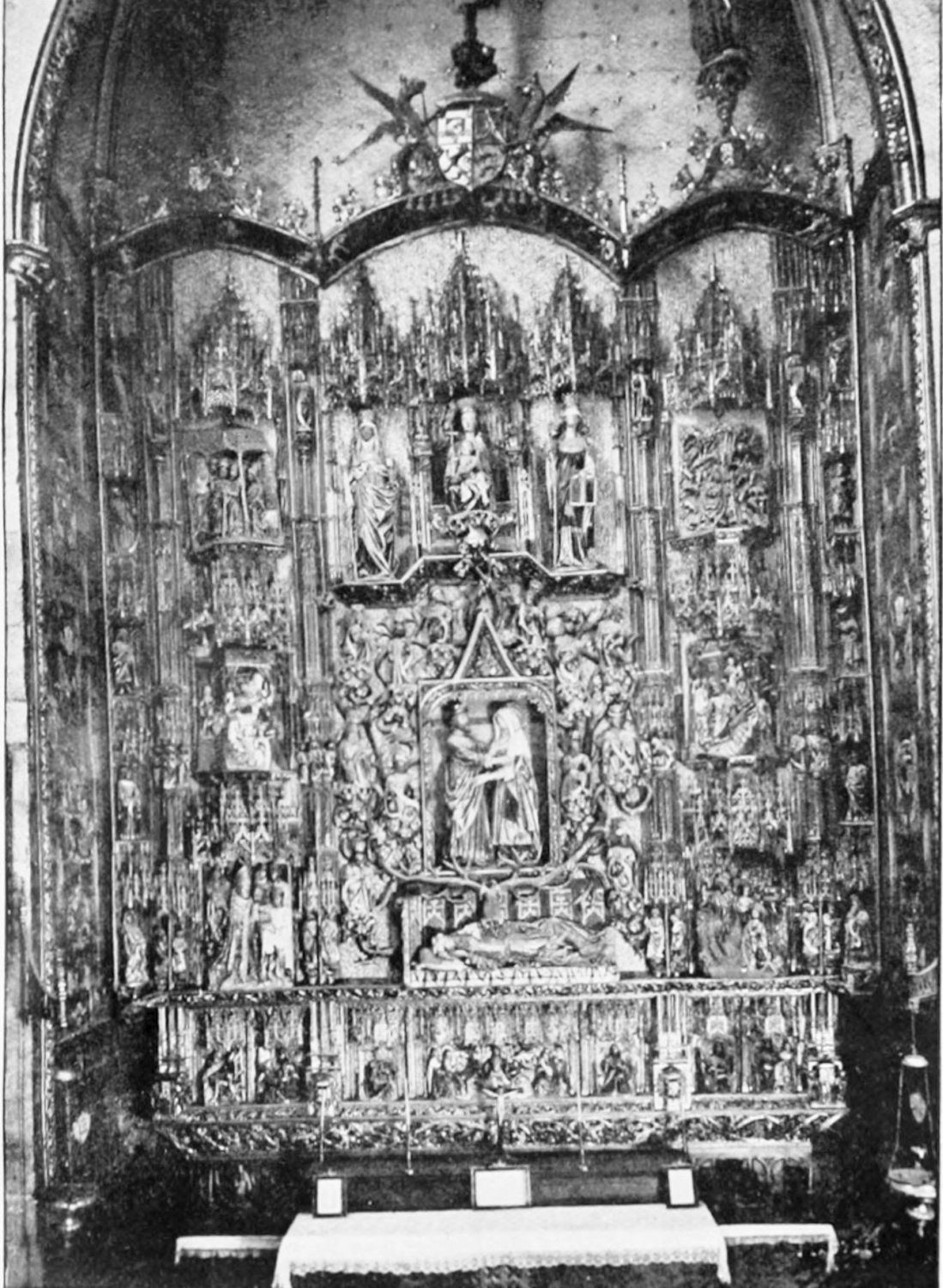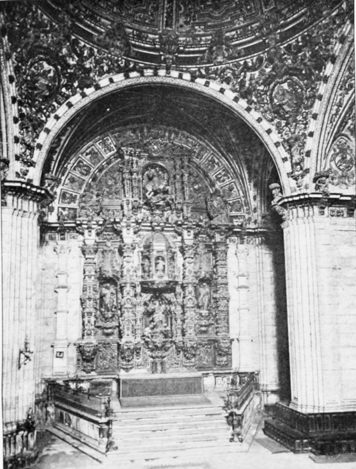 The work of Juan de Badajoz is to be seen in the Sacristy, a spacious nave of three vaults, richly designed and gilded. Under the windows are medallions with busts in relief, very well done. The retablo in the plateresque style shows the Eternal Father with His angels, and the Vision of Santiago. The inscriptions on the frieze are from the Book of Leviticus.