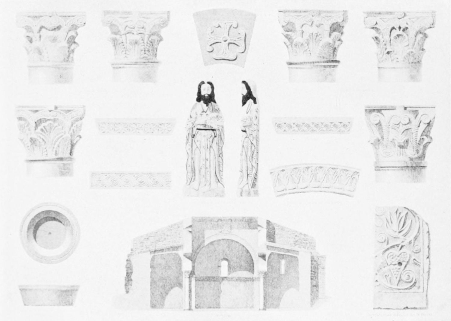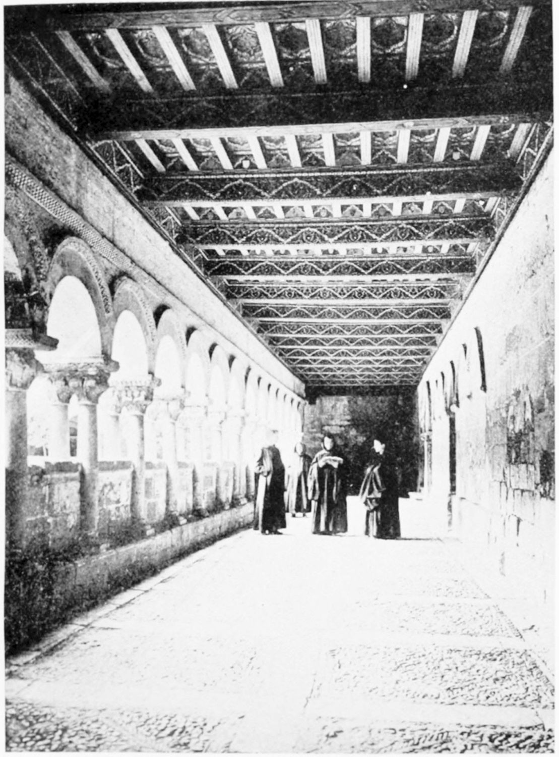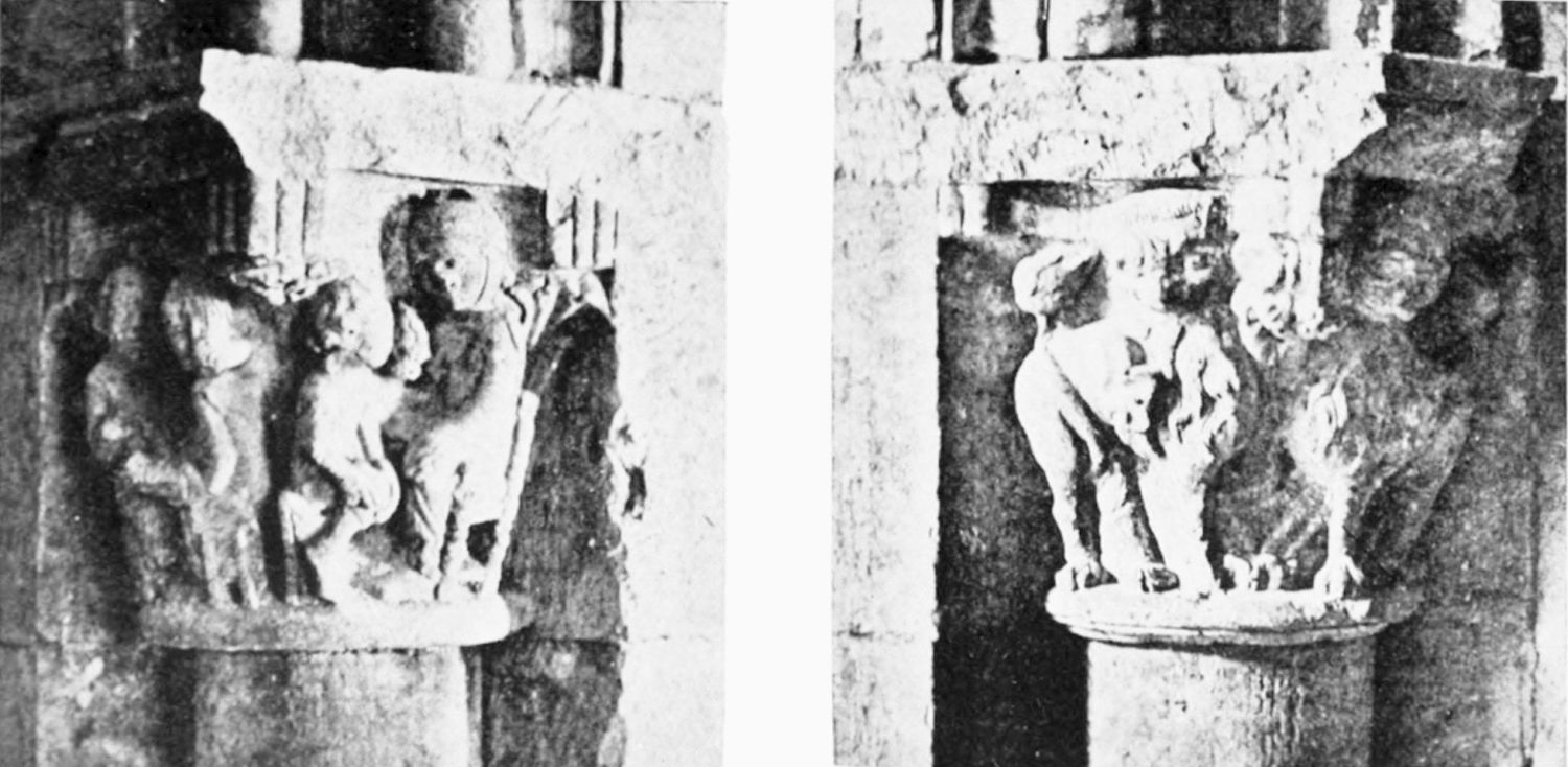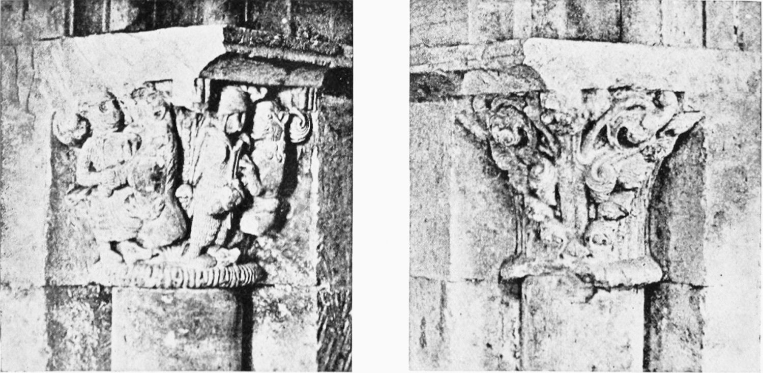 Leaving this place consecrated to wrath and tears, we re-enter the church. The plan is roughly cruciform, an apsidal chapel projecting to the east of each arm of the transept, on either side of the Capilla Mayor. We are now in that part of the fabric which was built by order of Alfonso VII., evidently on the model of St. Sernin at Toulouse. The name of the architect is given on an inscription in the flooring as Petrus de Deo—Peter of God. The most interesting features in the church are the very ancient mural paintings in the Byzantine style, with the same profusion of foliage and richly moulded capitals to be noticed in the Pantheon. The dentated and horse-shoe arches reveal traces of Moorish influence, showing that even in the far north of Spain architects could not have closed their eyes and ears altogether to the doings of the detested infidels.