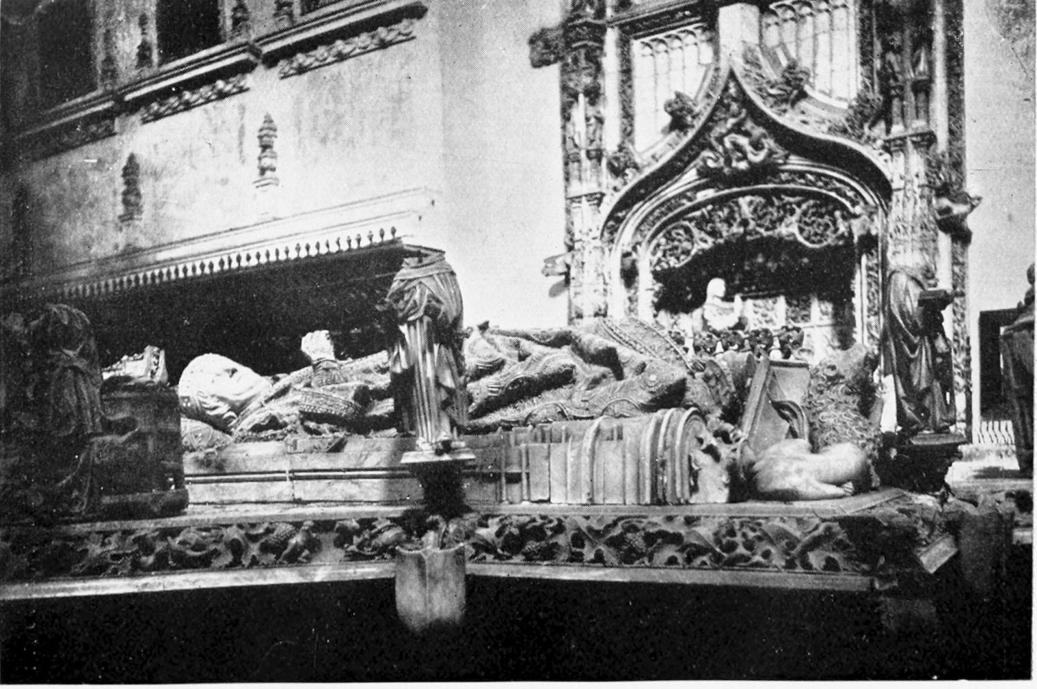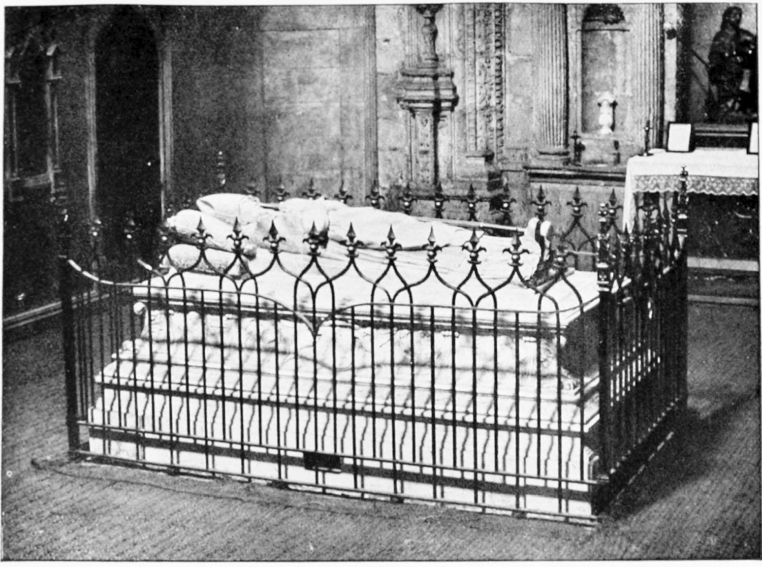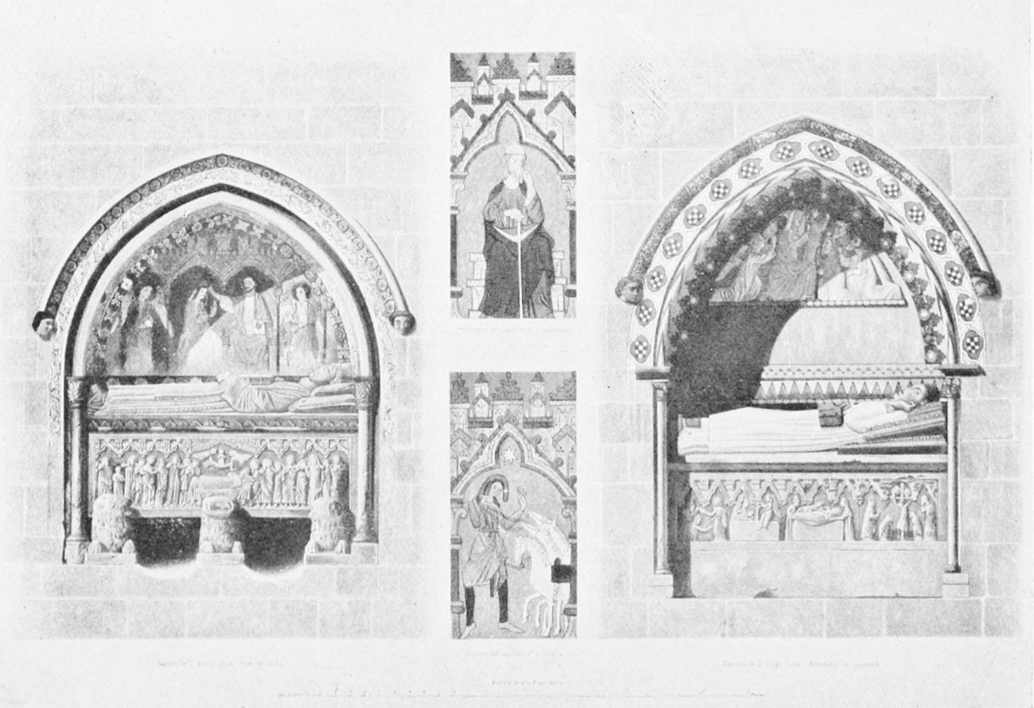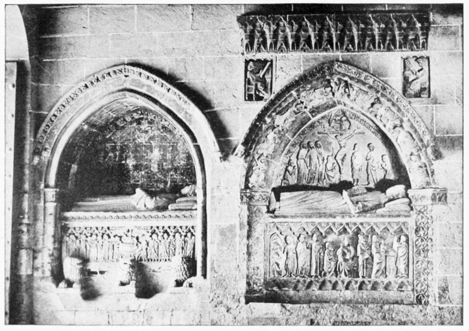 But after the general ensemble and the stained glass, nothing in the cathedral merits as much attention as the tombs and monuments. Of these the noblest is the cenotaph of Ordoño II. at the rear of the High Altar, erected five centuries after his death as a tribute of gratitude by the citizens of Leon. Though in the florid Gothic style of the fifteenth century, many of the figures and inscriptions appear to have been copied from an earlier tomb. The recumbent effigy of the{21} king is large and dignified; his face is sharp and smooth-shaven; he wears his crown and the royal robes, and carries the orb and sceptre. At his feet lies a dog, the emblem of fidelity, beneath which is an inscription in Latin setting forth his deeds and virtues, and erroneously attributing to him the erection of the present temple. The monumental arch above encloses sculpture painted in brilliant colours on a gilt ground, which appears to be of an earlier elate than the rest of the monument. The arches of the wall of the Capilla Mayor have been bricked up, and those on each side of this monument are adorned with two very ancient distemper paintings of the Ecce Homo and Entombment. They exhibit some interesting peculiarities of dress and detail, and though the central figure is badly done, the spectators are lifelike and vigorously represented.