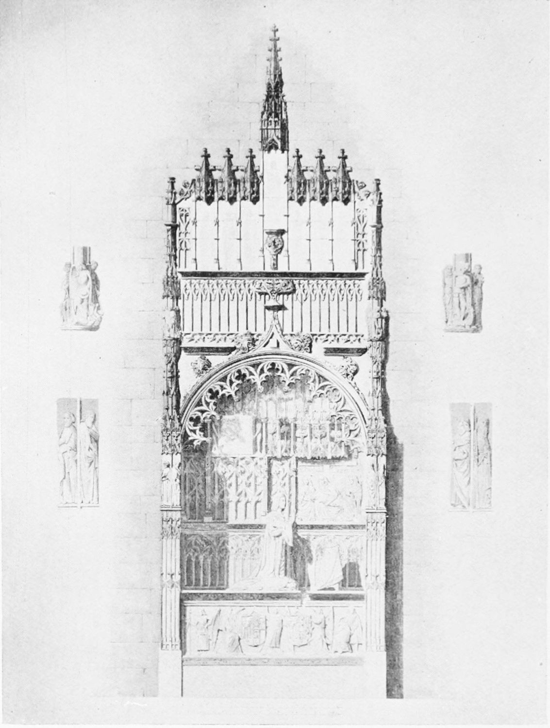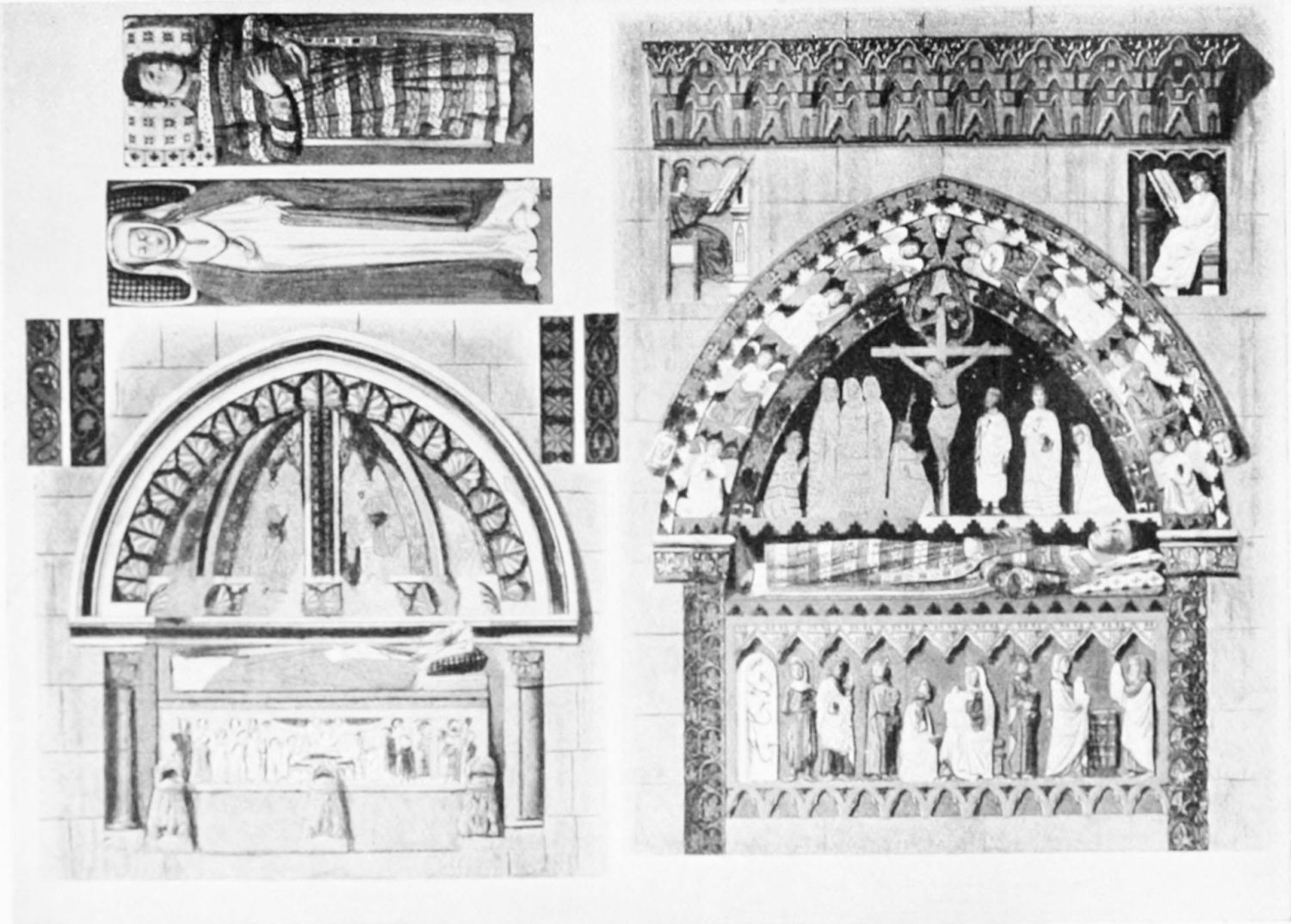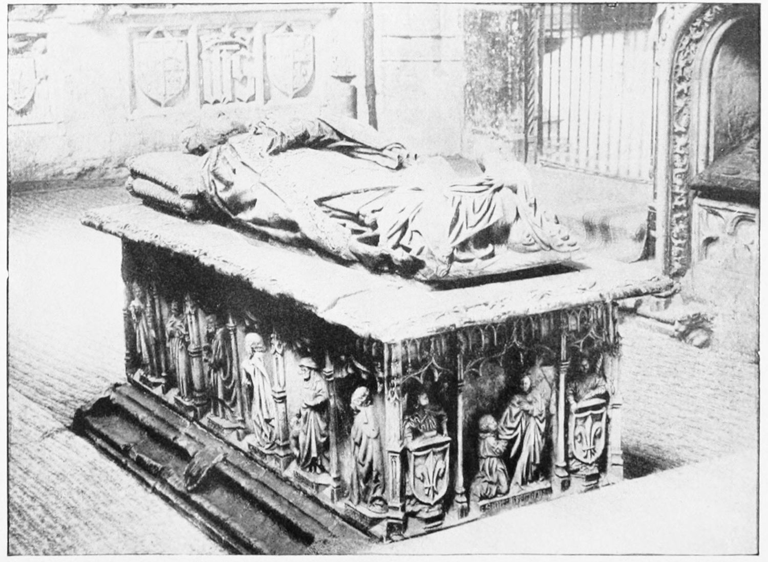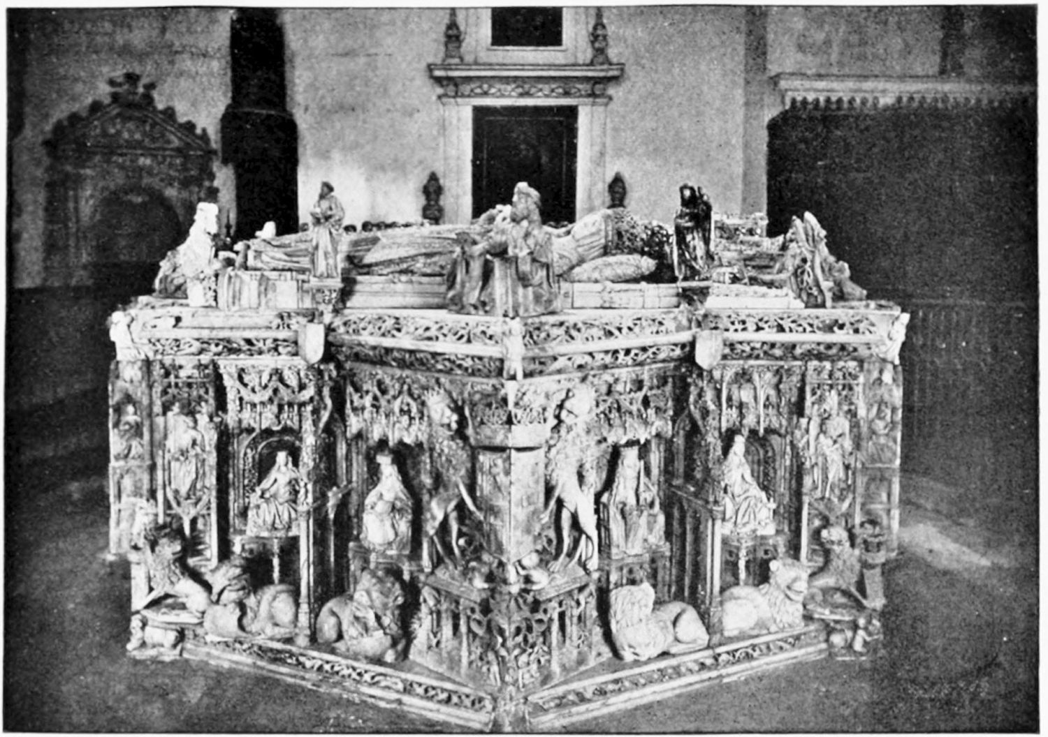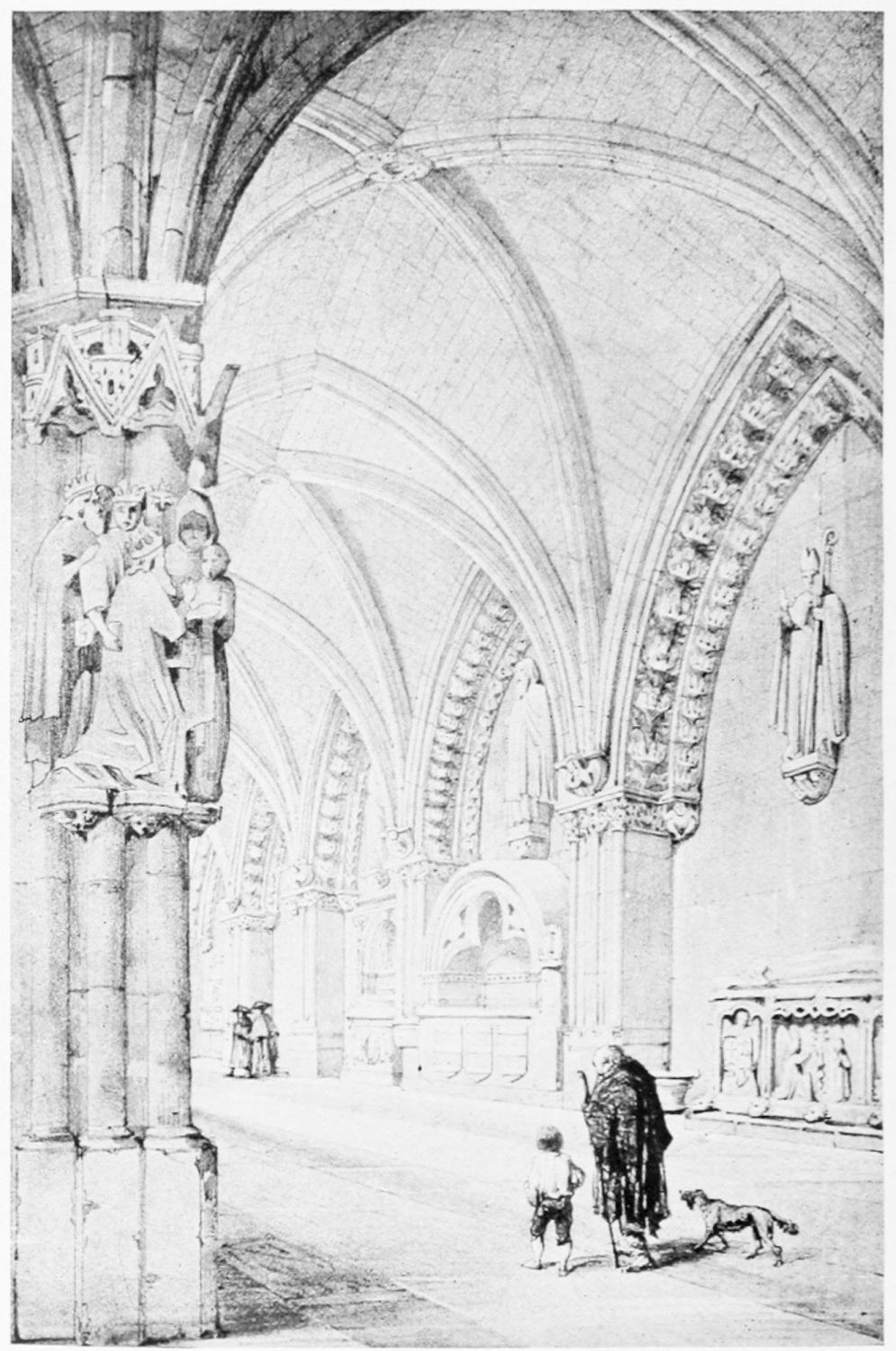 But after the general ensemble and the stained glass, nothing in the cathedral merits as much attention as the tombs and monuments. Of these the noblest is the cenotaph of Ordoño II. at the rear of the High Altar, erected five centuries after his death as a tribute of gratitude by the citizens of Leon. Though in the florid Gothic style of the fifteenth century, many of the figures and inscriptions appear to have been copied from an earlier tomb. The recumbent effigy of the{21} king is large and dignified; his face is sharp and smooth-shaven; he wears his crown and the royal robes, and carries the orb and sceptre. At his feet lies a dog, the emblem of fidelity, beneath which is an inscription in Latin setting forth his deeds and virtues, and erroneously attributing to him the erection of the present temple. The monumental arch above encloses sculpture painted in brilliant colours on a gilt ground, which appears to be of an earlier elate than the rest of the monument. The arches of the wall of the Capilla Mayor have been bricked up, and those on each side of this monument are adorned with two very ancient distemper paintings of the Ecce Homo and Entombment. They exhibit some interesting peculiarities of dress and detail, and though the central figure is badly done, the spectators are lifelike and vigorously represented.