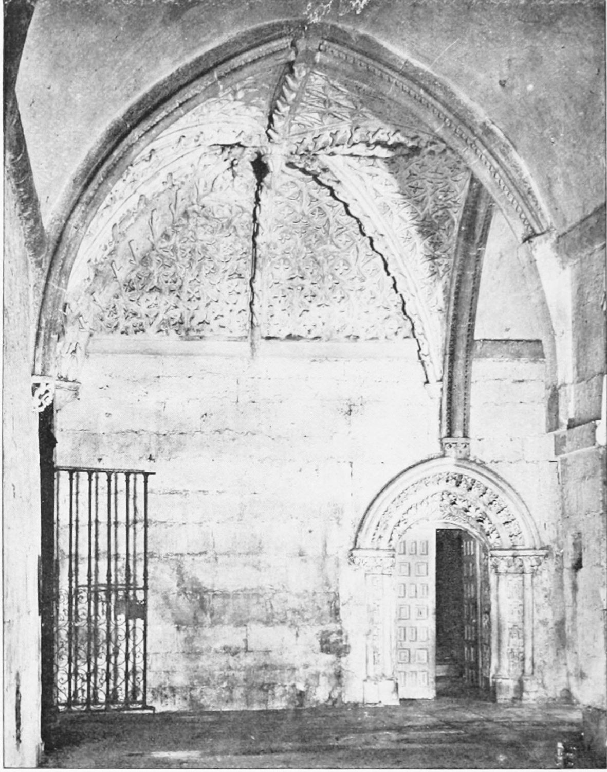 A good deal of building went on in Leon during the sixteenth century. In the Plaza de San Marcelo (before Alfonso XI.’s time, outside the walls) stands the mansion of the illustrious Guzman family, of which Guzman el Bueno, of Tarifa fame, was an illegitimate and the most distinguished member. It was built in the year 1560 by Juan Juiñones y Guzman, Bishop of Calahorra. Its architecture is severe and imposing. Over the main entrance, adjoining a square tower at the corner of the building, are two medallions on which is engraved the motto, ‘Ornanda est dignitas domo—non domo dignitas tota quærenda’—a device which one wishes all the architects of the age had borne in mind. The interior patio is adorned with handsome plateresque reliefs. Next to the Casa Guzman is the residence of the marquesses of Villasinta, in rather similar style. Beneath the sixteenth-century façade of the mansion of the great Luna family was discovered a fine Gothic arch, with{30} another pointed arch supported by columns with Byzantine capitals. This work cannot be later than the thirteenth century. In the patio is a magnificent arch designed with arabesques.