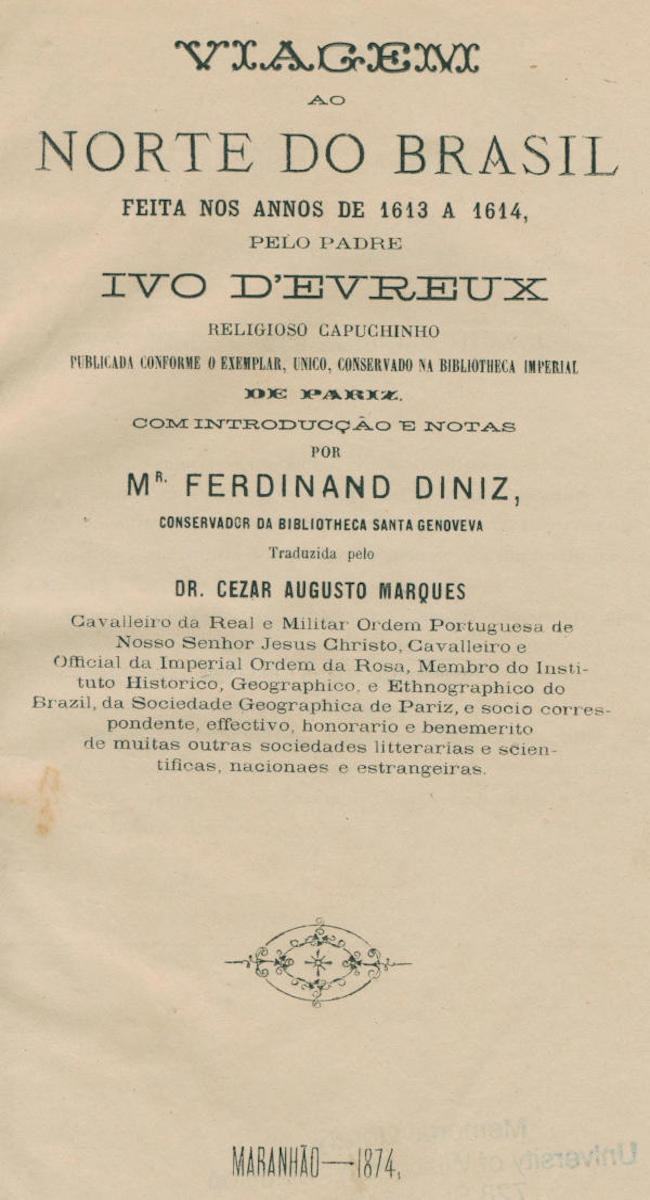 Sem tratar dos armadores de Dieppe, cujas primeiras explorações pelas costas do Maranhão, datam de 1524, sem[ix] mencionar as navegações de Affonso de Xaintongeois até as boccas do Amazonas no anno de 1542, ser-nos-ia facil provar, que 25 annos mais tarde Henrique IV doara a um bravo capitão da religião reformada a immensa extensão de territorio, para a qual devia ir Ivo d’Evreux, sahindo do seu pacifico retiro de Montfort, afim de cathequisar os selvagens.