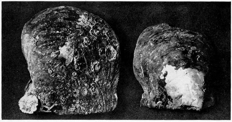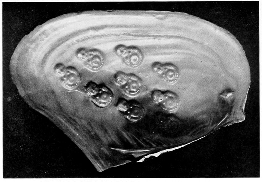 | Shells from Venezuela with attached pearls. Exterior view of same. X-ray photograph of shell, printed through exterior of shell and showing encysted pearls | 39 |