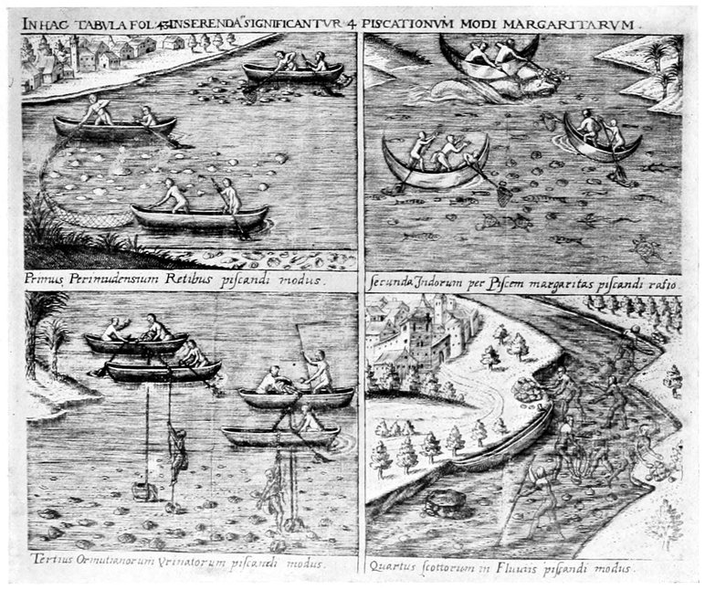 | Old print showing four methods of catching pearl-bearing mollusks | 160 |