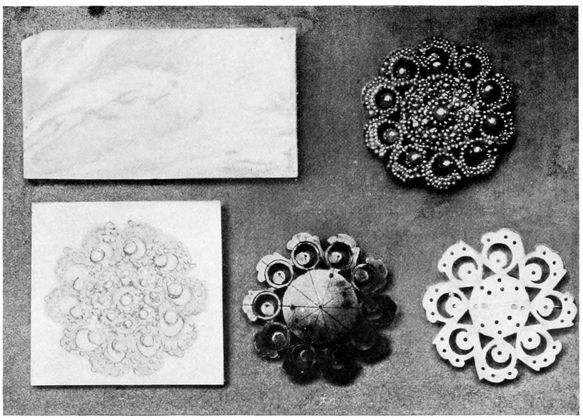 | Cross section of an irregular pearl, magnified 80 diameters. Cross sections of pearls, magnified 30 diameters. Thin section of mother-of-pearl, magnified, showing sponge borings which traversed the pearl shell. Structure of conch pearl produced by fracturing, magnified 80 diameters | 53 |